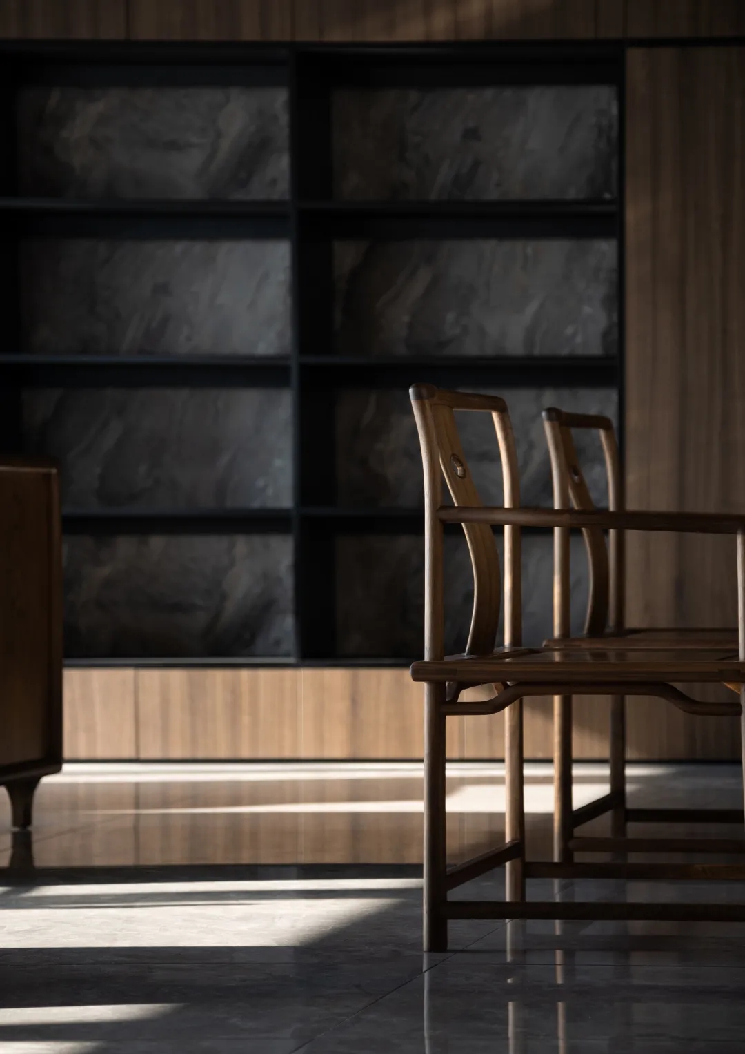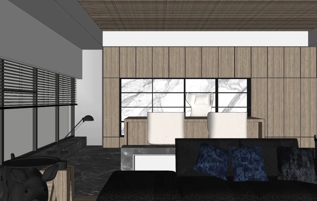 背景墙与天花板采用了金属不锈钢去进行设计语言的表现。美观、舒适、健康的室内环境可以帮助人们提高工作质量和生活水平,木质材料无疑在其中扮演了重要角色,复古的颜色与现代格调融合,赋予了一种全新的美感。