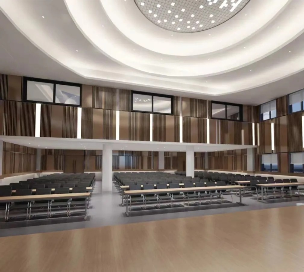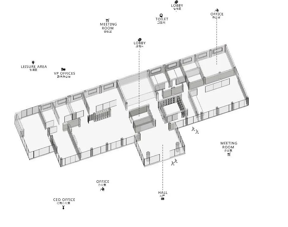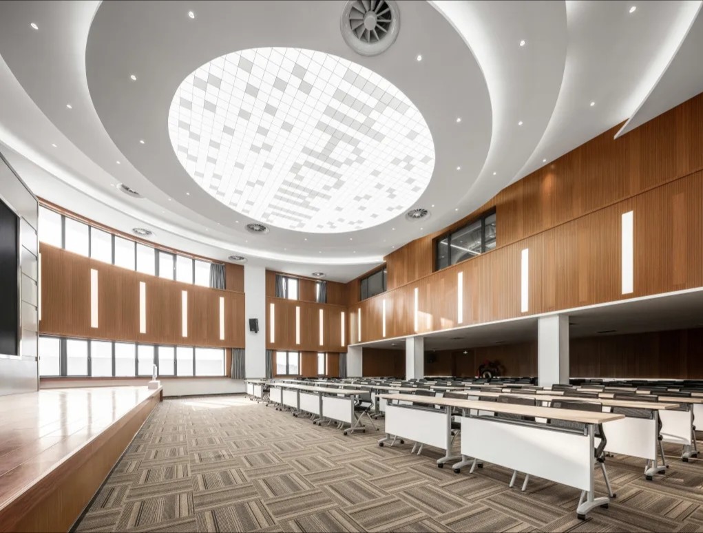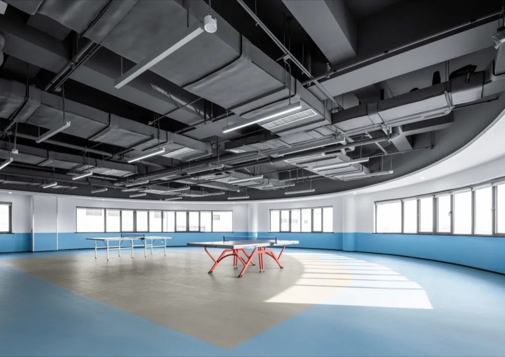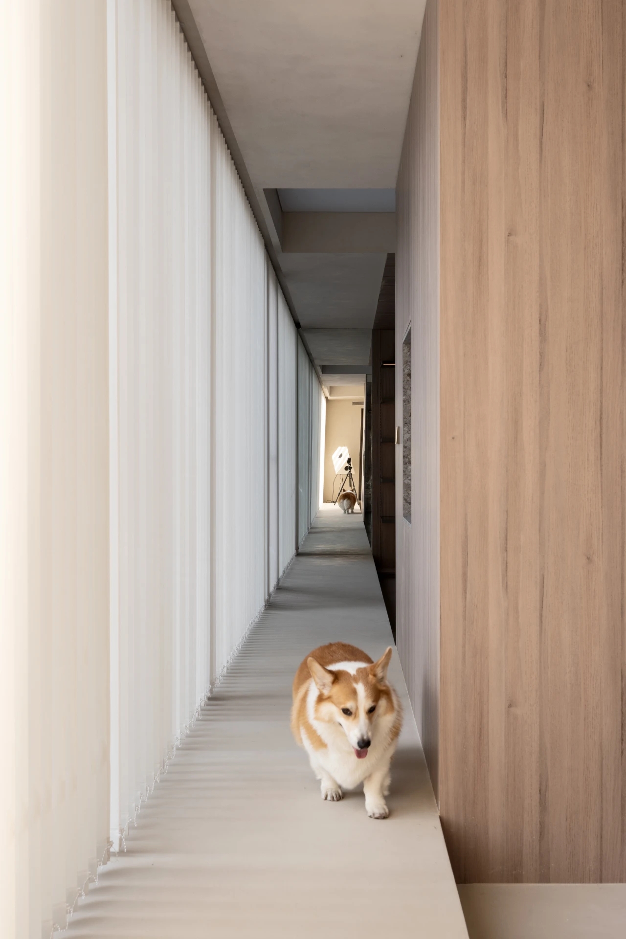 过道顶棚利用原始梁的高差形成了连续体量,靠软膜天花造就明暗的交替。虚实之间的秩序强化了行走在过道上的仪式感。