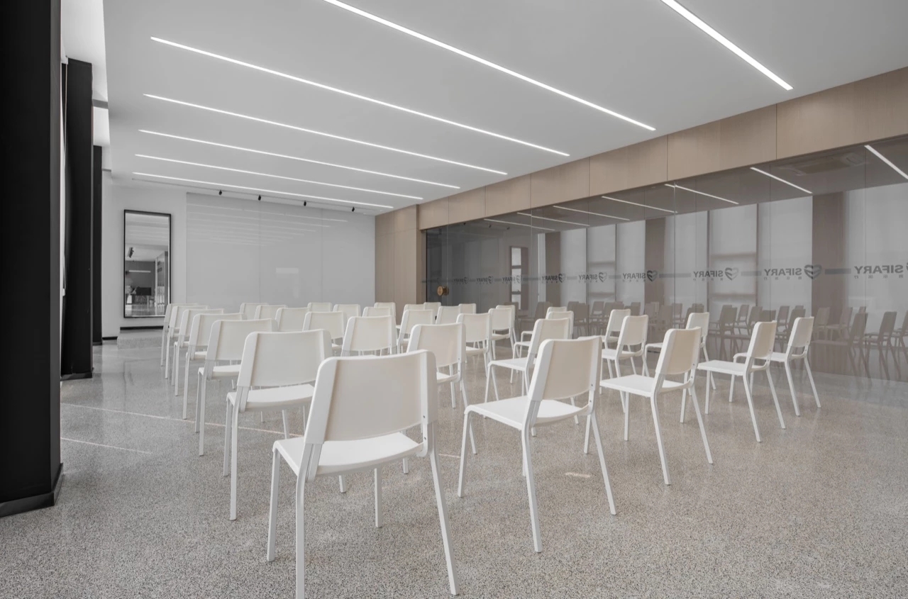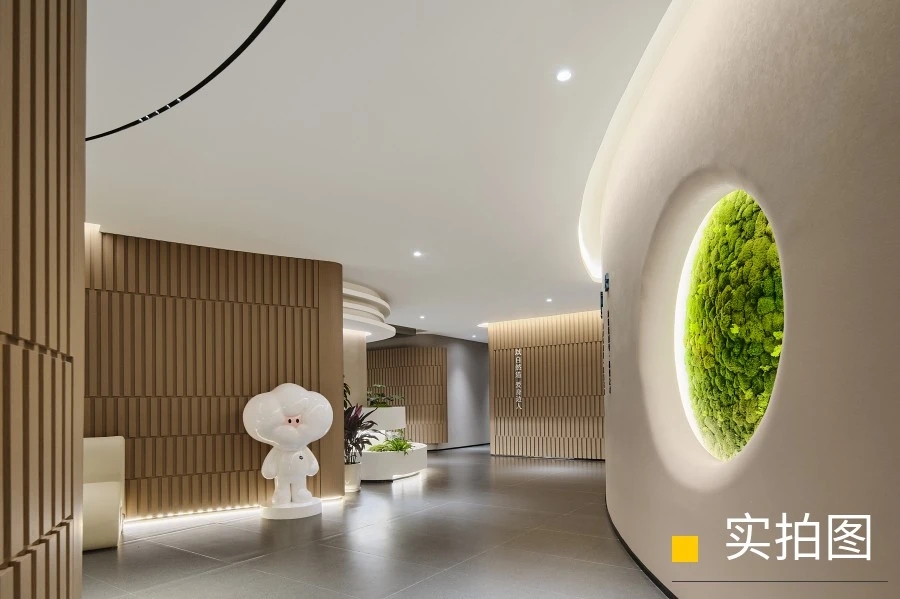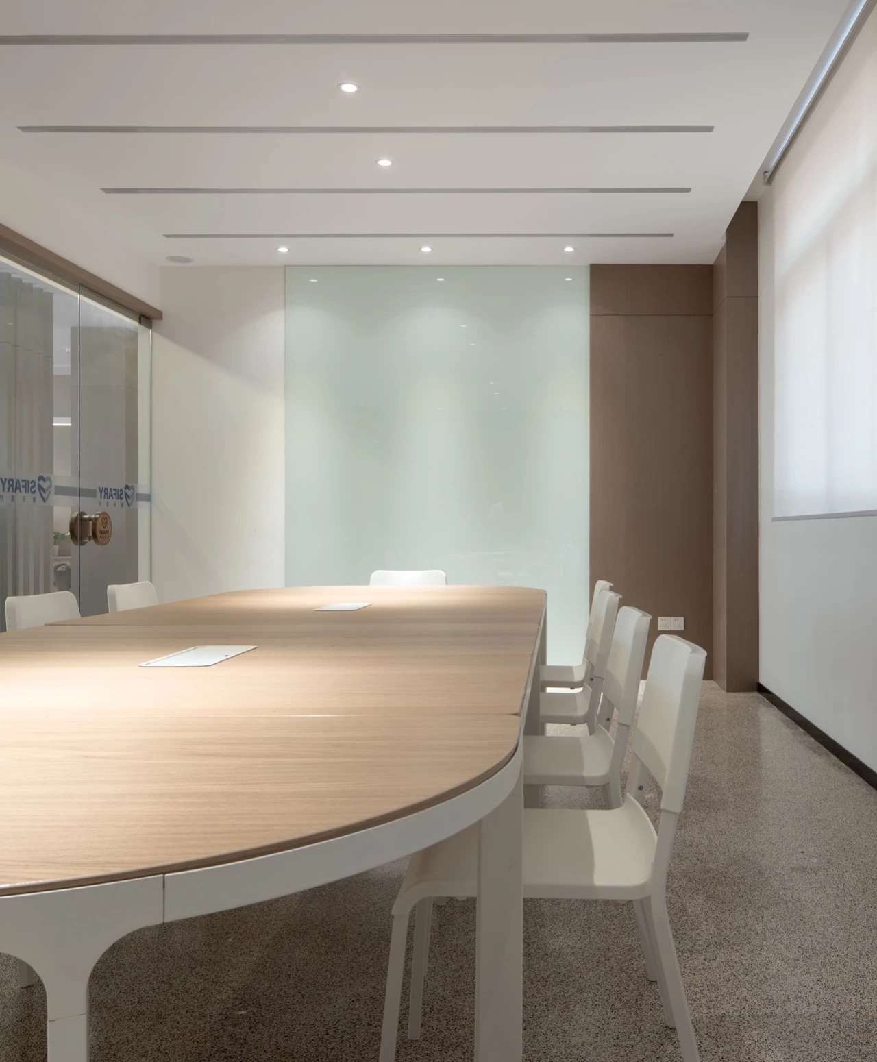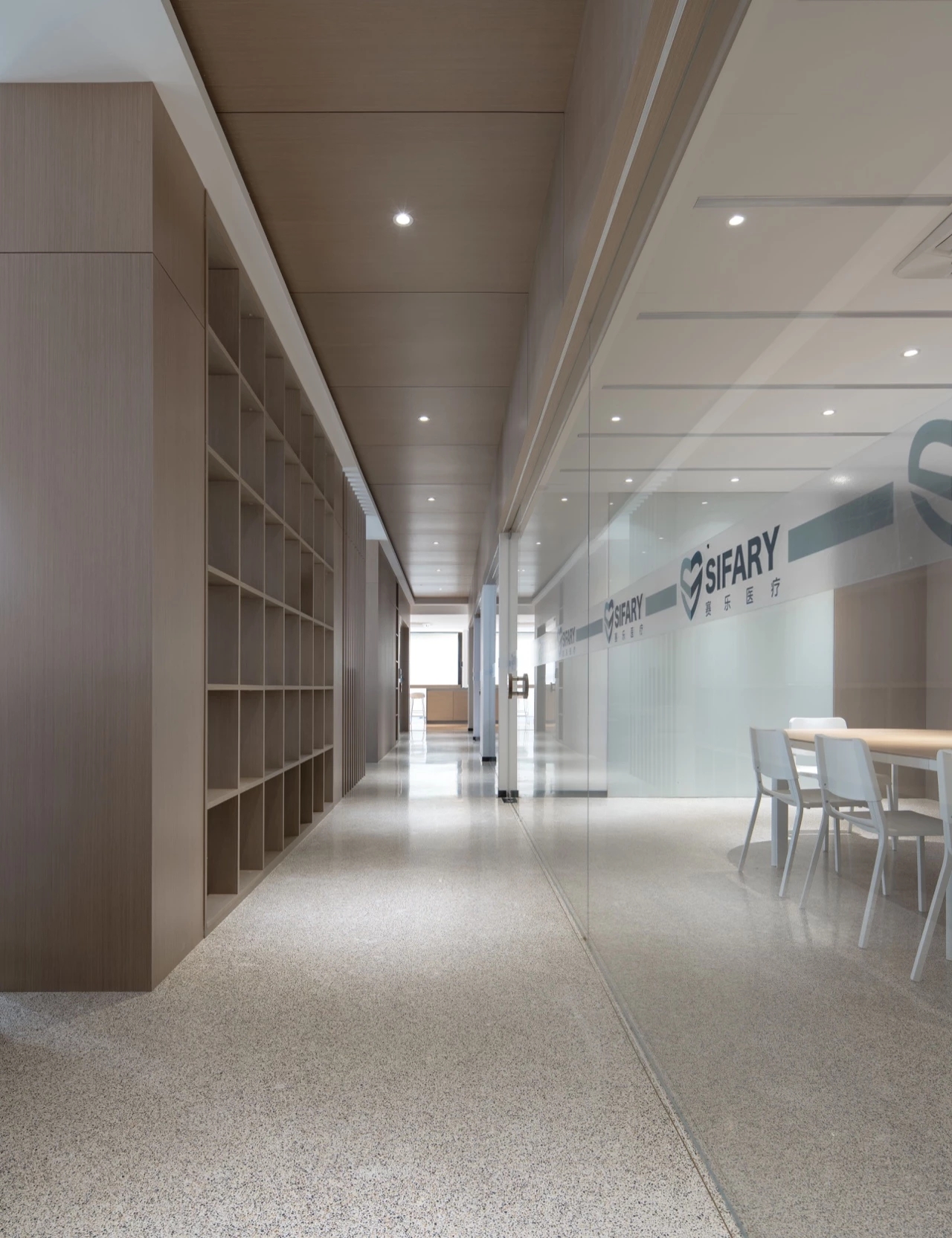 柔和纯净的空间,坚持使用大面积木饰面,并贯穿始终,除此之外,根据不同的位置,采用玻璃等元素进行配搭,丰富视觉层次,同时保证空间的通透性,使得空间更加明亮,通透,柔和。并且采用均匀照射和漫反射光源,避免直线光射。设计团队希望打造一个没有边界,没有聚焦的场所,让空间无限延展下去,室内外慢慢融合起来,给使用者一个舒适的环境!