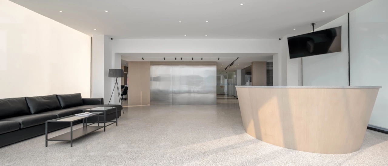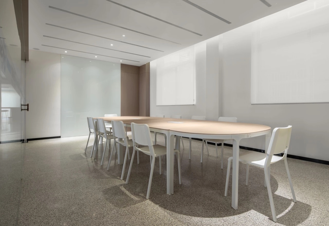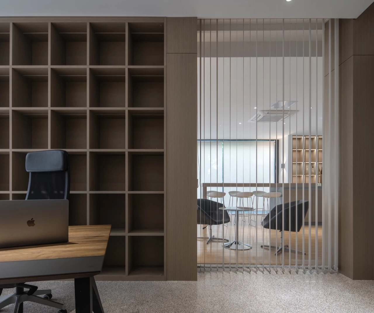 150㎡的办公场所让“小中见大”成为了设计的核心议题,除去会议、物料及卫生间的实墙之外,所有区域划分及界定全部采用虚实结合的定制柜体来完成兼收纳功能的隔断,保证区域之间的相对私密又能保持视觉在空间中的延伸。