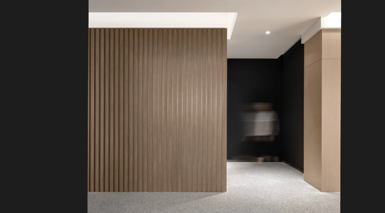 位于空间西侧的落地玻璃配合竖向百叶帘形成的光影序列成为会客厅的焦点,与水吧立面的格栅物理结构两者相互渗透获得更深刻的秩序体验。