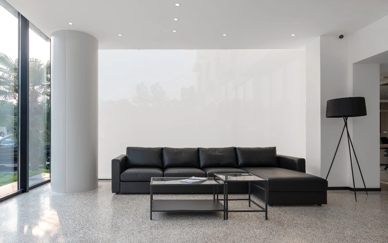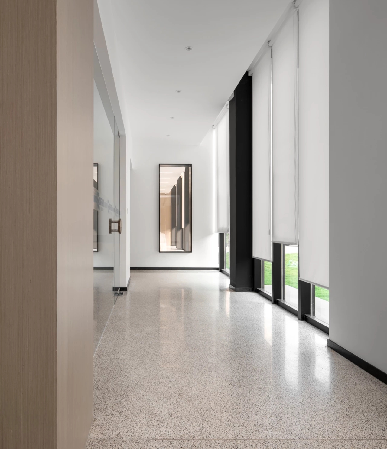 南侧入口玄关处是地台步道,步道尽头的镜面随着参观者步行深入过程中发现这无尽走廊的“小秘密”,辅以落地窗的光影序列,理性之美油然而生。