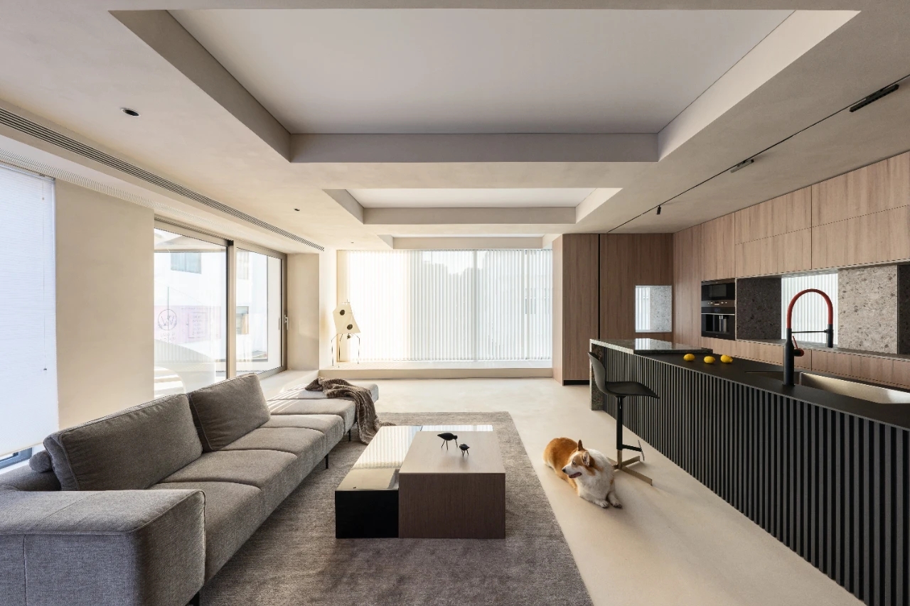 南侧立面的四扇固定玻璃呼应着软膜天花的序列,加上柜体,以及空间中所有的方形序列,虚实变化、大小不一的盒子体块却让空间的设计语言高度统一。