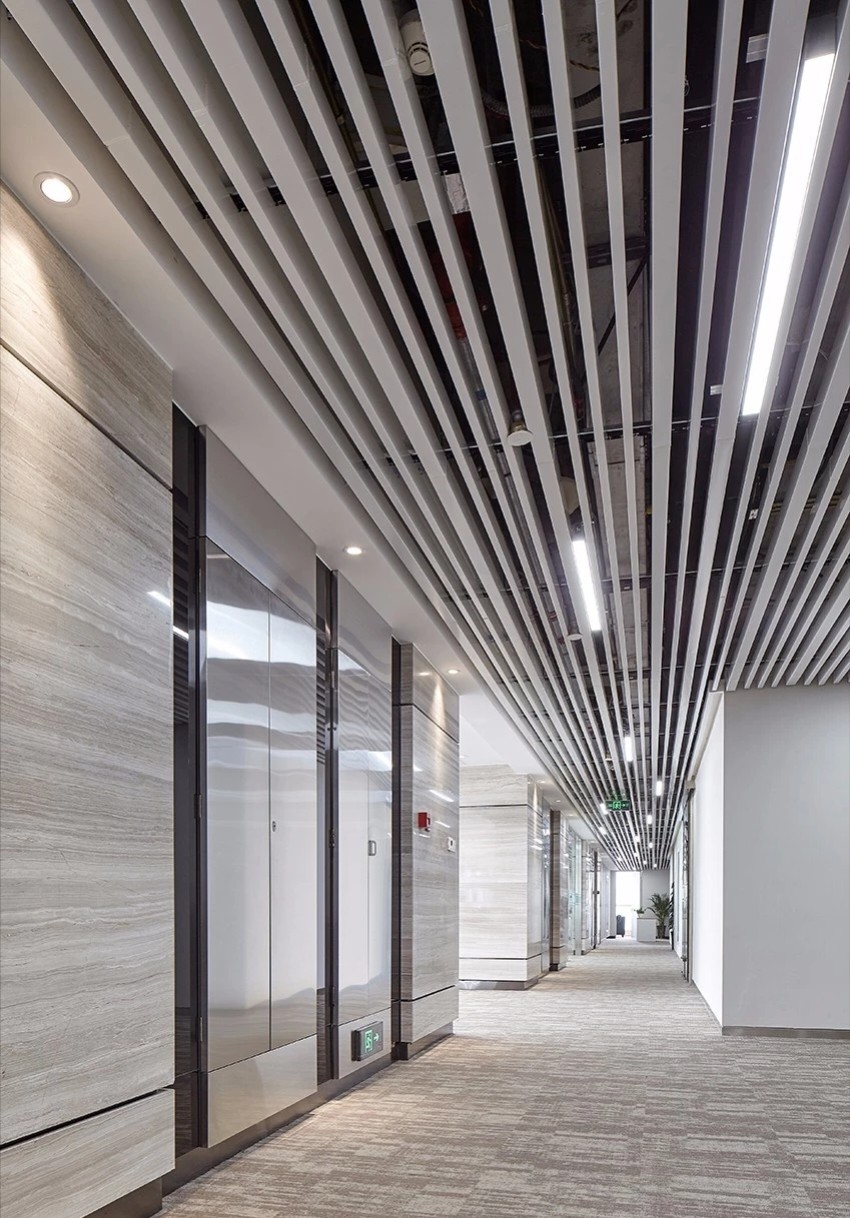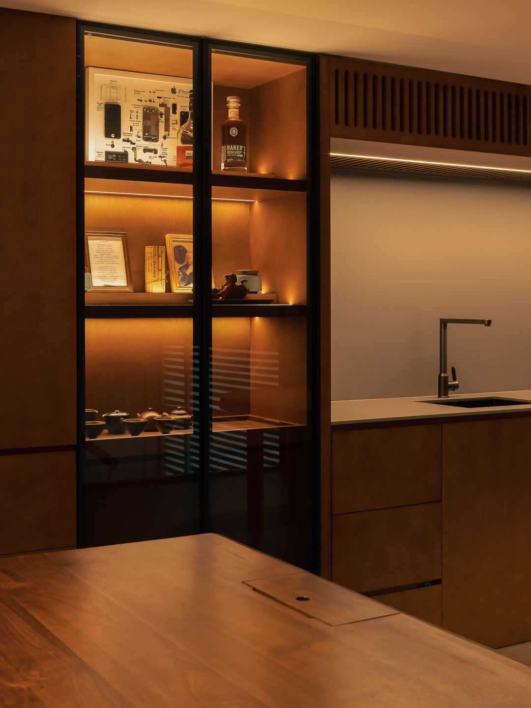 金属的质感与木质的温润,极端的材质对比,极高的精度和尺寸性表达,让极简风格的延续相得益彰。三角几何更是如拉绳般纤细却展现极致的力感支撑空间,是艺术与技术的统一,更是极简下自洽的空间美感。白色界面上映射出栅格般的等分线条排列纹理,是光带给空间的惊喜。