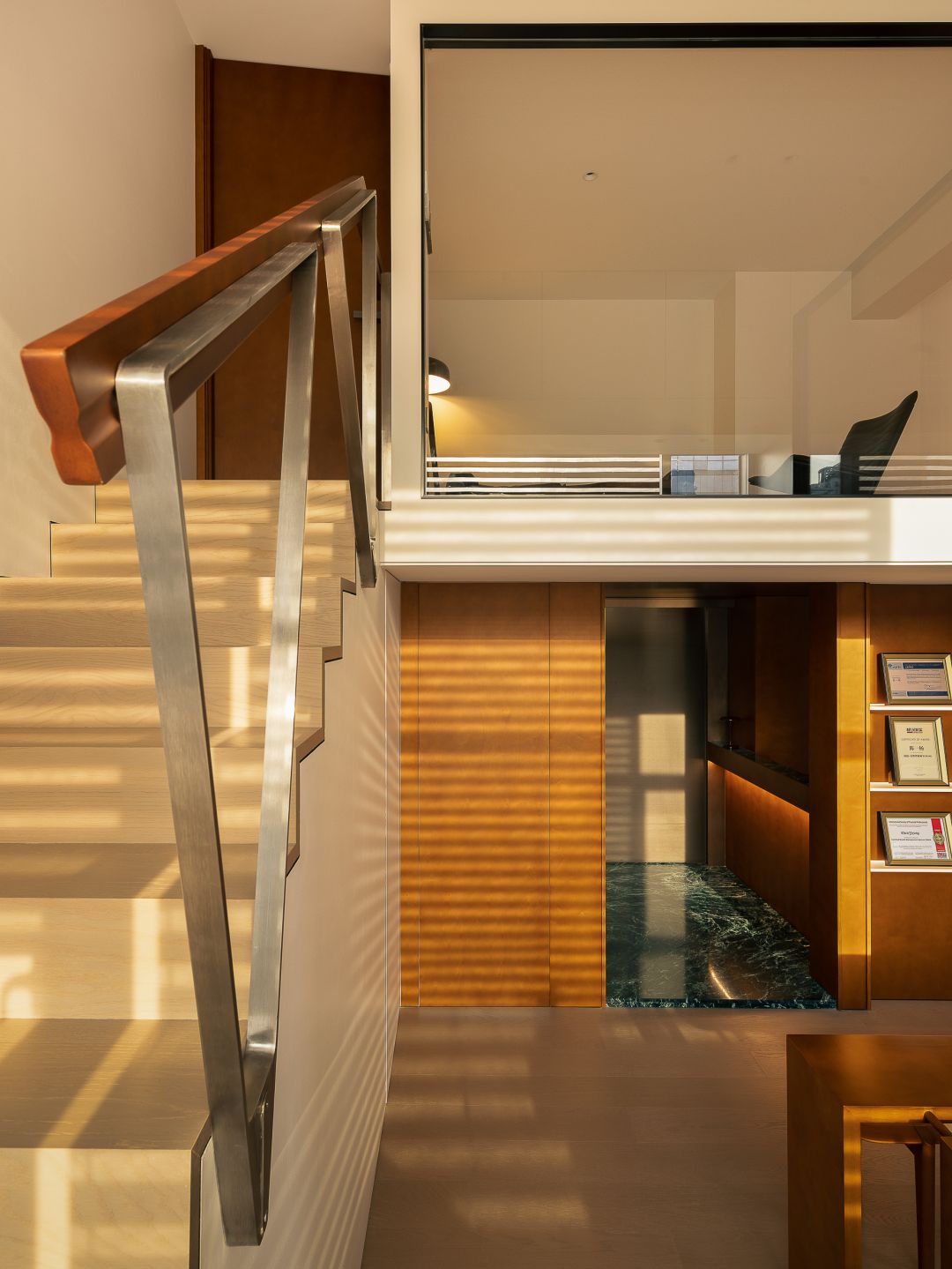 立面的简约特征体现功能的真实表现,暴露下的几何构图,纤细锐利的三角线型取代了传统扶手的柔和曲线,展现纯粹几何关系下的静态美感。设计以稳固的三角几何关系承接上下空间的转折,圆角元素柔化金属材质的冷硬与三角的尖锐感。