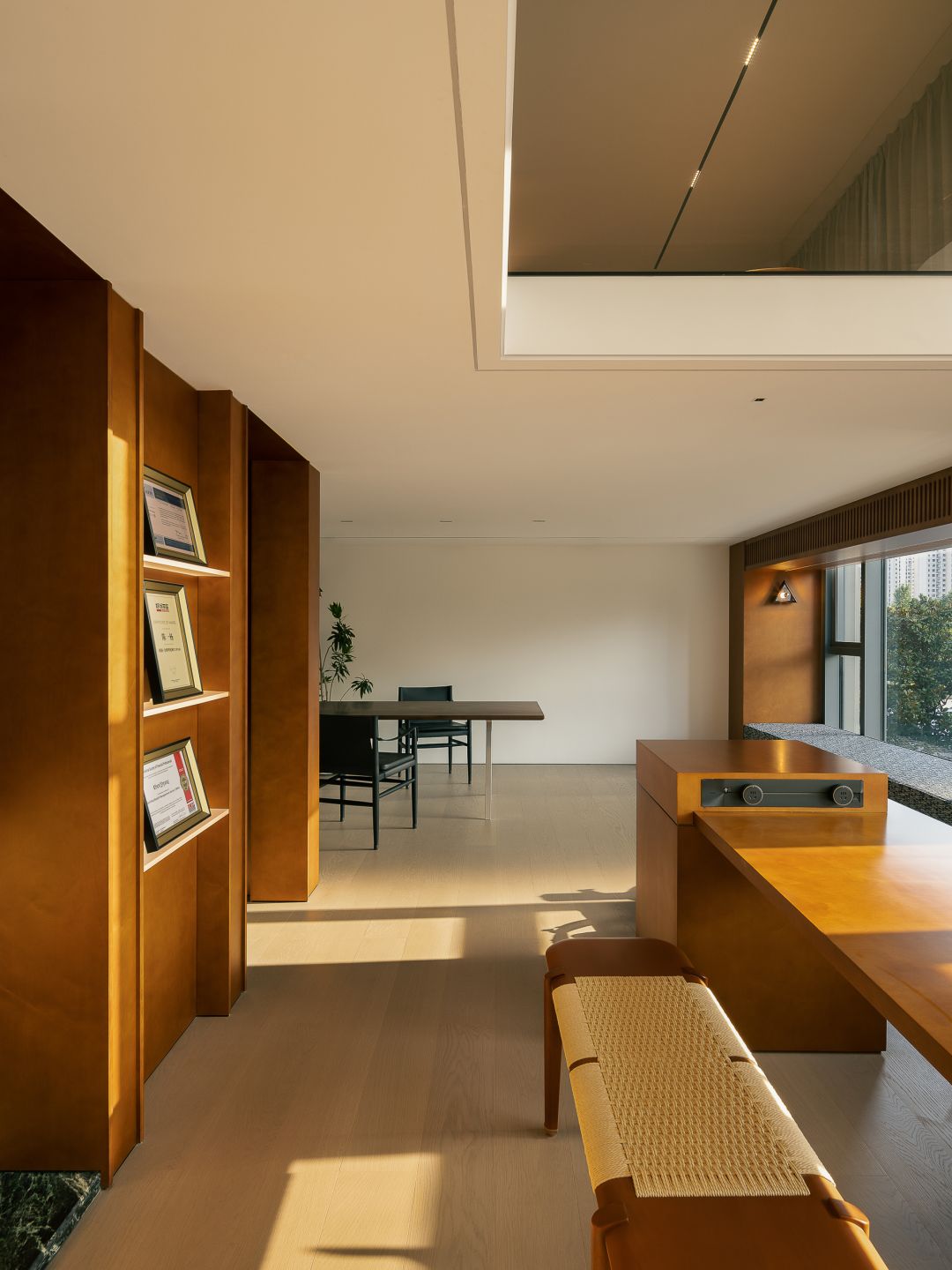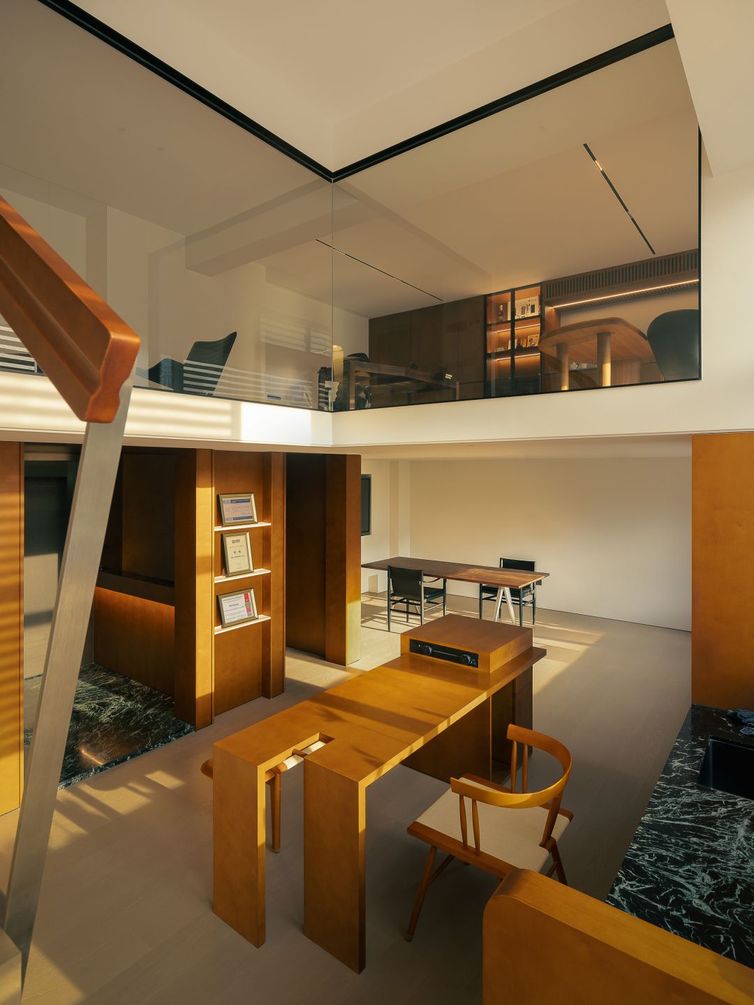 一半的空间让给流动的光,记录着时光的流逝。扶梯而上,纯净通透的夹层无遮挡的被展现,时尚的艺术氛围跃然而出。