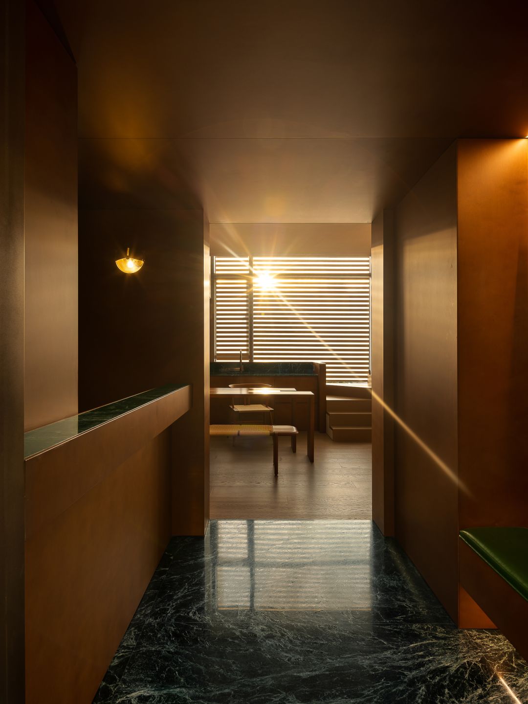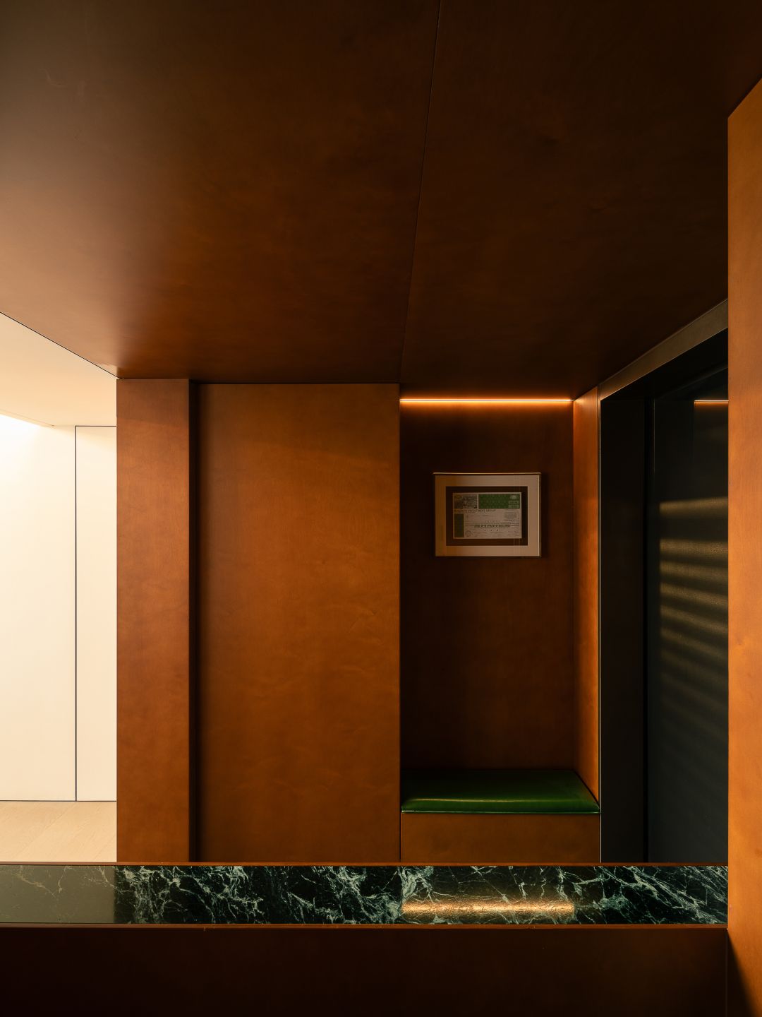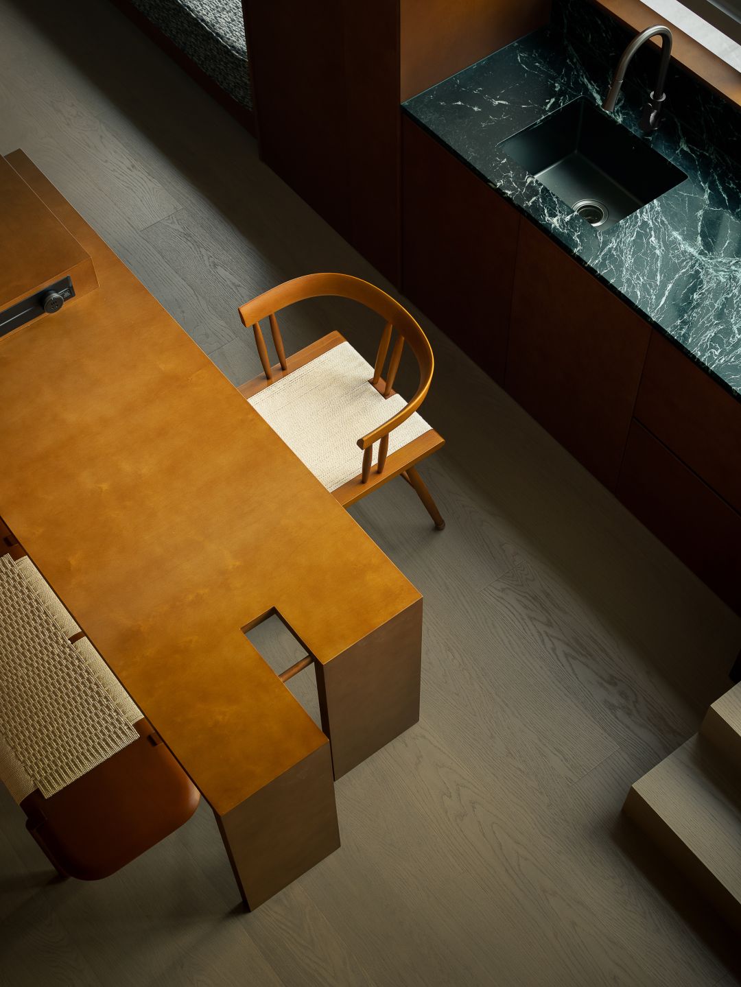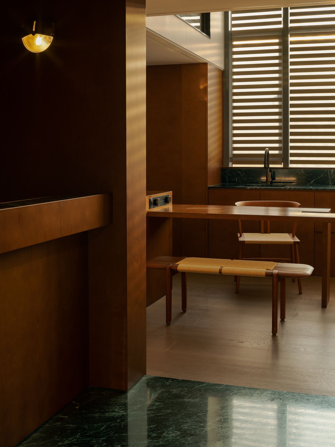 空间内的运力、用色、明暗蕴涵着德式美学下的庄重与饱满。设计以暖阳为调,结合“晨”阳的意蕴,饰面铺陈出复古而学院派的风味,如可可般浓郁醇厚,彰显经典永恒。