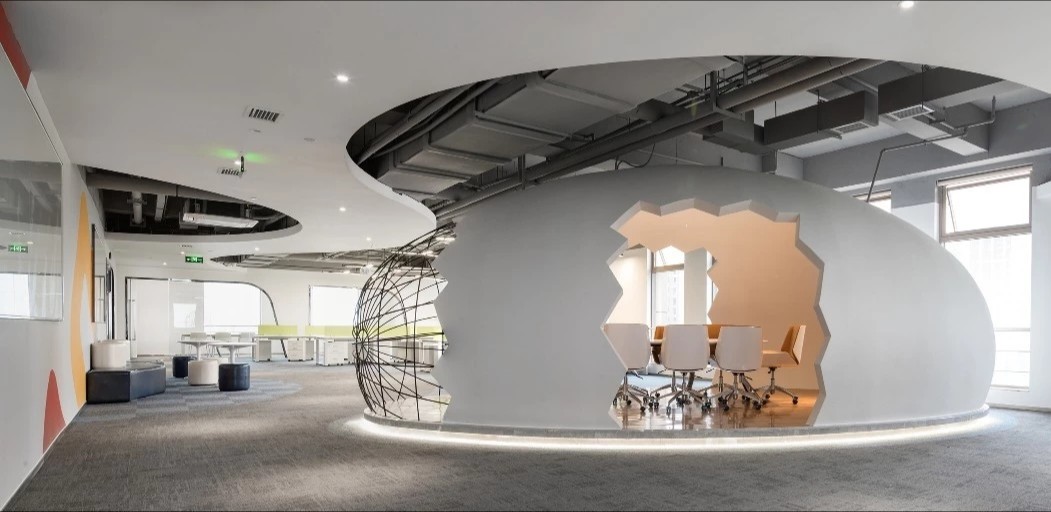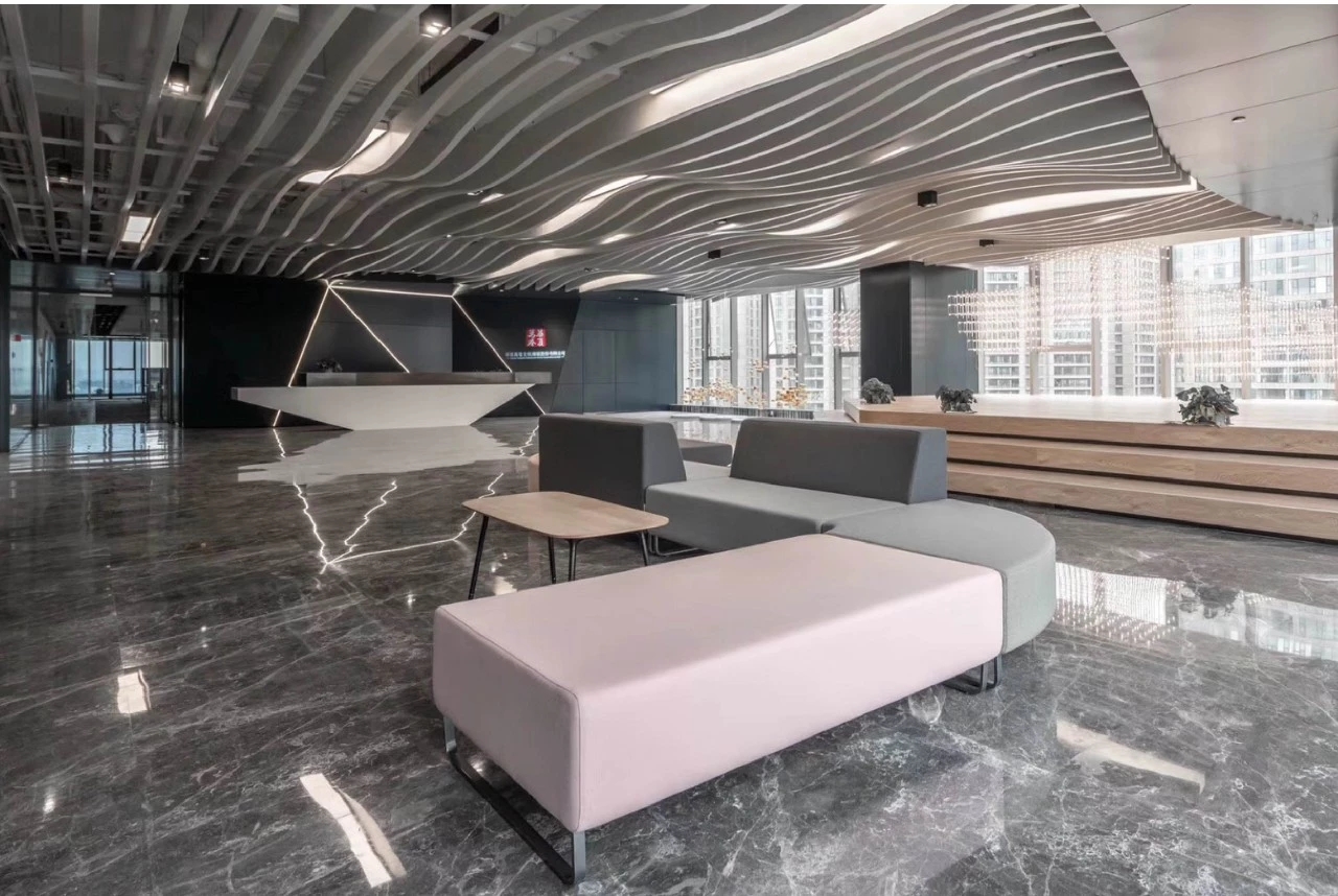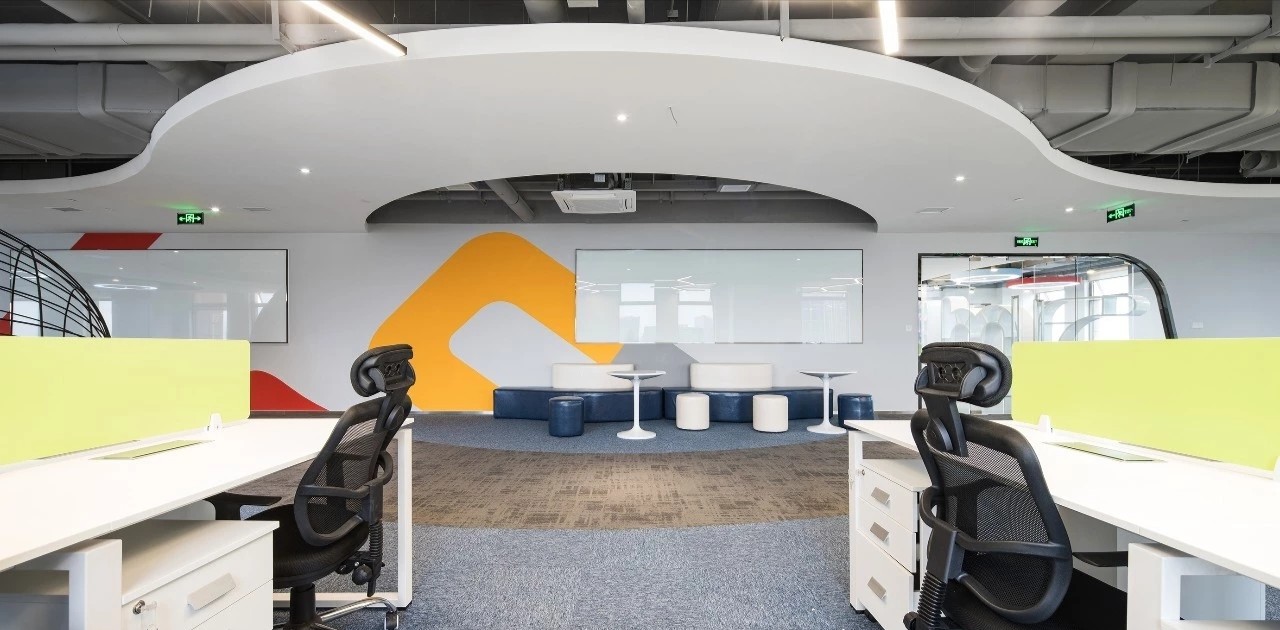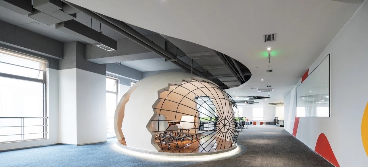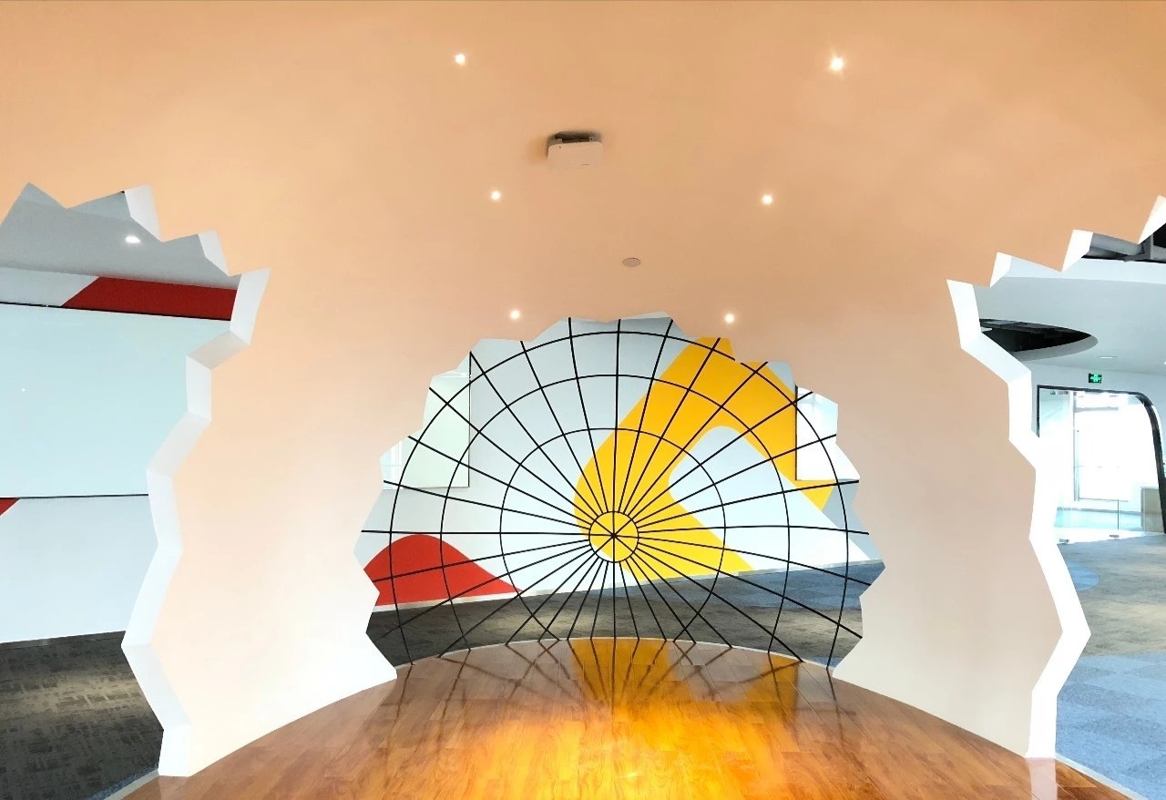 在前厅的设计中,设计师以”山海经“为背景,波澜起伏的白色铝天花好似浮云,墙面藏蓝色折面铝板就像巍峨的山峦,前台恰似一帆孤舟,城楼灯、玉石投影装置的点缀都恰到好处,以现代手法演绎着中国文化的意境。海沃氏家具与办公空间中的中国元素融为一体,茶水间、健身房、台球室、办公室等空间通过不同的家具色彩进行区分和互联,整体氛围轻快而充满着活力。