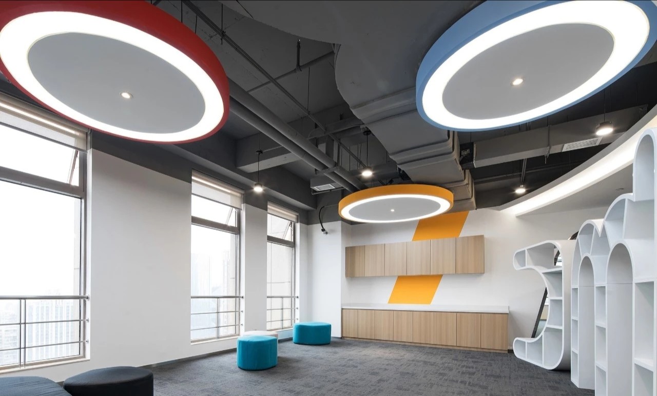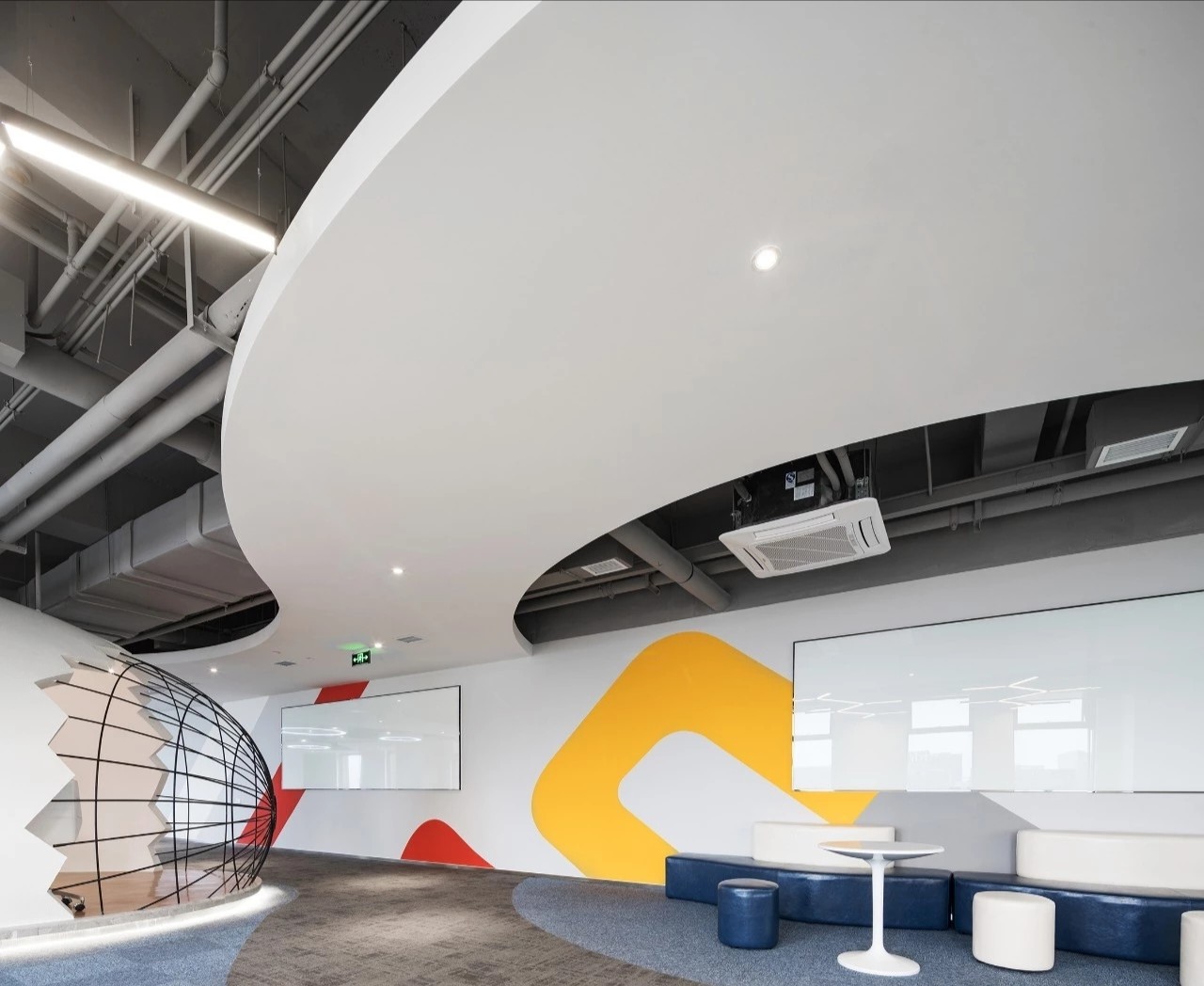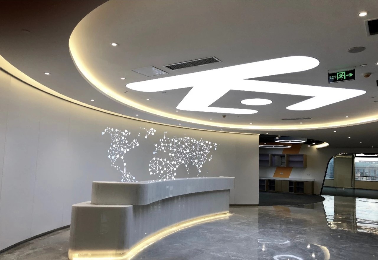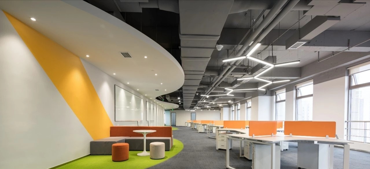 在前厅的设计中,设计师以”山海经“为背景,波澜起伏的白色铝天花好似浮云,墙面藏蓝色折面铝板就像巍峨的山峦,前台恰似一帆孤舟,城楼灯、玉石投影装置的点缀都恰到好处,以现代手法演绎着中国文化的意境。海沃氏家具与办公空间中的中国元素融为一体,茶水间、健身房、台球室、办公室等空间通过不同的家具色彩进行区分和互联,整体氛围轻快而充满着活力。