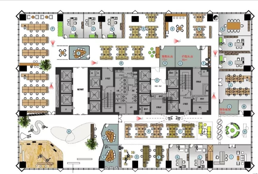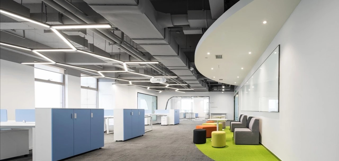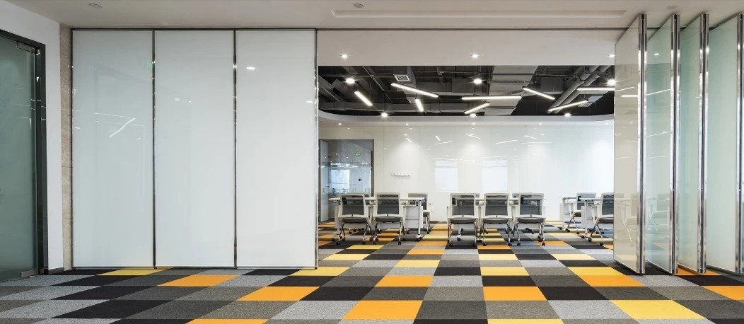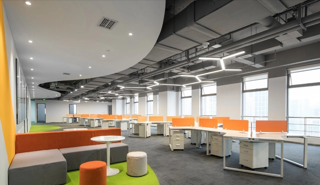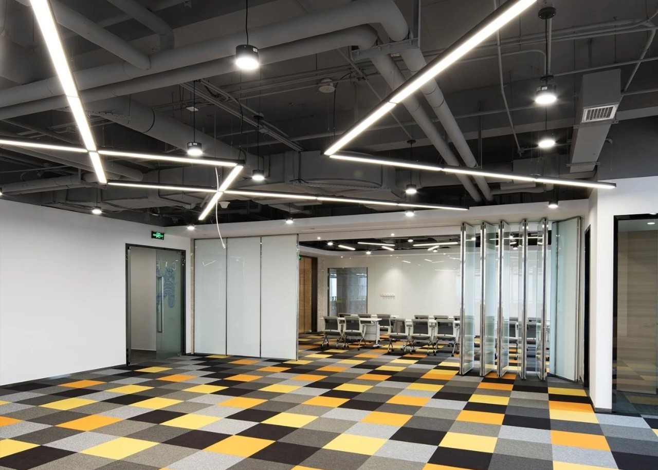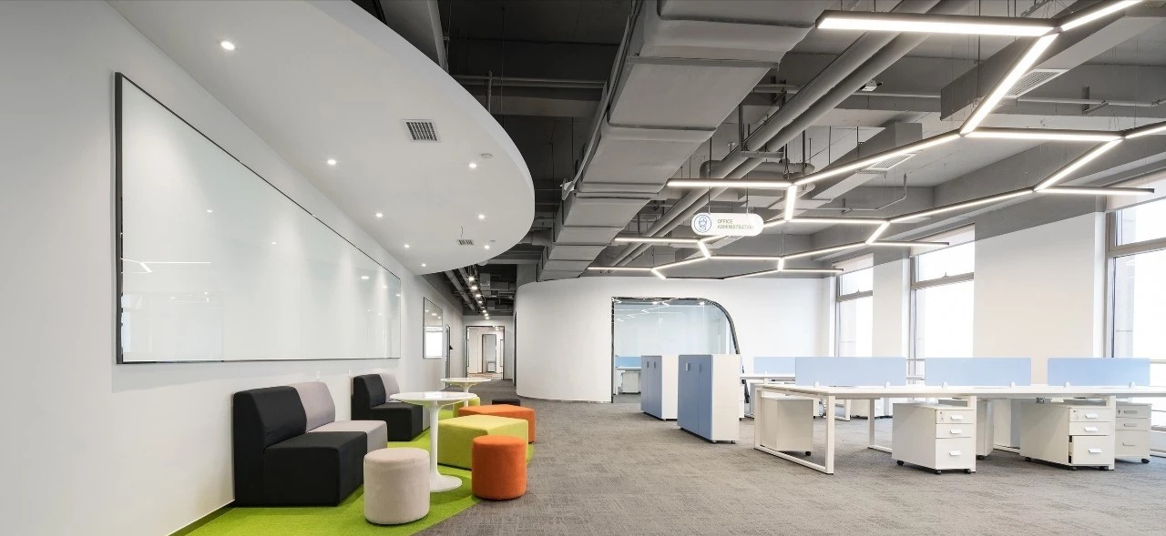 在前厅的设计中,设计师以”山海经“为背景,波澜起伏的白色铝天花好似浮云,墙面藏蓝色折面铝板就像巍峨的山峦,前台恰似一帆孤舟,城楼灯、玉石投影装置的点缀都恰到好处,以现代手法演绎着中国文化的意境。海沃氏家具与办公空间中的中国元素融为一体,茶水间、健身房、台球室、办公室等空间通过不同的家具色彩进行区分和互联,整体氛围轻快而充满着活力。
