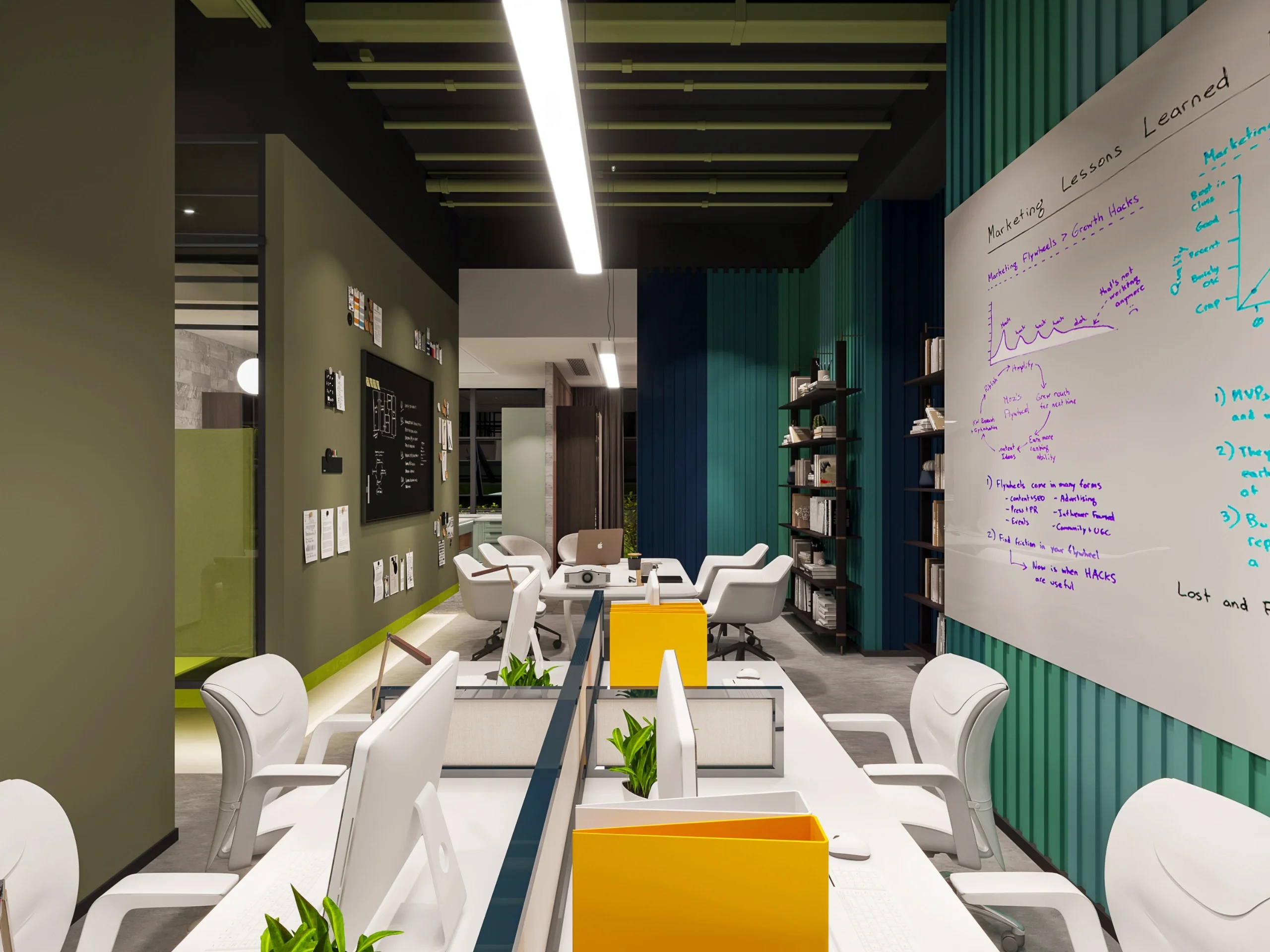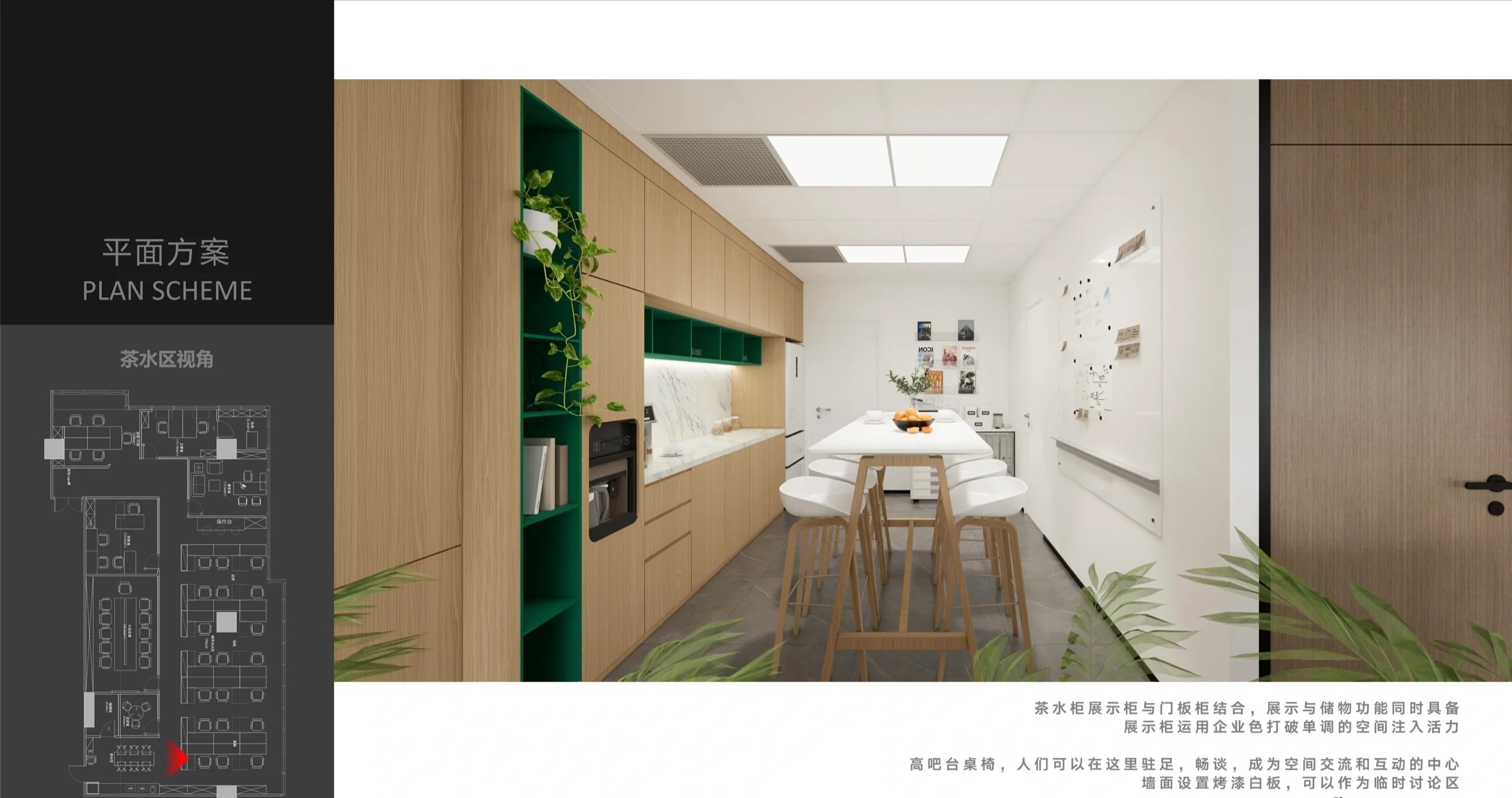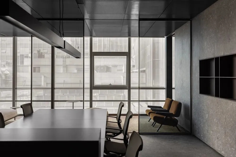 最大的开间留给了开放办公区,在原有结构下顺势而为,一道可开合的滑轨玻璃门区分了办公空间和讨论区,一来用以在功能上满足不同场景的办公需求,其次用以缓解临窗工位易受外部影响的问题。