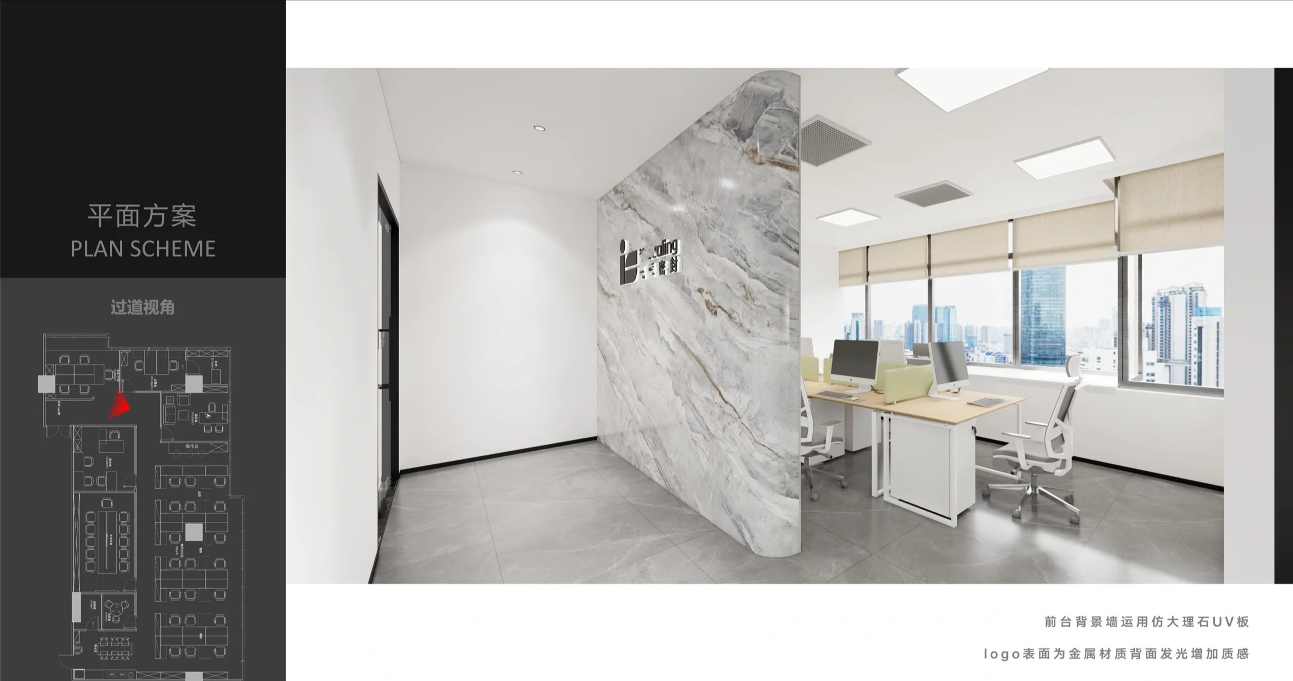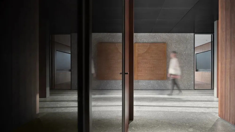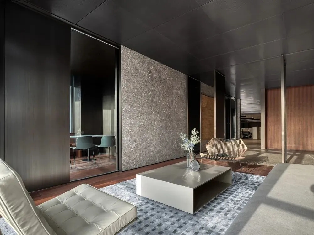 为平衡现代建筑中大量的玻璃、钢结构和大理石的冰冷,接待区在材质策略上达成了米兰灰&胡桃木的组合,材料独特的纹理对比强调了人在木盒子中的体验,设计师希望让人进入场所后能第一时间唤起记忆中对天然木的依赖与留恋,这与永昌恒辉公司的待客之道不谋而合。