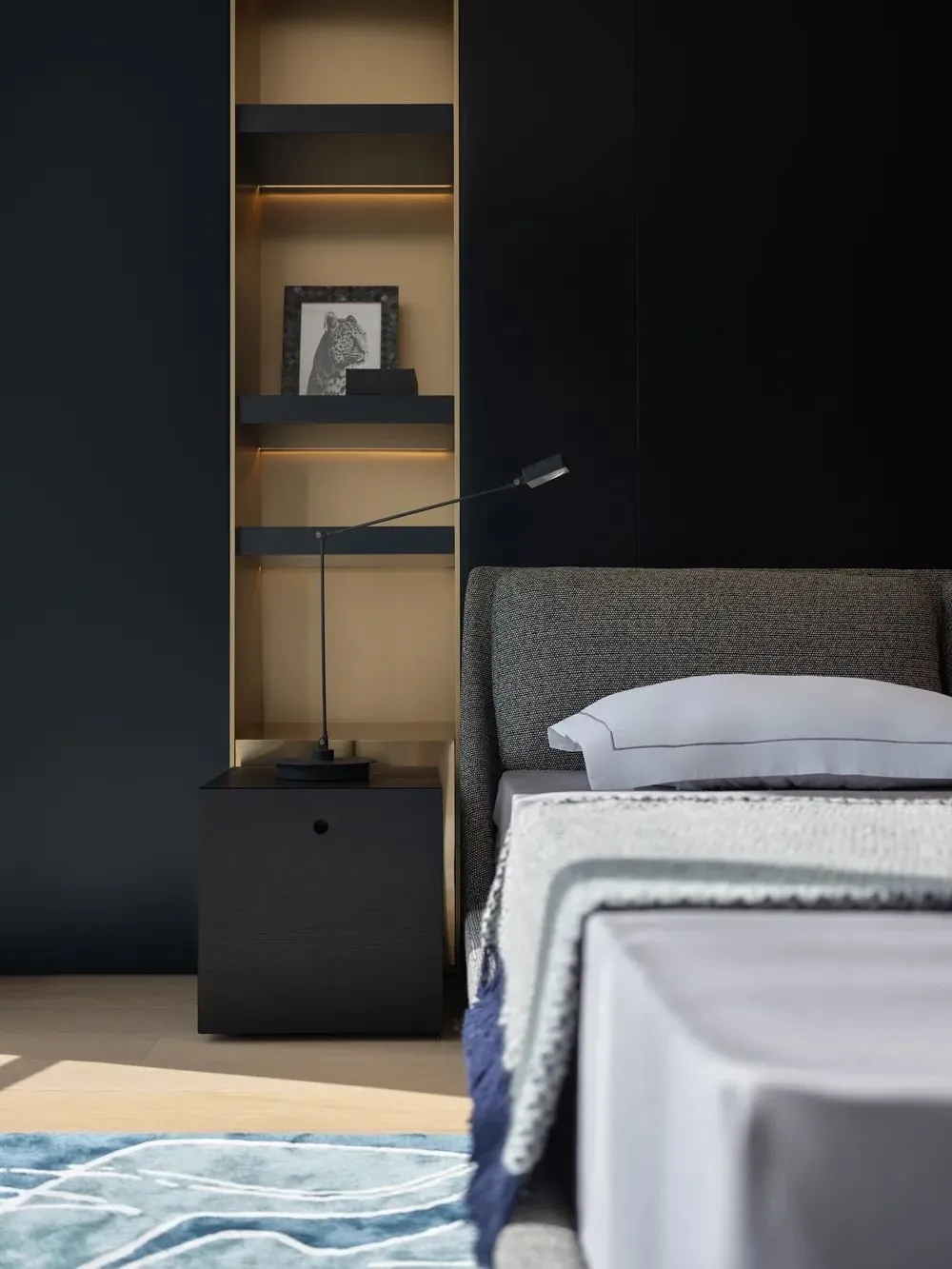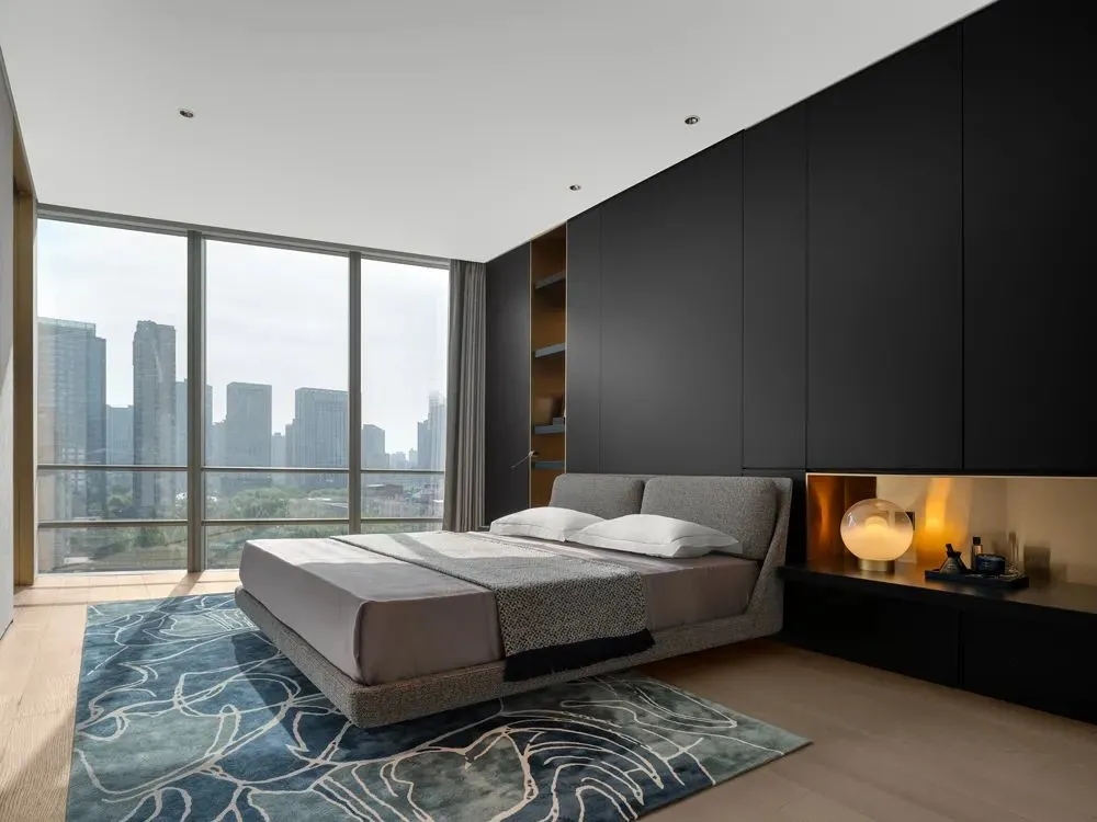 业主的私人公寓延续了办公空间精致、简约的设计语言。屏风、玄关柜、开放式西厨彼此相连又互不打扰,起居室与书写区由同一面背景墙界定。主卧室位于最私密的位置,烤漆板与手工地毯形成了有趣的对比,配合隐藏在平面、立面中的尺度和比例呈现了一个舒适的空间。