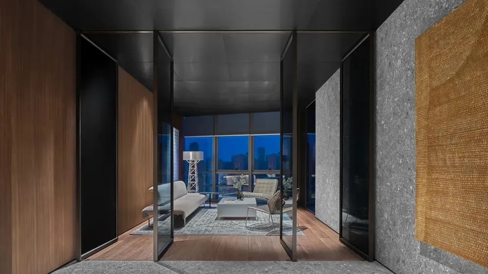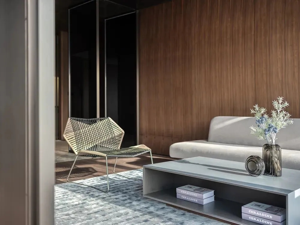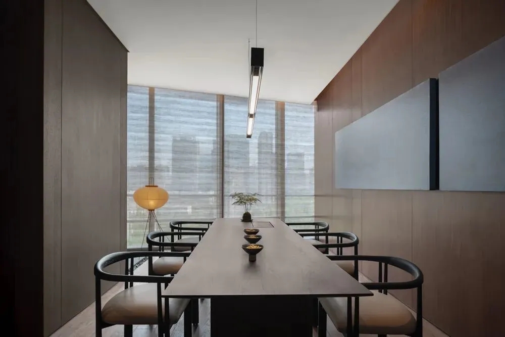 茶室与等候区相邻,当客户由等候区进入茶室时,米兰灰与胡桃木独特的对比又将出现,利用空间狭长的比例,胡桃木墙面将 CBD 景观引入室内,轻与沉,虚与实之间,时间仿佛被无限延长。相比于功能,茶室更需要满足的是人们的精神诉求,当下的新国际主义其实是由西方发达国家所引导的一种趋势,顺应的同时我们也希望让传统文化得以保留。
