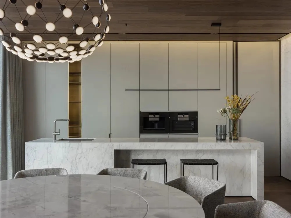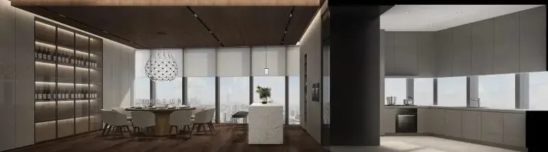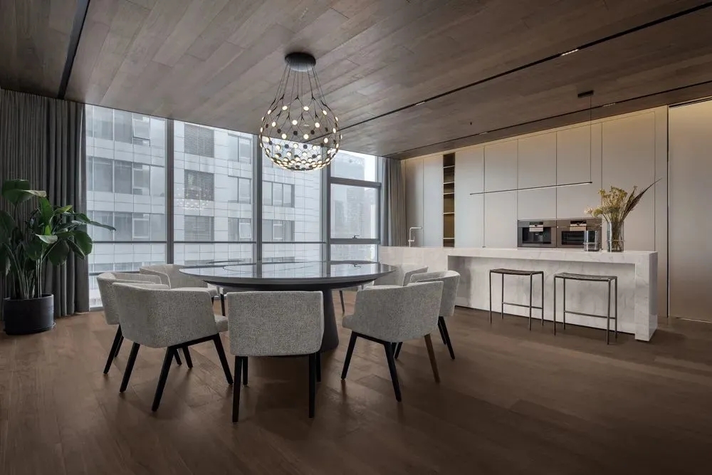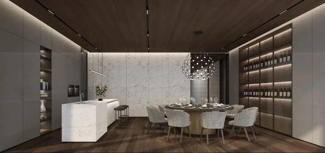 私宴空间在天然木皮的包裹下,只有在人最常使用的吧台和餐桌上使用了大理石:“奢华”不应该被滥用,只需在某个场景中被人感受到。这种克制的表达是我们对奢华的解释。