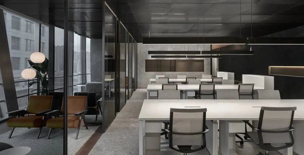 总经理办公室配套了会客区、办公区和洗手间,并有一条独立动线以满足业主的功能需求。墙面壁布一直延伸至天花,与柜体分割比例相呼应。在手法上去装饰化,空间中的功能随家具的摆放而界定,传达了一个自由、安静的办公氛围。在办公室与建筑帷幕之间我们打造了一个室内庭院,庭院不仅与其他独立办公室产生了互动,又因调用了不同的形式语言, 为大空间增加了的层次感。