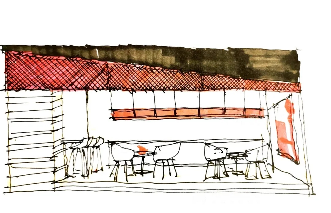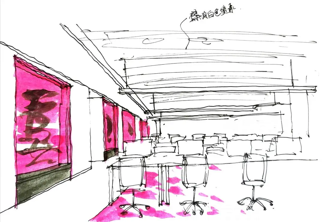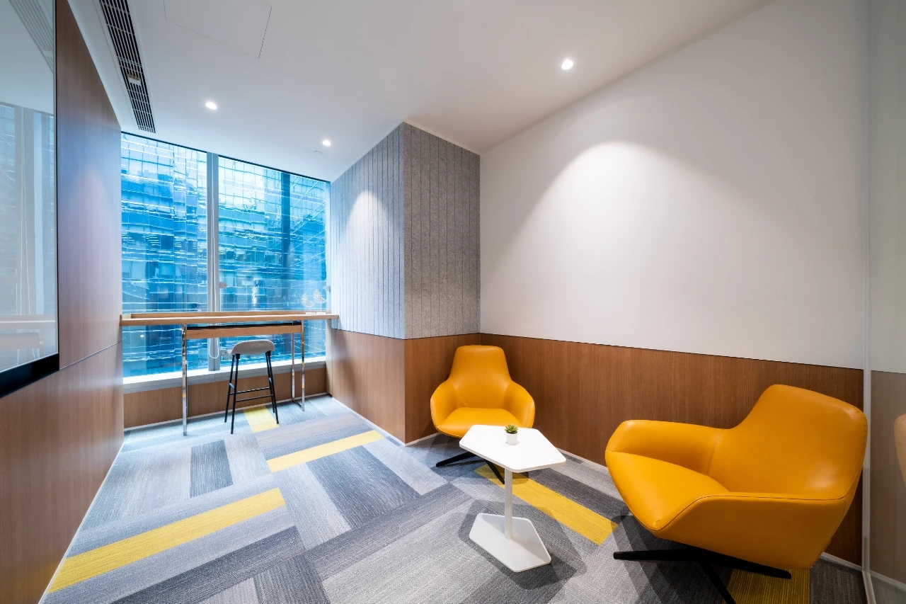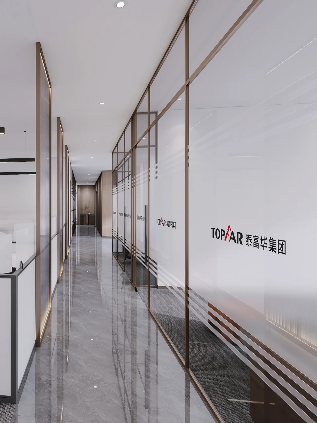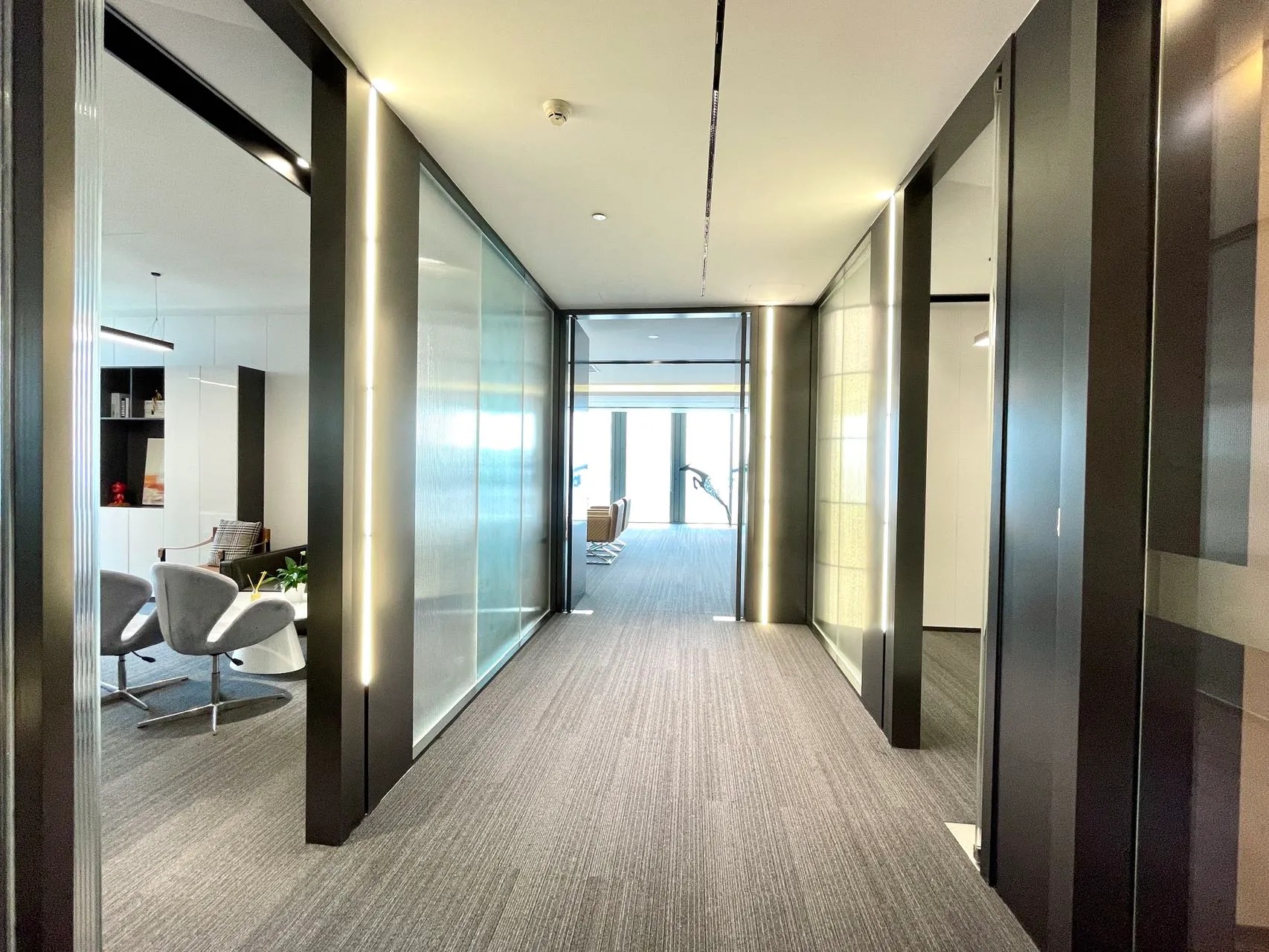 顺着道路往内深入,走廊的尽头是一面红色背景墙。墙上CHASE与顶部灯光交错排布,在墙面形成温馨的暖光,适当地延长了空间视觉,亦给人一种向前的指引感。