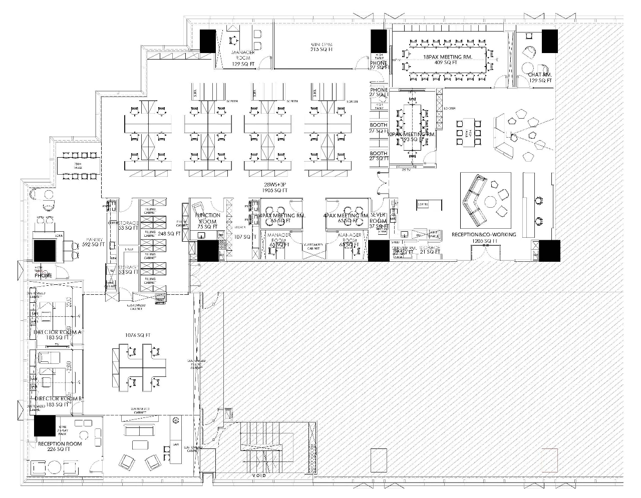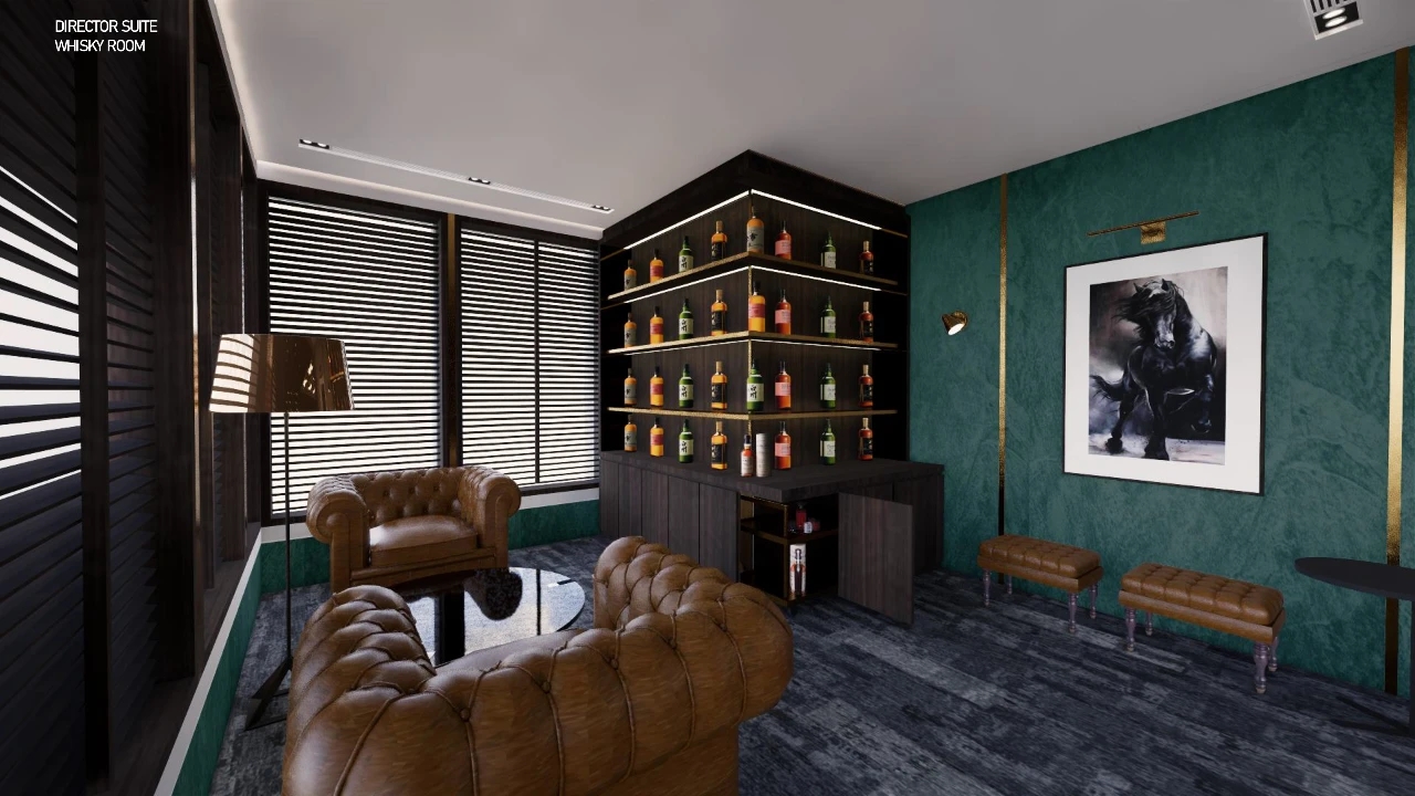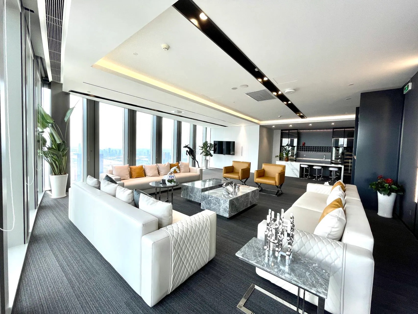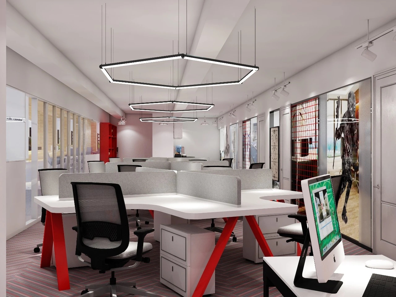 顺着道路往内深入,走廊的尽头是一面红色背景墙。墙上CHASE与顶部灯光交错排布,在墙面形成温馨的暖光,适当地延长了空间视觉,亦给人一种向前的指引感。