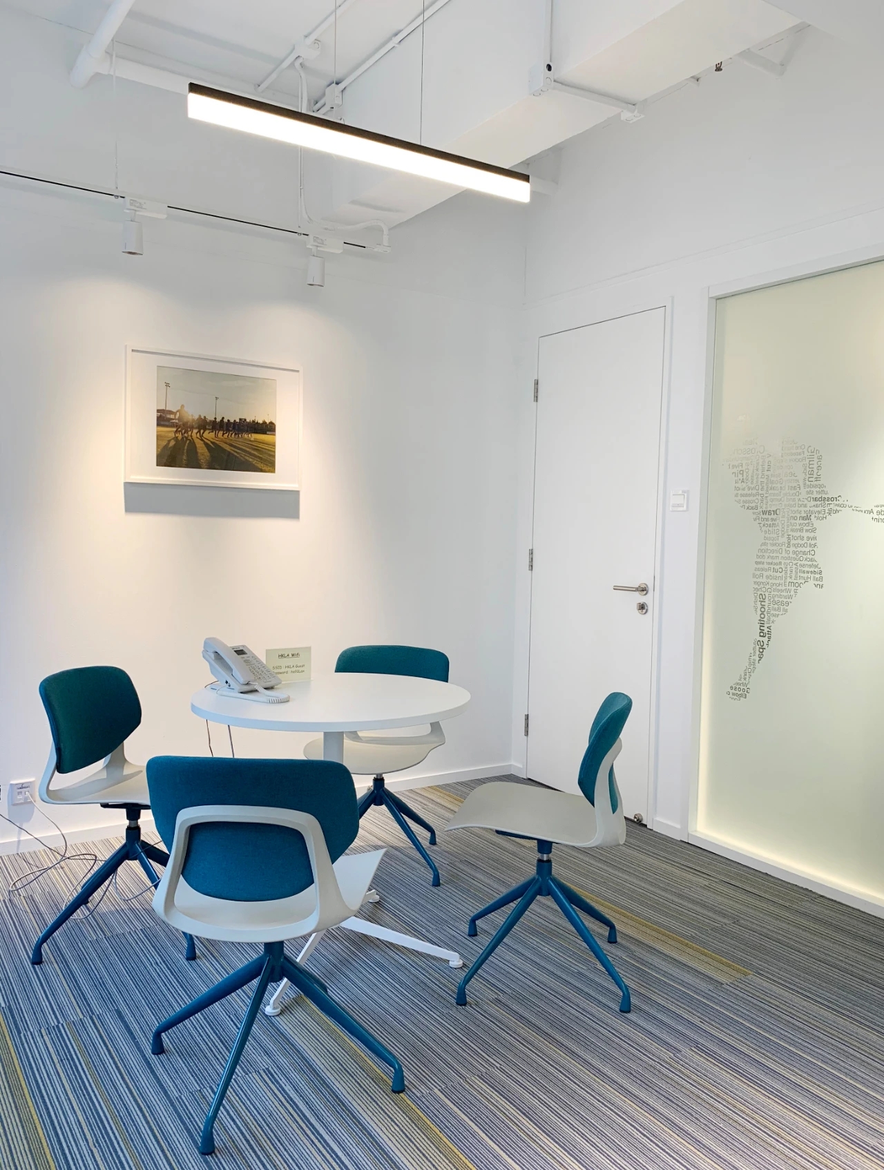 在整体的家具配置设计与材料上,设计师摒弃了一切过于复杂、繁冗的铺陈,以蓝色为主题色贯穿在产品的细节上,没有大面积使用。椅子靠背是PP,椅脚是钢制的,做到了不同材质却保证同一个颜色的效果。