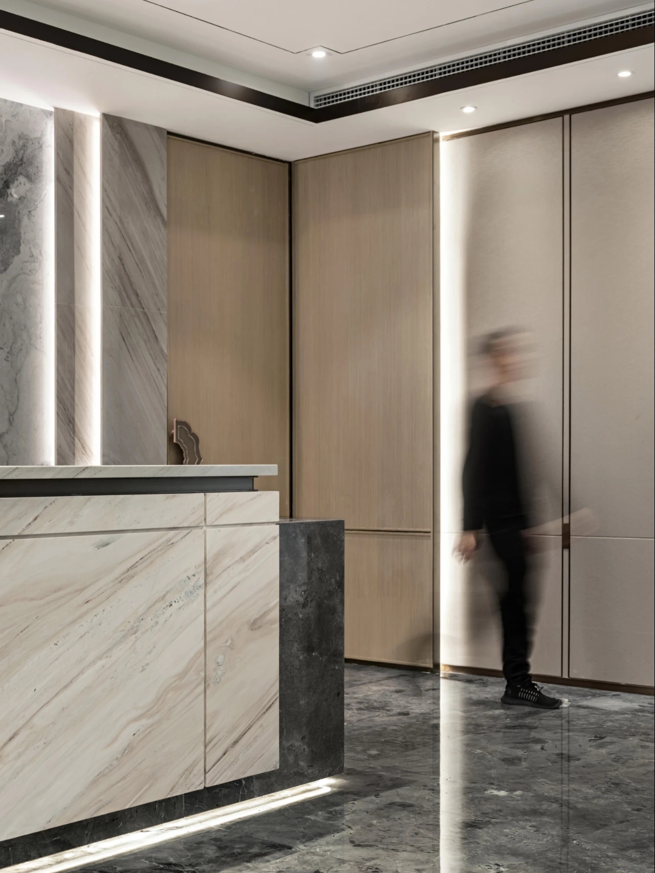 项目虽为办公空间,但每一个空间的肌理细节,却是设计往复推敲。在现代东方美学原则之中,将材质间的属性、对比。在工艺节点的表达中,演绎当代美学的精髓。