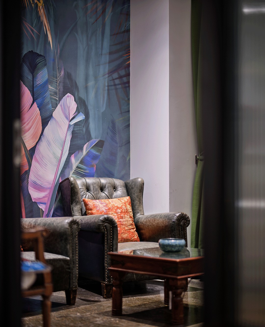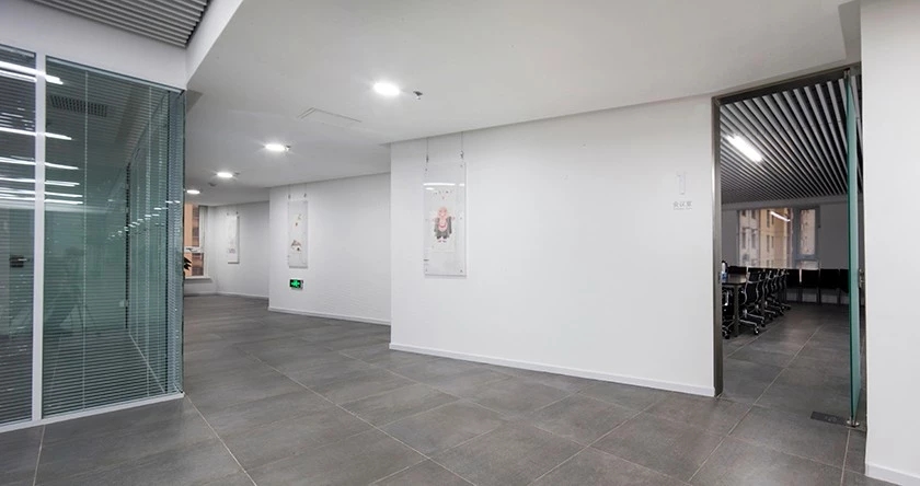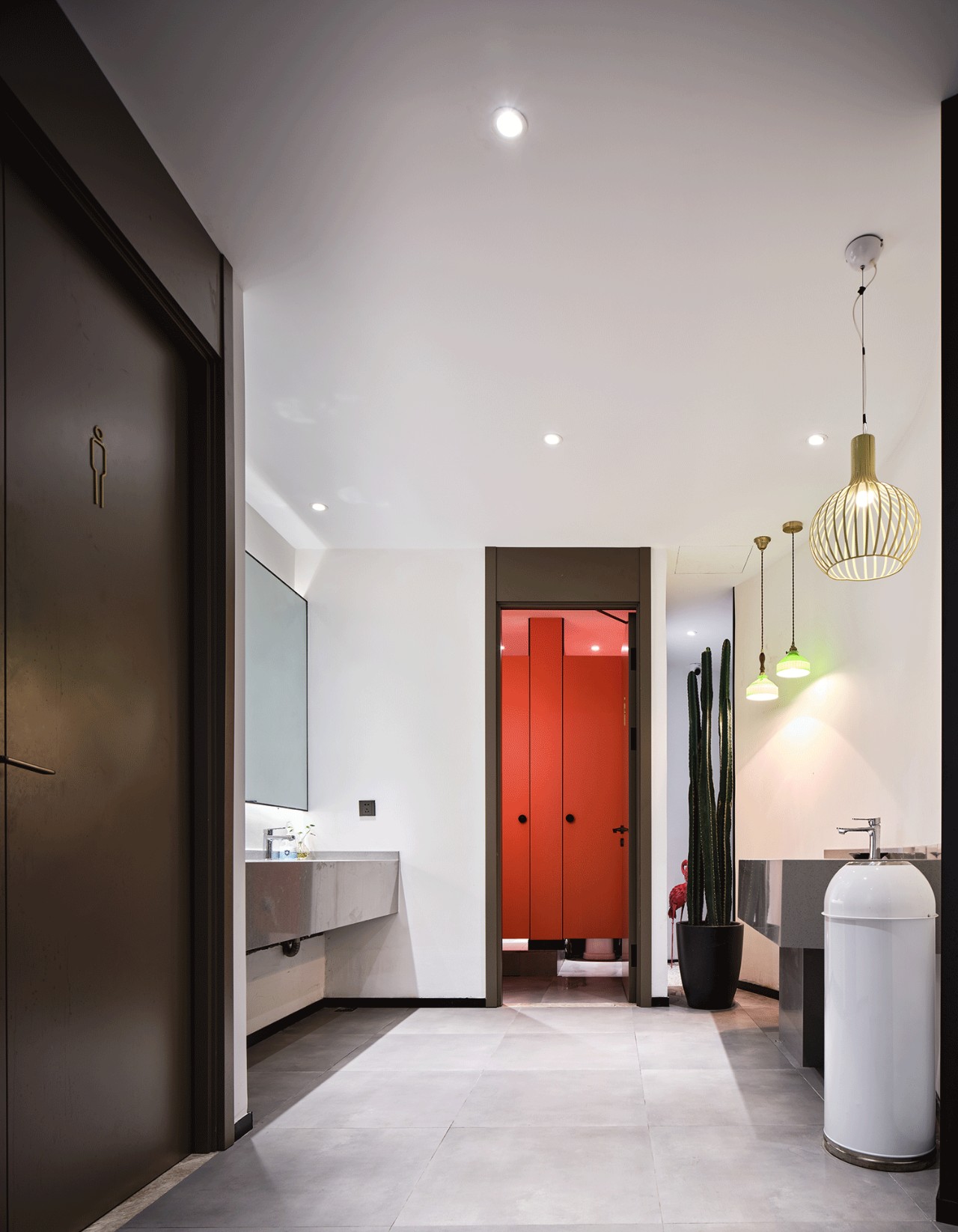 为了创造出灵活通透的空间,部分吊顶和墙面选择了白色铝方通间隔排列,顶部裸露结构和设备,形成精细与粗犷的材质对比,使得空间层次丰富。
