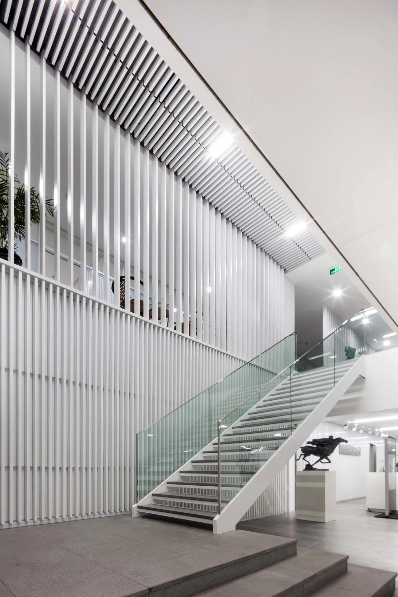 设计依据办公性质的需求,将空间合理划分为会议区,独立办公区和开敞办公区,占据两层的办公空间以一部现代感十足的白色钢梯连接,空间通透,实现了上下空间的渗透和延续,体现了企业开放和包容的设计情怀。