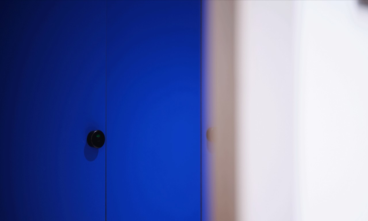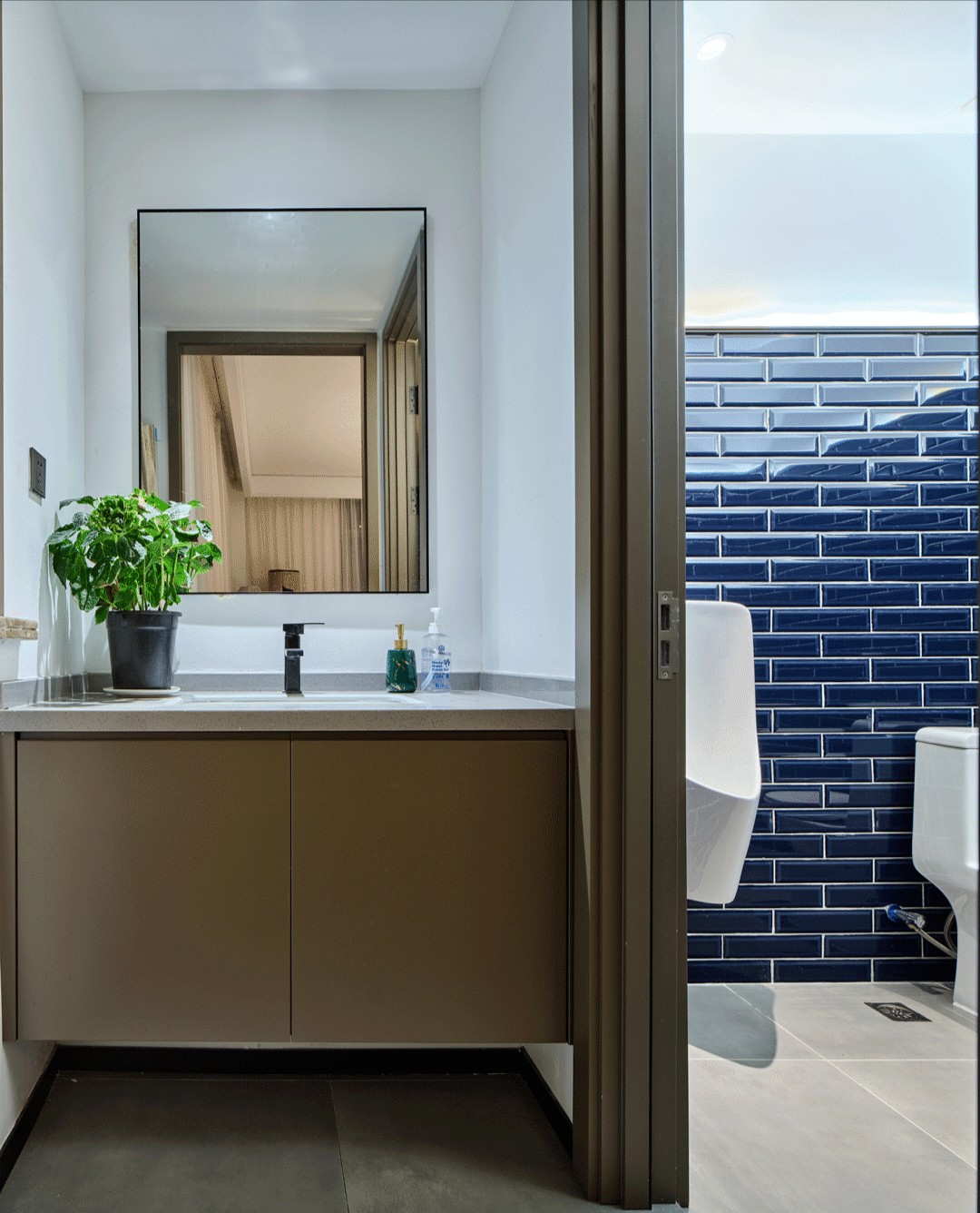 蓝色的壁面不免给予人一种舒适,地面灰色的大理石与墙面相照应,构建了一个有温度又精巧的空间。