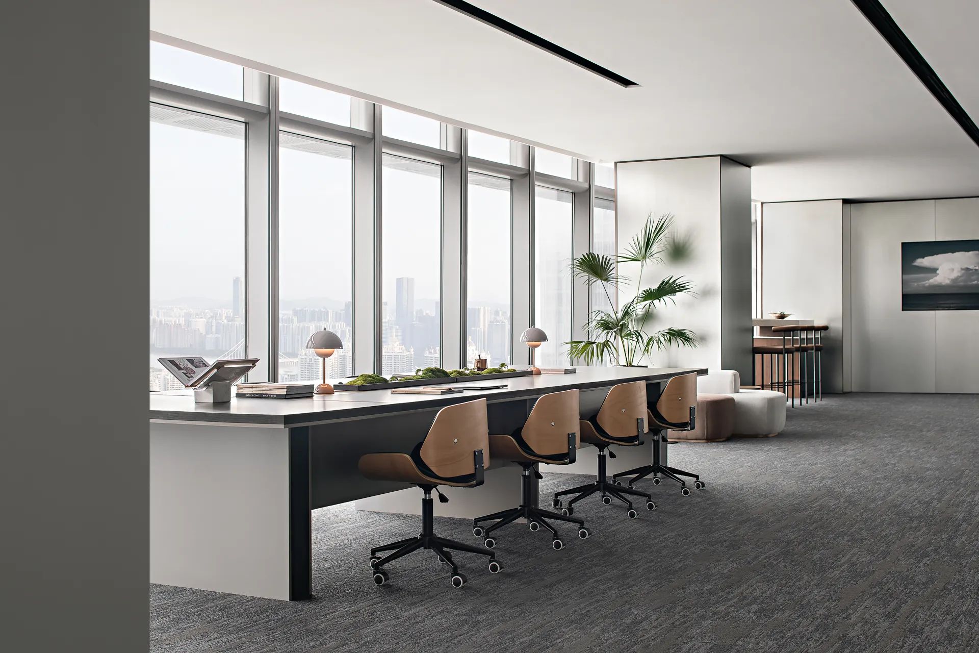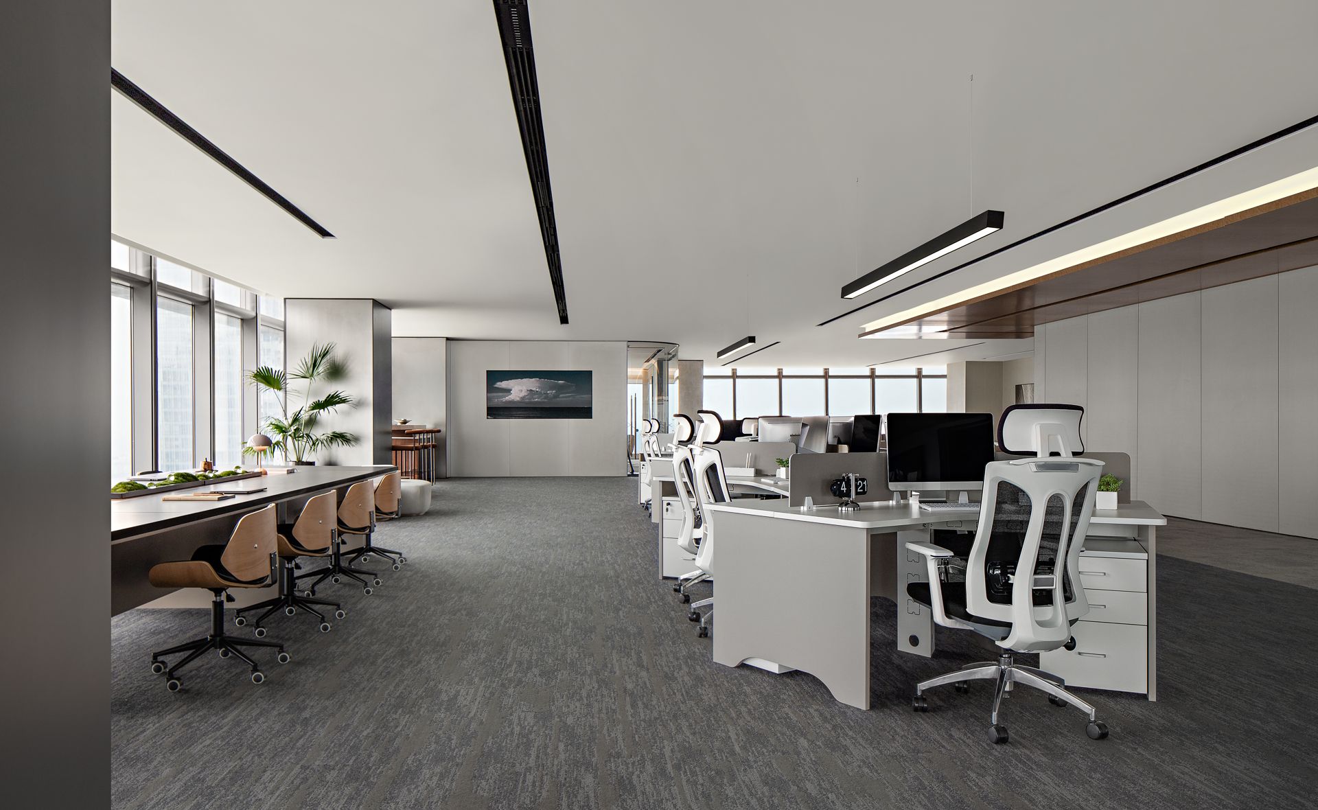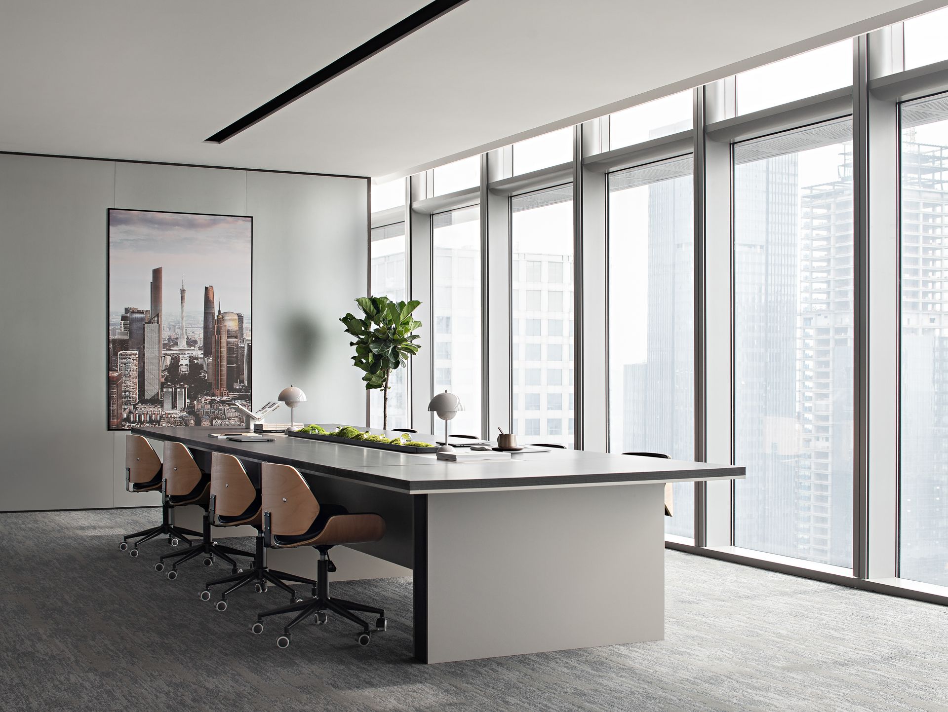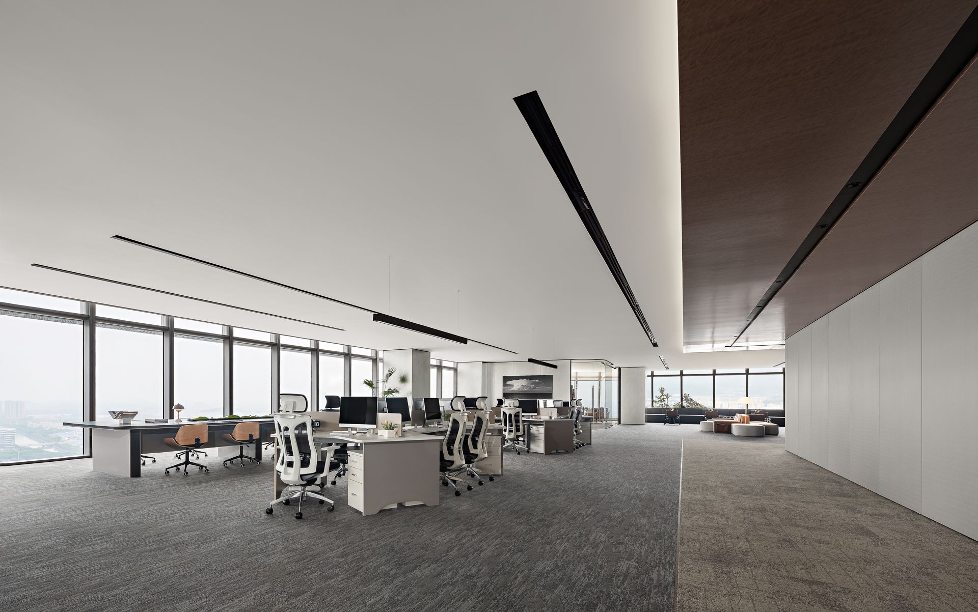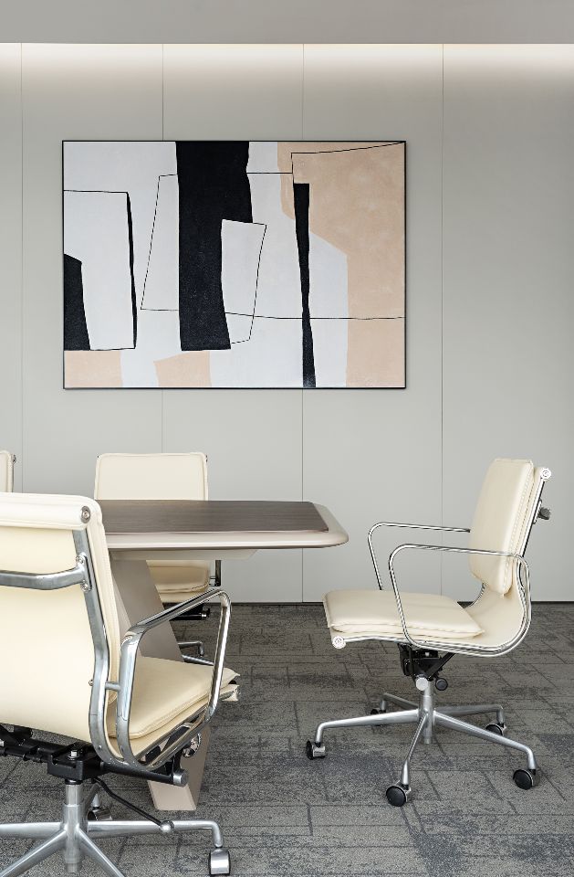 大会议室可容纳30余人参与会议,拥有平视窗外高楼林立的巨幅景观面,通过木质元素平衡空间中的温度,使空间充满温润的私密感。