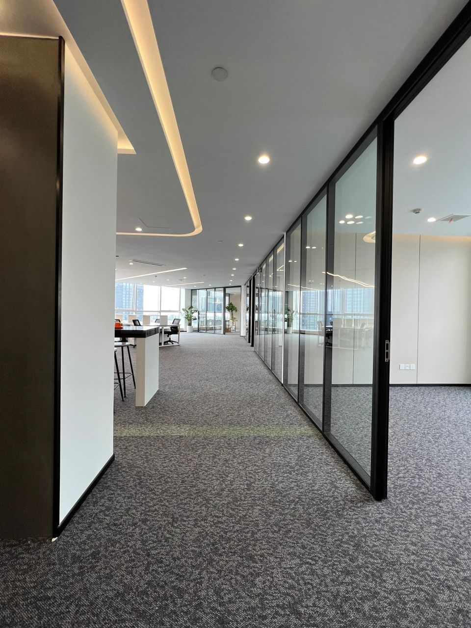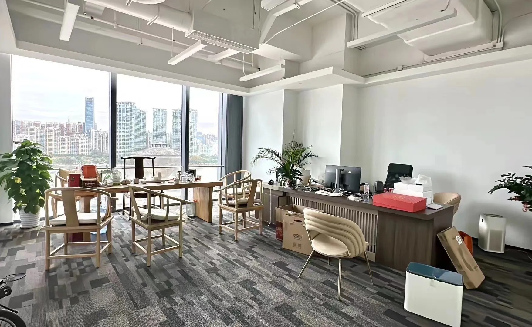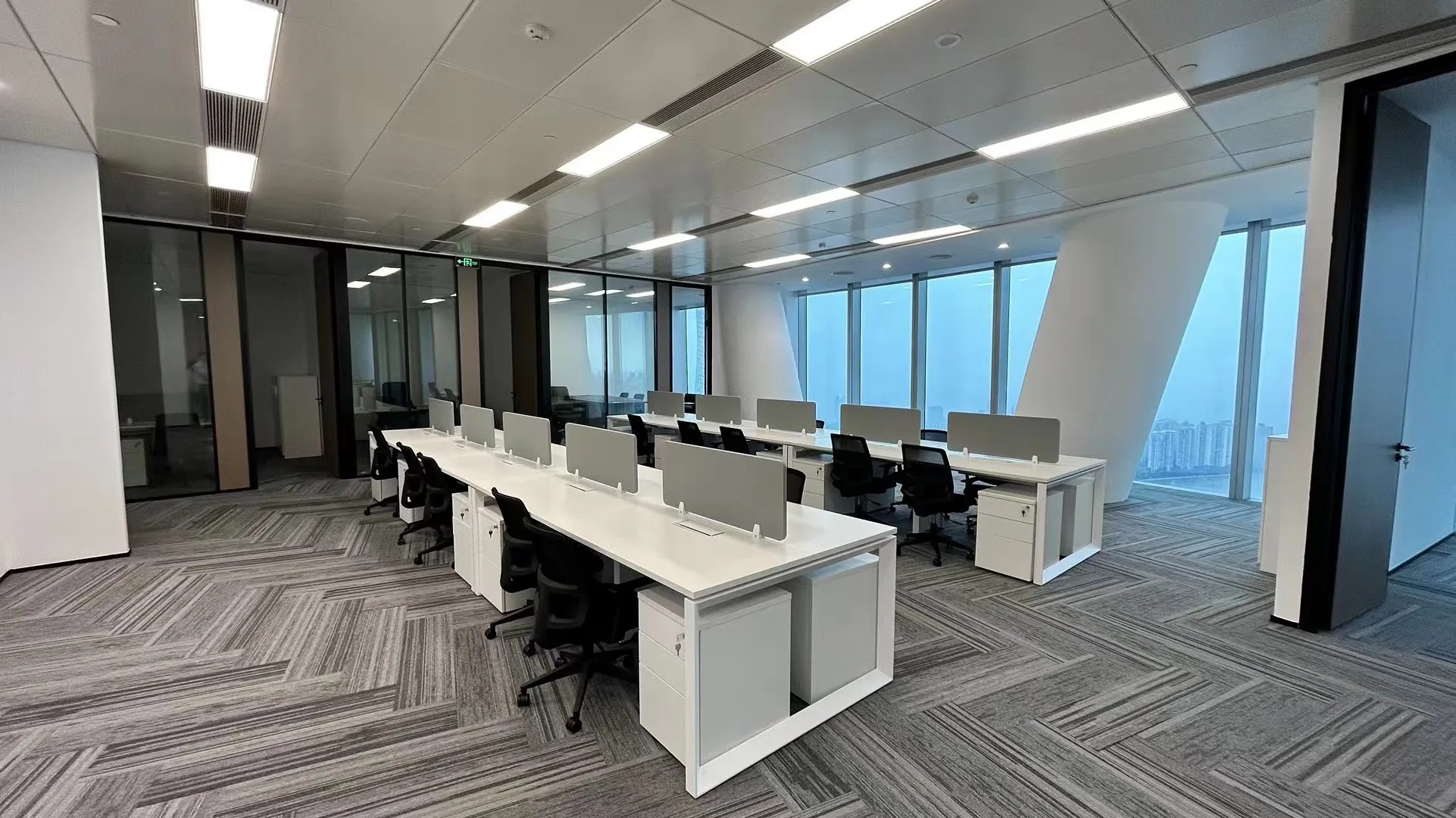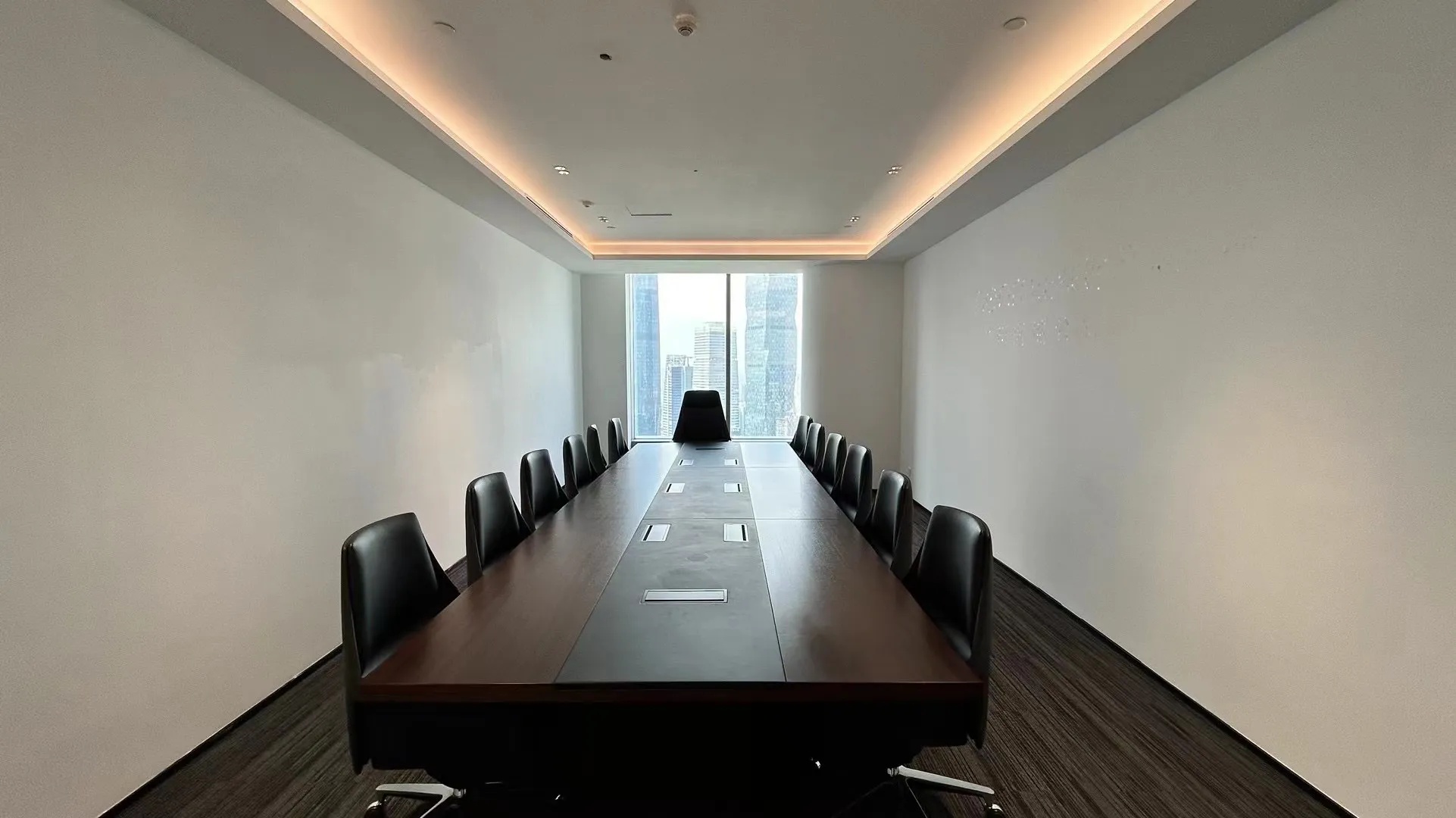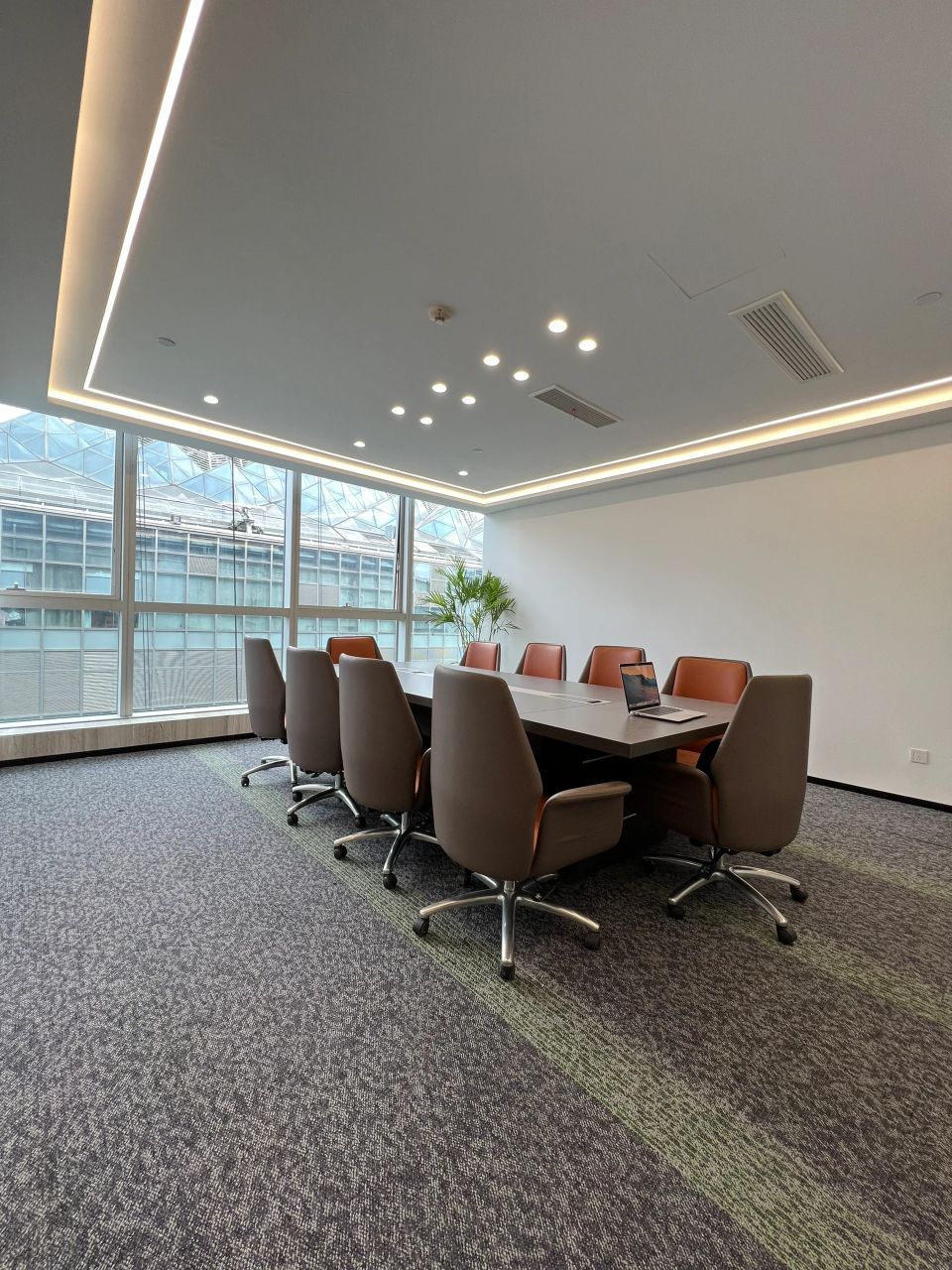 大会议室可容纳30余人参与会议,拥有平视窗外高楼林立的巨幅景观面,通过木质元素平衡空间中的温度,使空间充满温润的私密感。