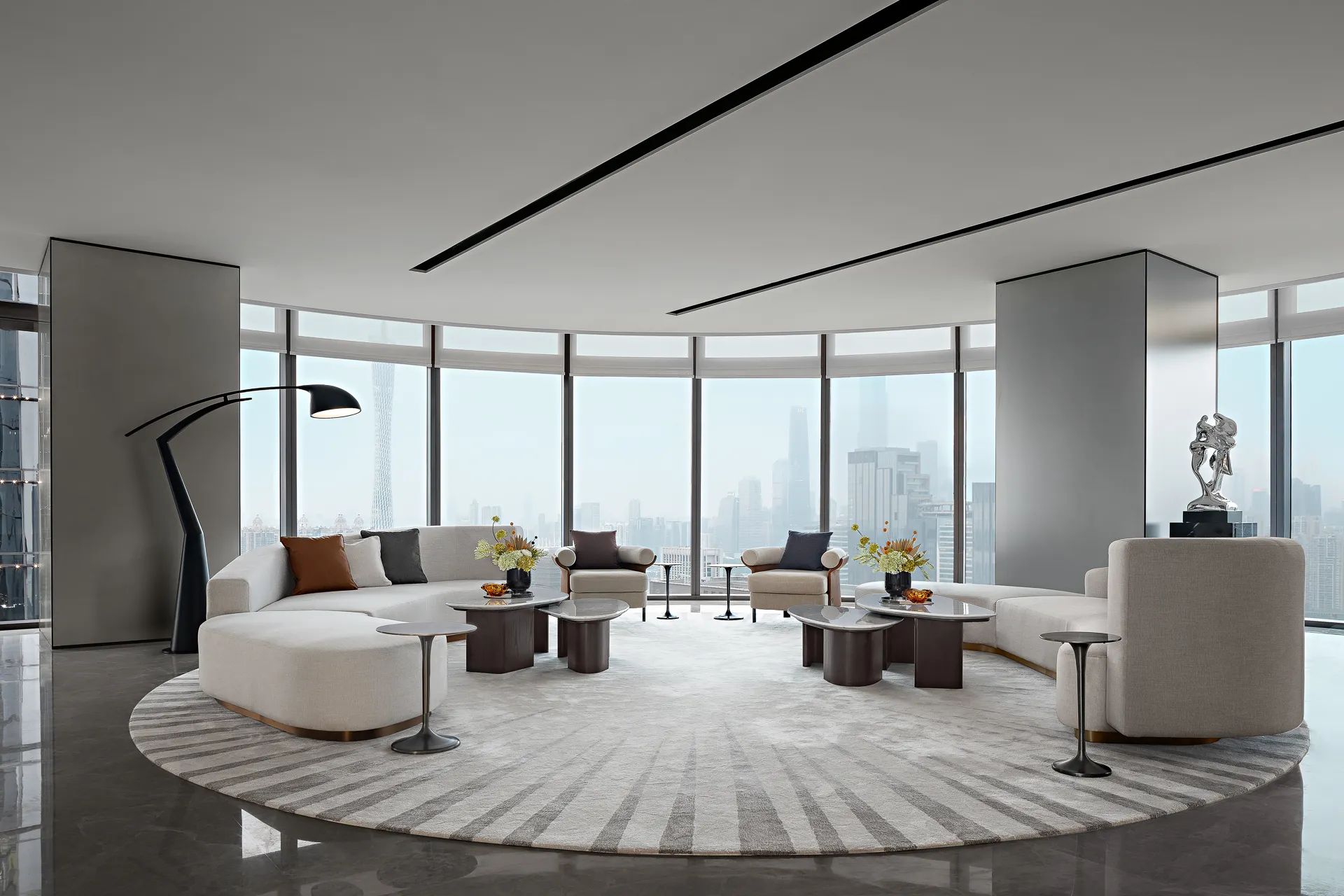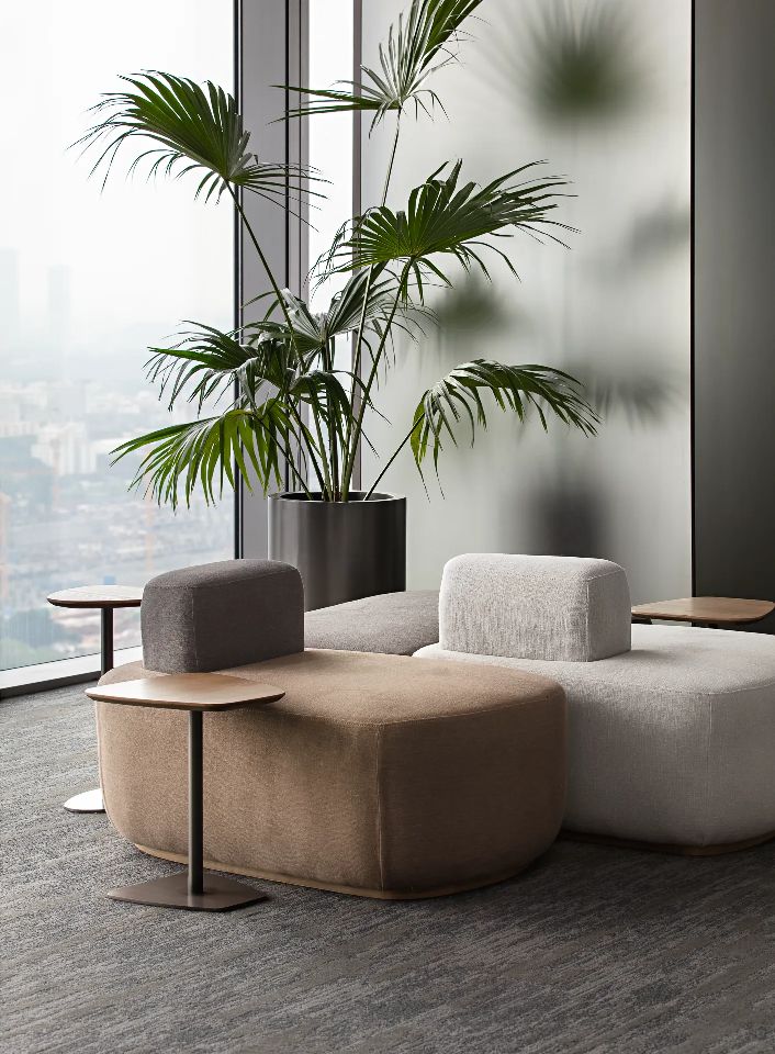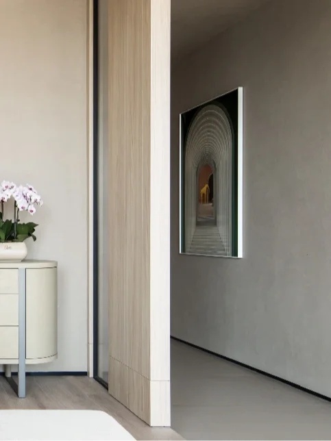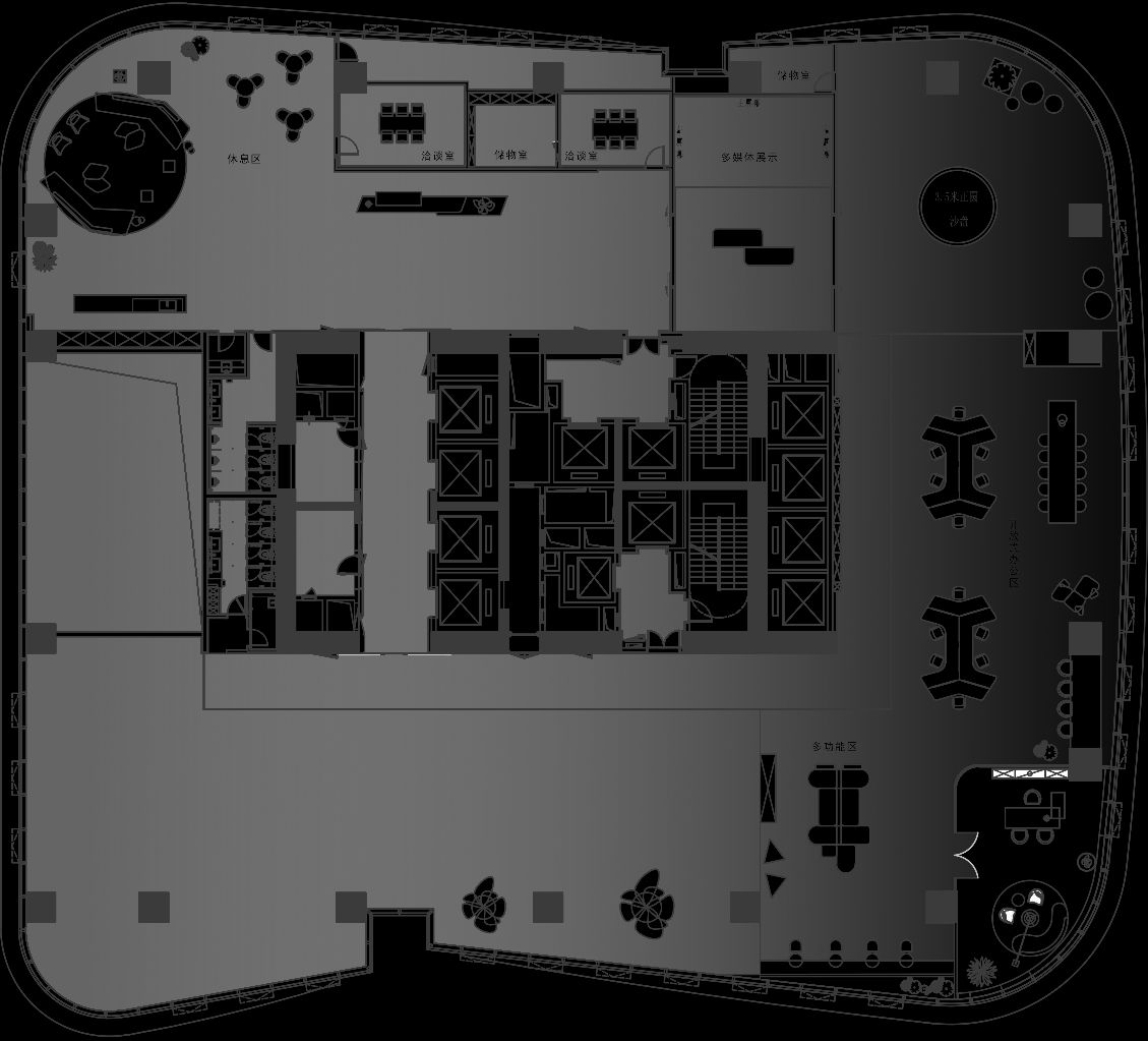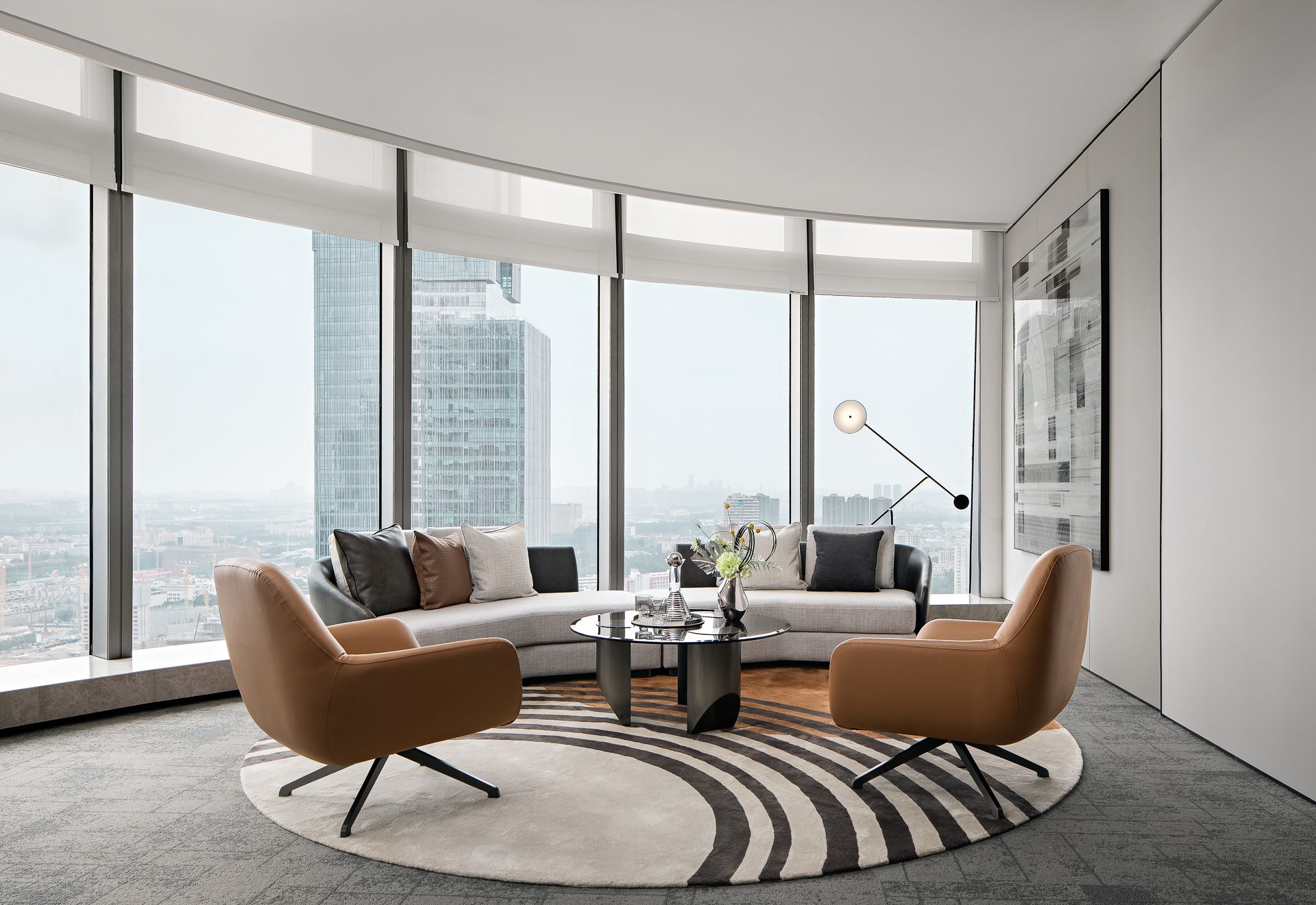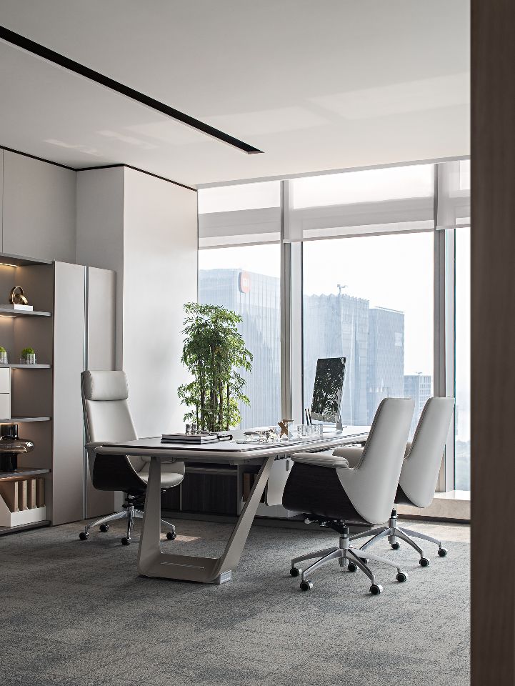 总裁办公室整体呈现为系统性与逻辑性、商务性与艺术性、独立性与互动性的融贯一体。摒弃繁复华丽装饰,体现空间的不凡气度,用材质、光影、弧线承载商务会客与独处休闲的不同场景。