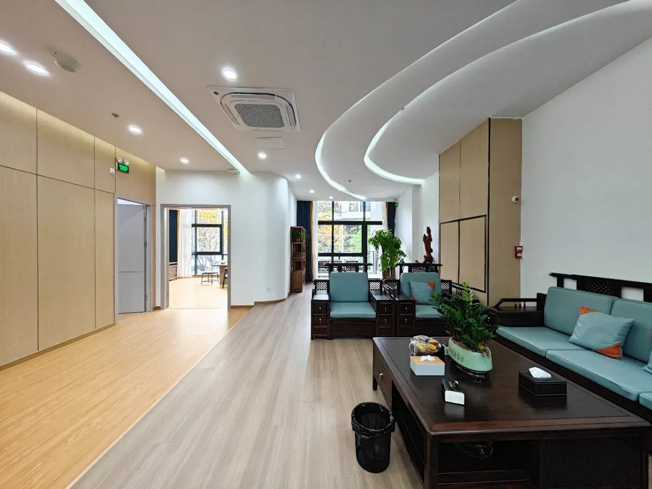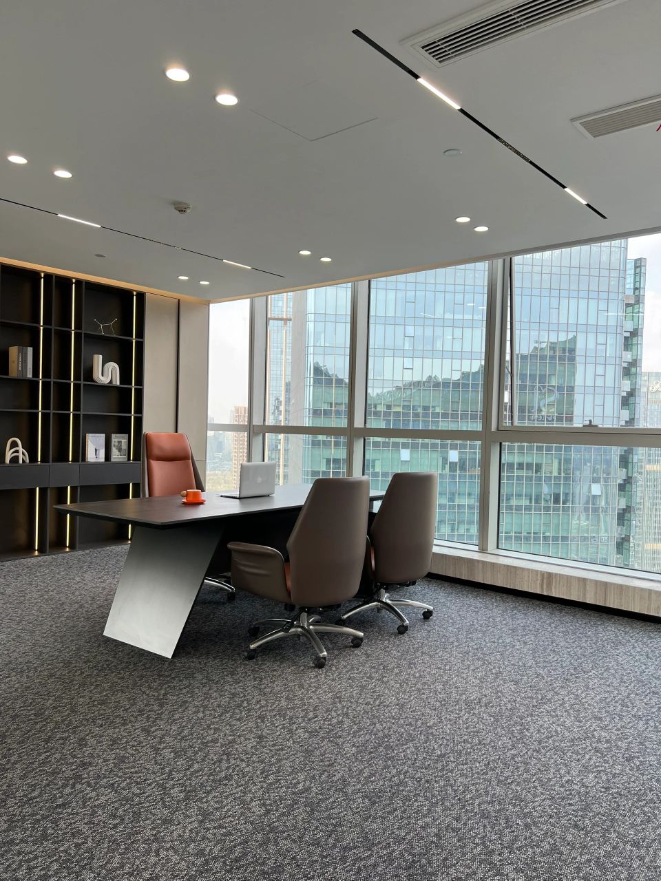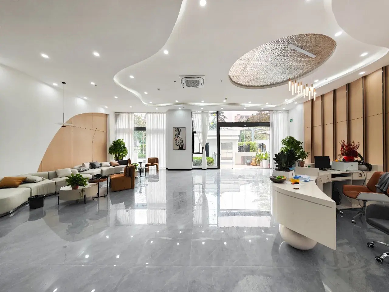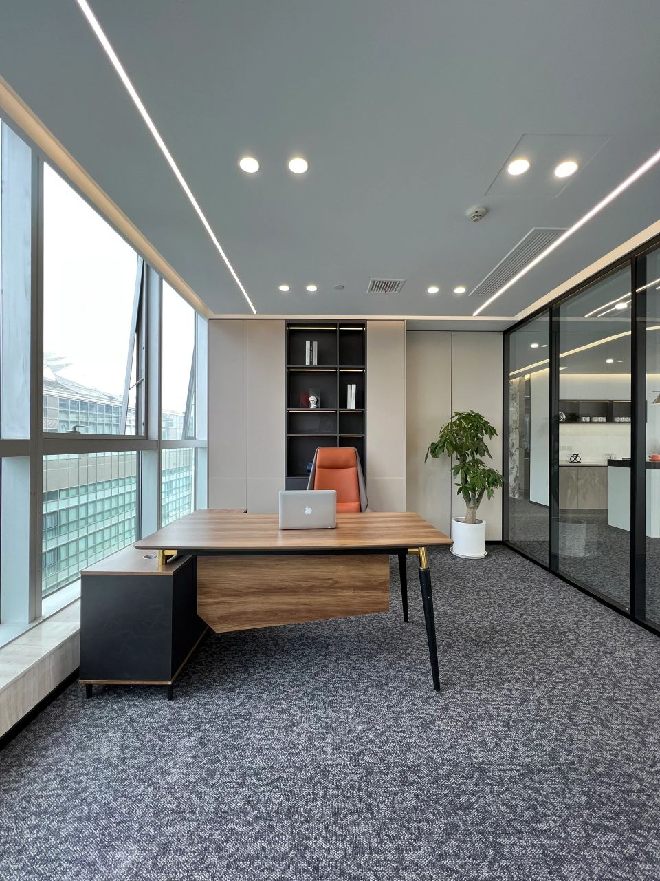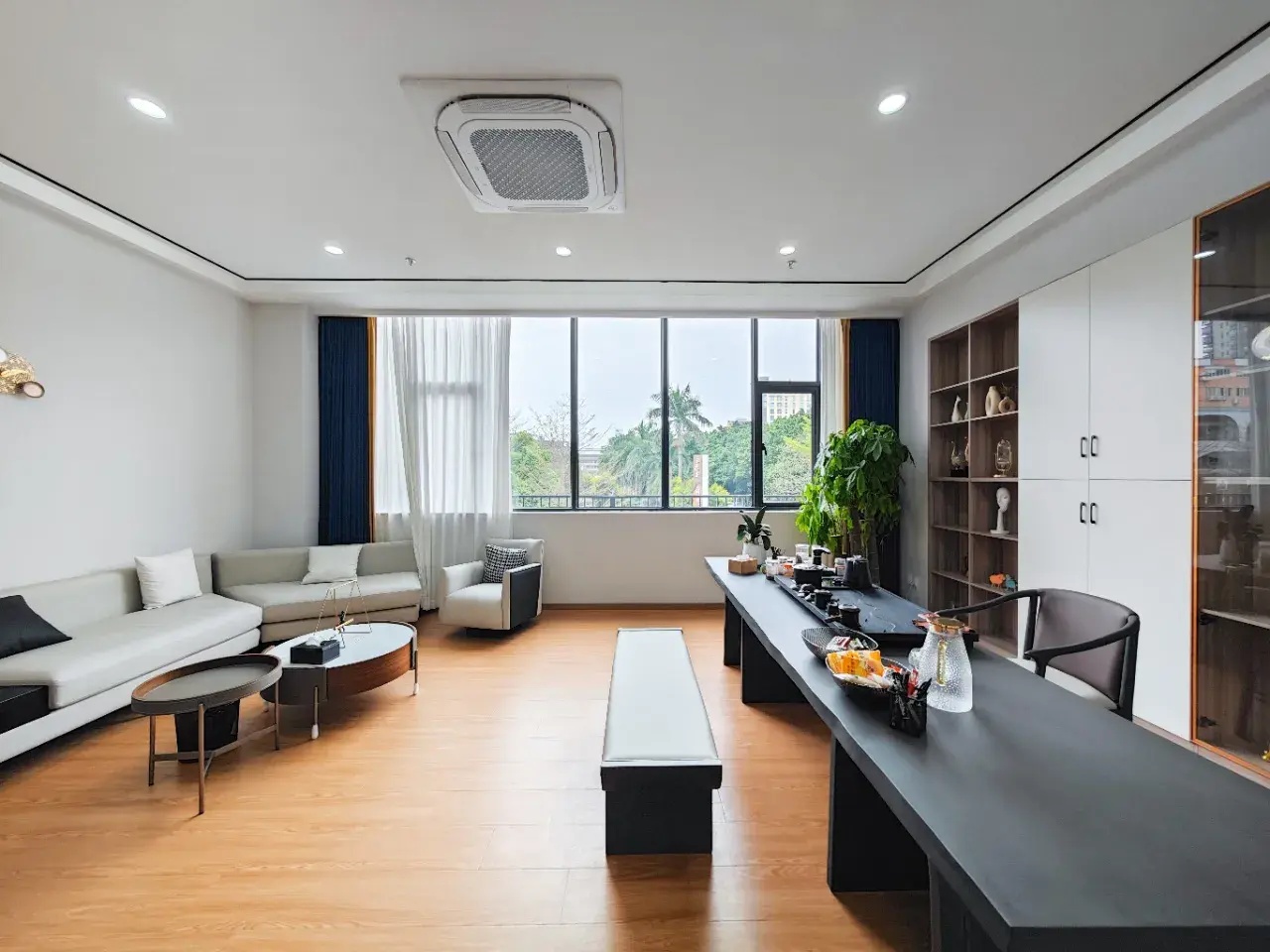 总裁办公室整体呈现为系统性与逻辑性、商务性与艺术性、独立性与互动性的融贯一体。摒弃繁复华丽装饰,体现空间的不凡气度,用材质、光影、弧线承载商务会客与独处休闲的不同场景。