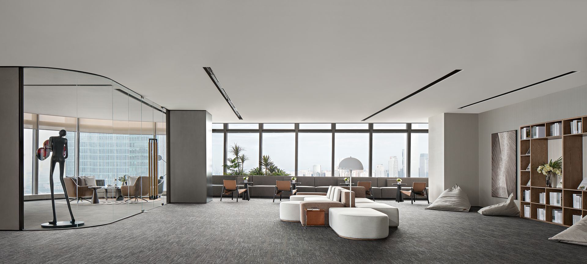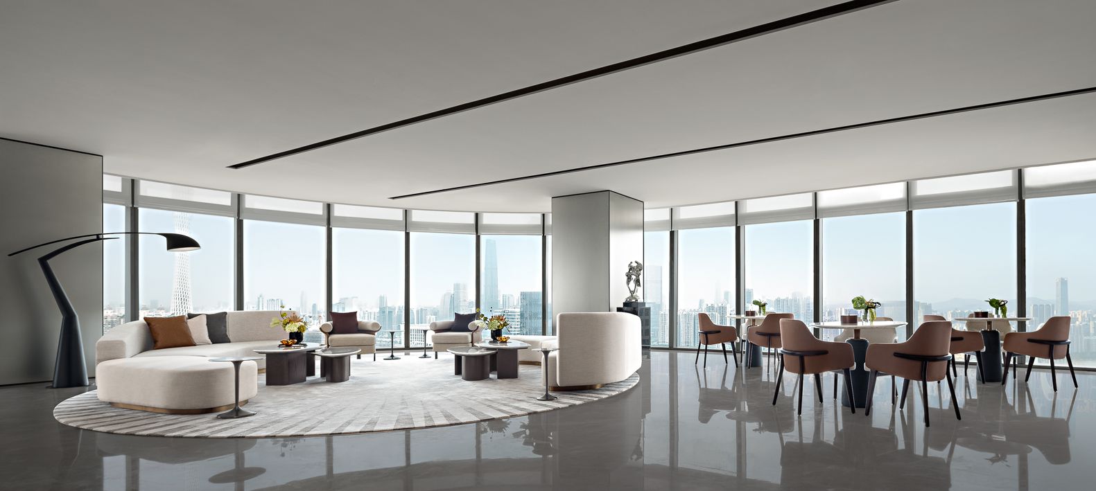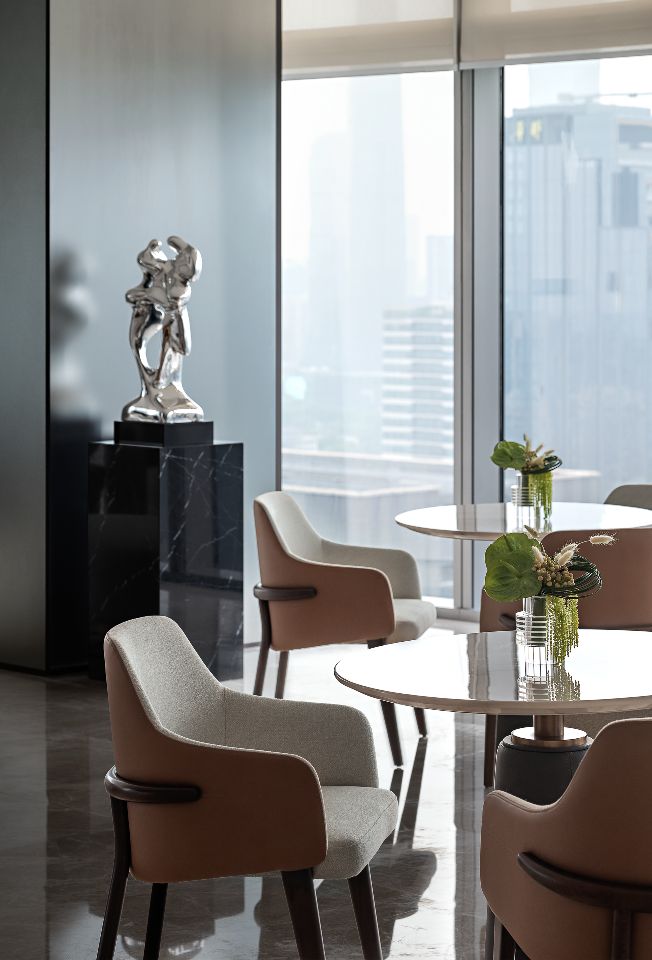 大面积的落地窗设计最大化地让空间和光影产生反应,整幕广州塔景色跃然入室,瞬间予人朗阔洒脱心境,到访者将专享独一无二的休闲式会谈氛围。