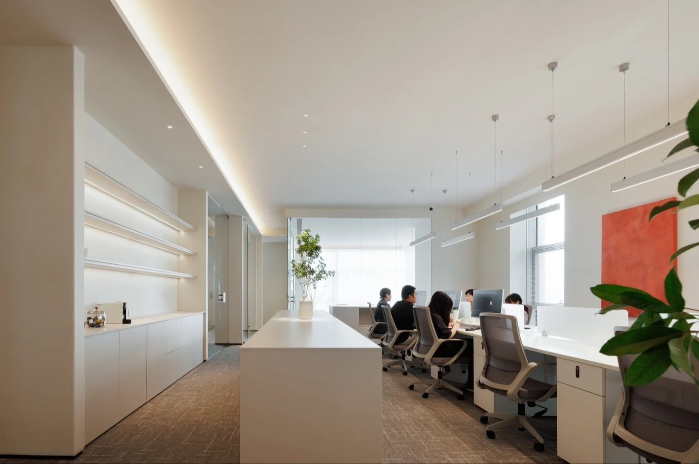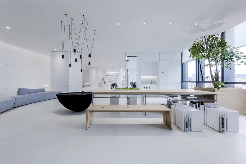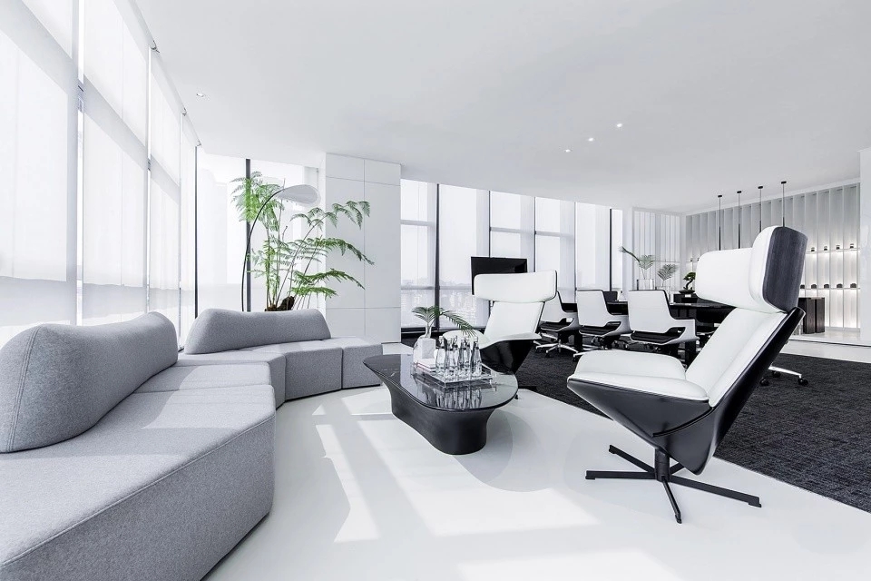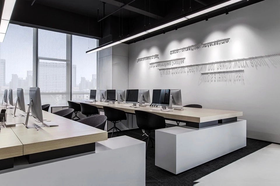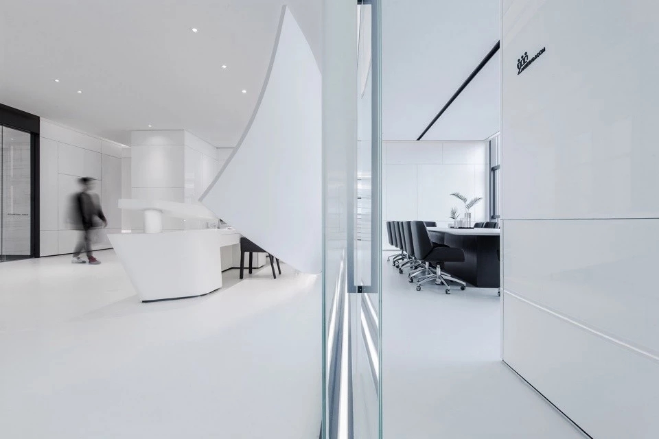办公室大面积铺以高纯度白色,同时以黑色作为辅色,显现公司的现代感与科技感。落地玻璃窗将外景引进,深圳的日与夜变成室内一幕,将城市之景尽收眼底。在室内多处放置绿植,柔和空间科技感,增加人文自然气息。将各个空间打通,形成开阔的环境,再将空间依照不同的功能划分为不同办公区域。