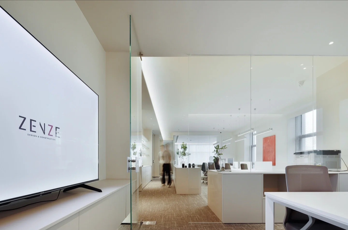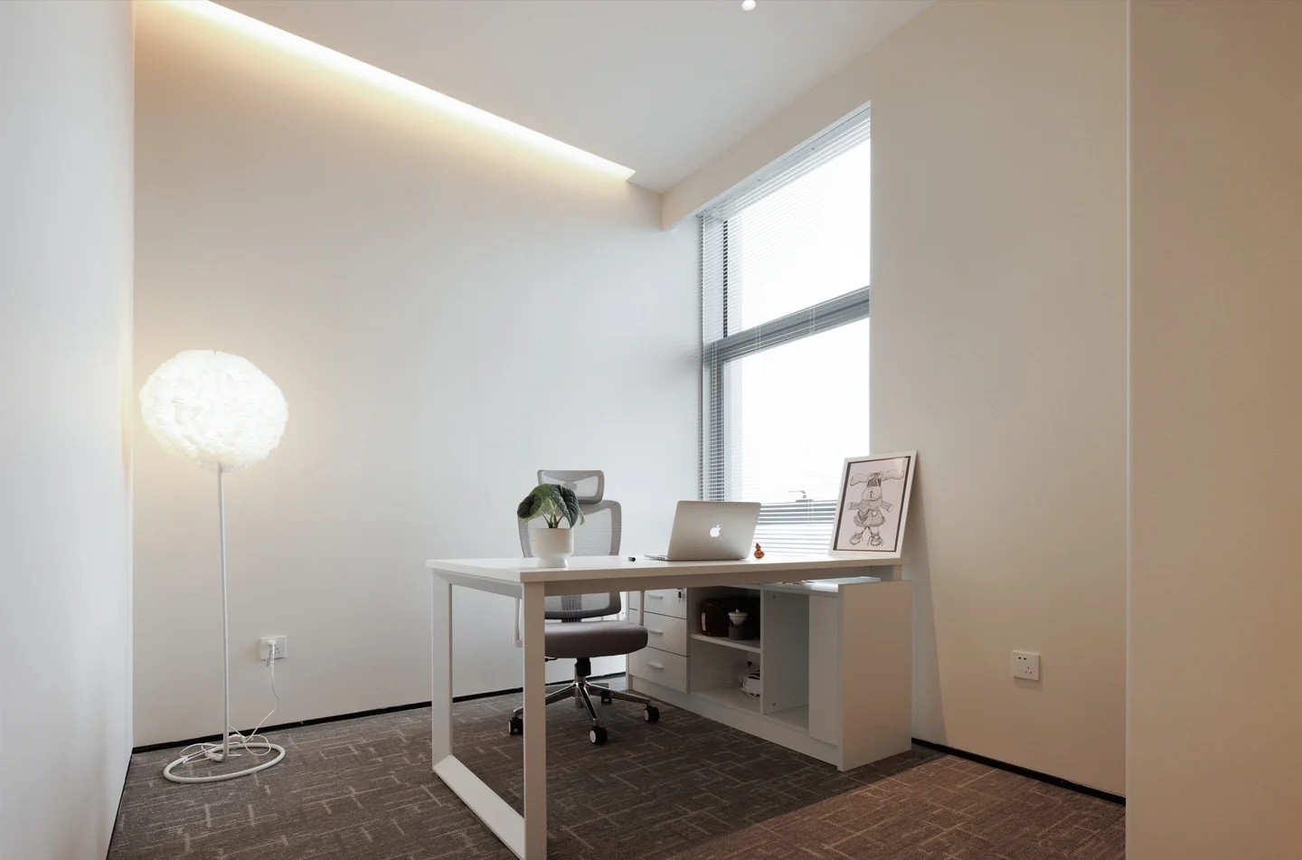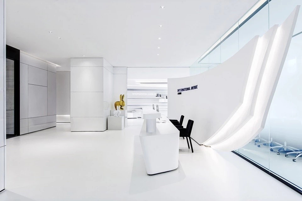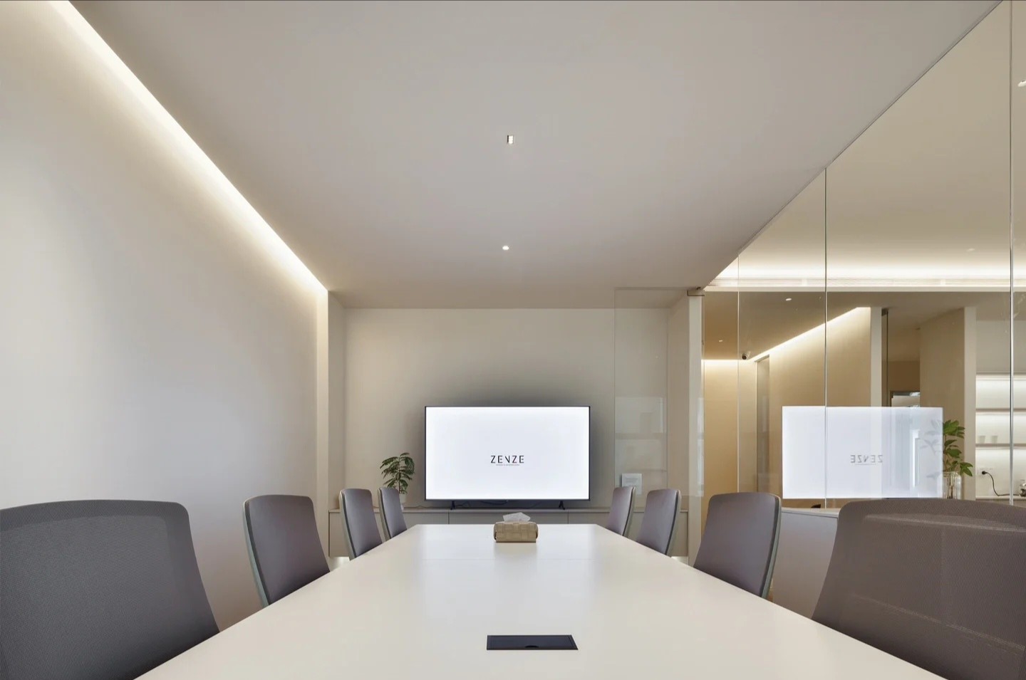 办公室大面积铺以高纯度白色,同时以黑色作为辅色,显现公司的现代感与科技感。落地玻璃窗将外景引进,深圳的日与夜变成室内一幕,将城市之景尽收眼底。在室内多处放置绿植,柔和空间科技感,增加人文自然气息。将各个空间打通,形成开阔的环境,再将空间依照不同的功能划分为不同办公区域。