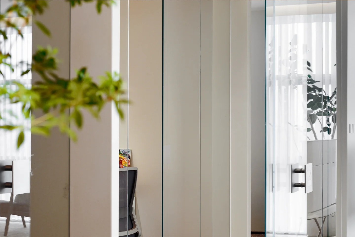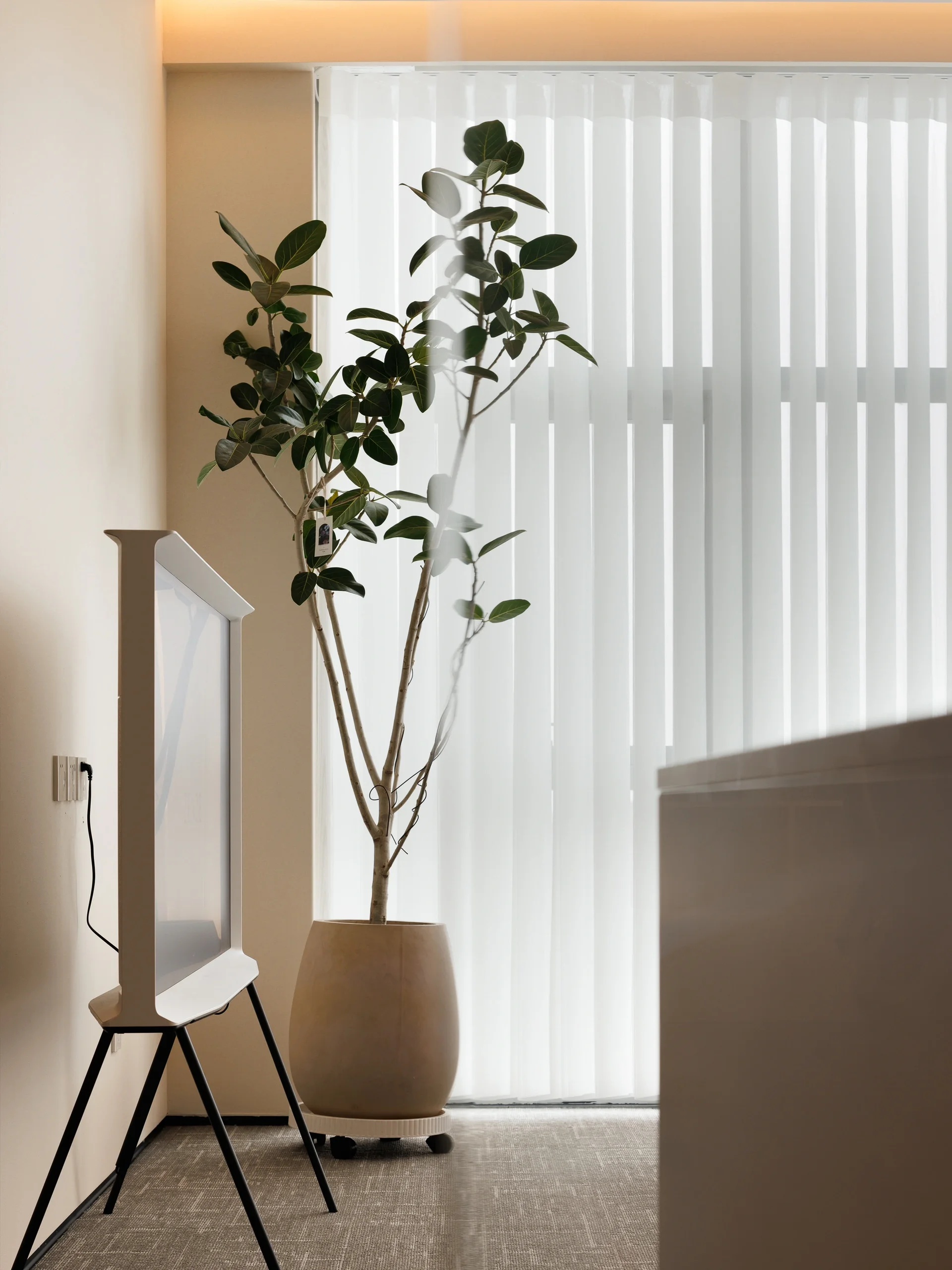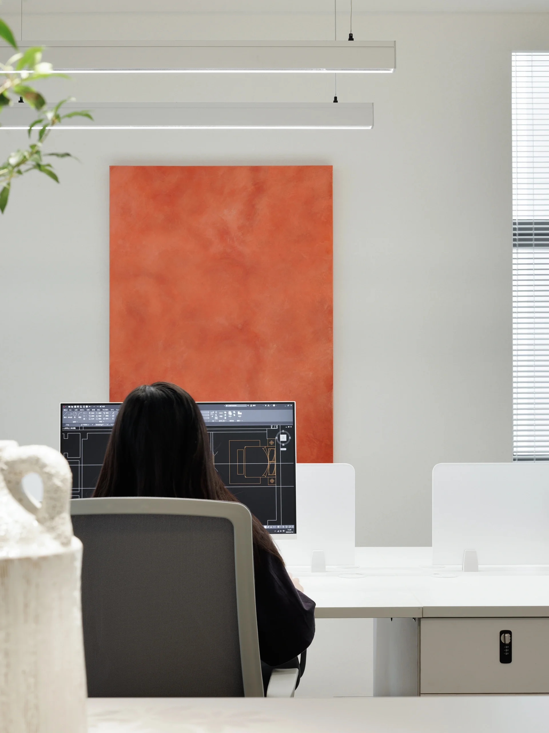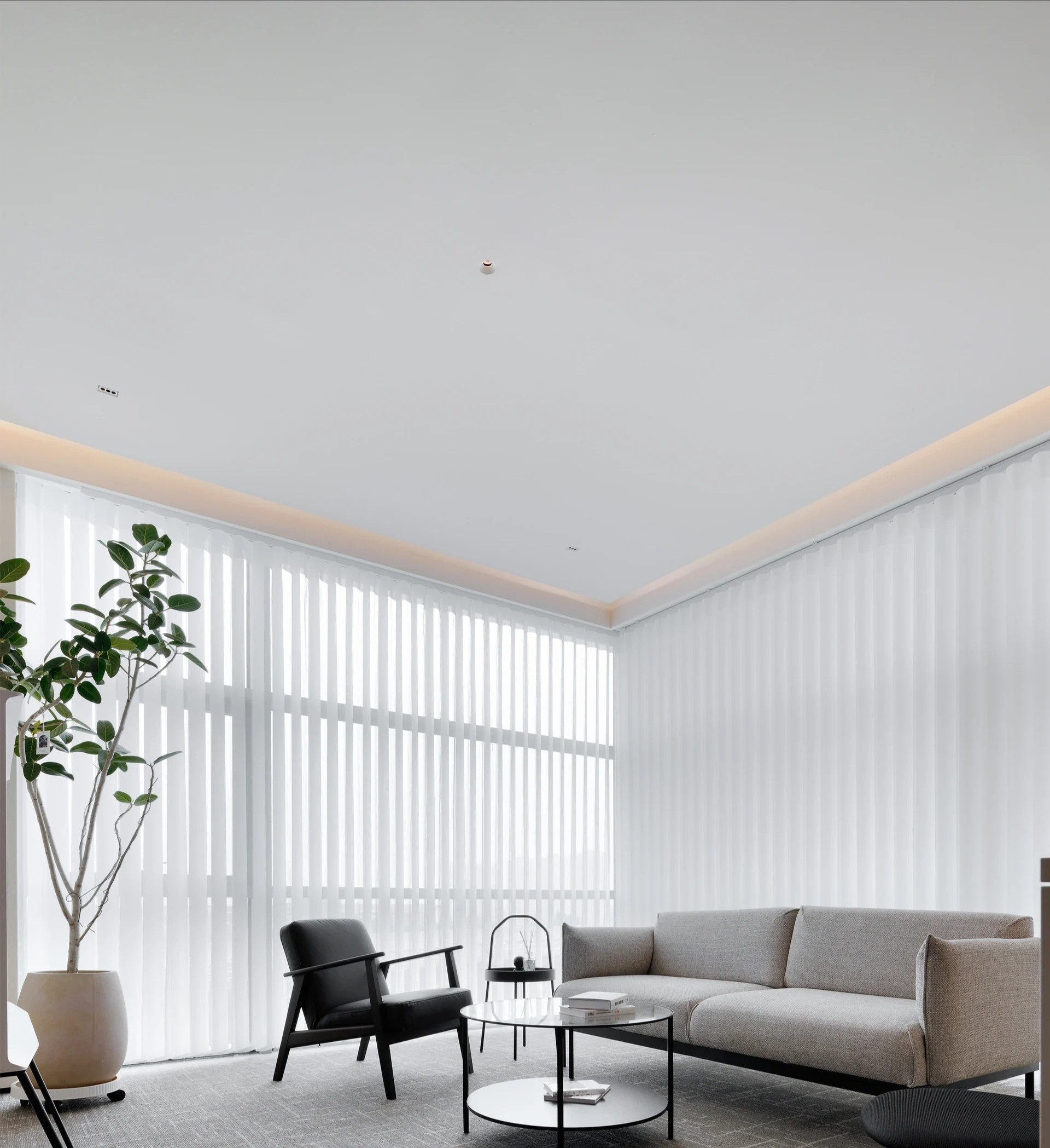 办公室大面积铺以高纯度白色,同时以黑色作为辅色,显现公司的现代感与科技感。落地玻璃窗将外景引进,深圳的日与夜变成室内一幕,将城市之景尽收眼底。在室内多处放置绿植,柔和空间科技感,增加人文自然气息。将各个空间打通,形成开阔的环境,再将空间依照不同的功能划分为不同办公区域。