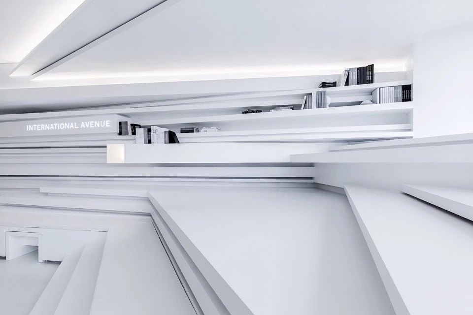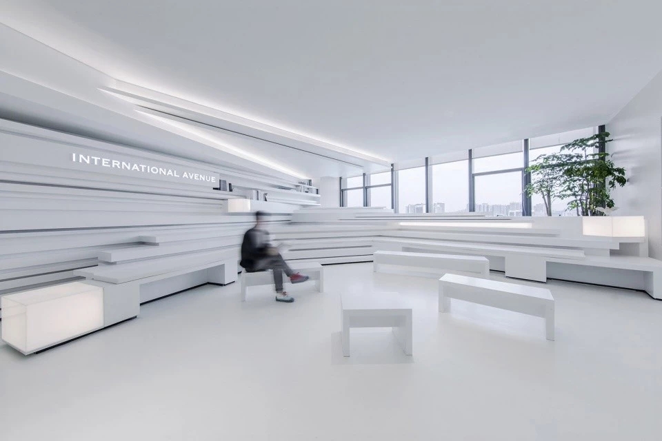 前台区域作为办公室的初步印象,投射浓厚的艺术科技感。水吧休闲区的木质家具柔和空间科技感,带来温润空间质感。多功能厅由穿插的线条体块组成,不规则线条构造简洁而有力,同时具有视觉韵律美感,丰富空间层次变化。