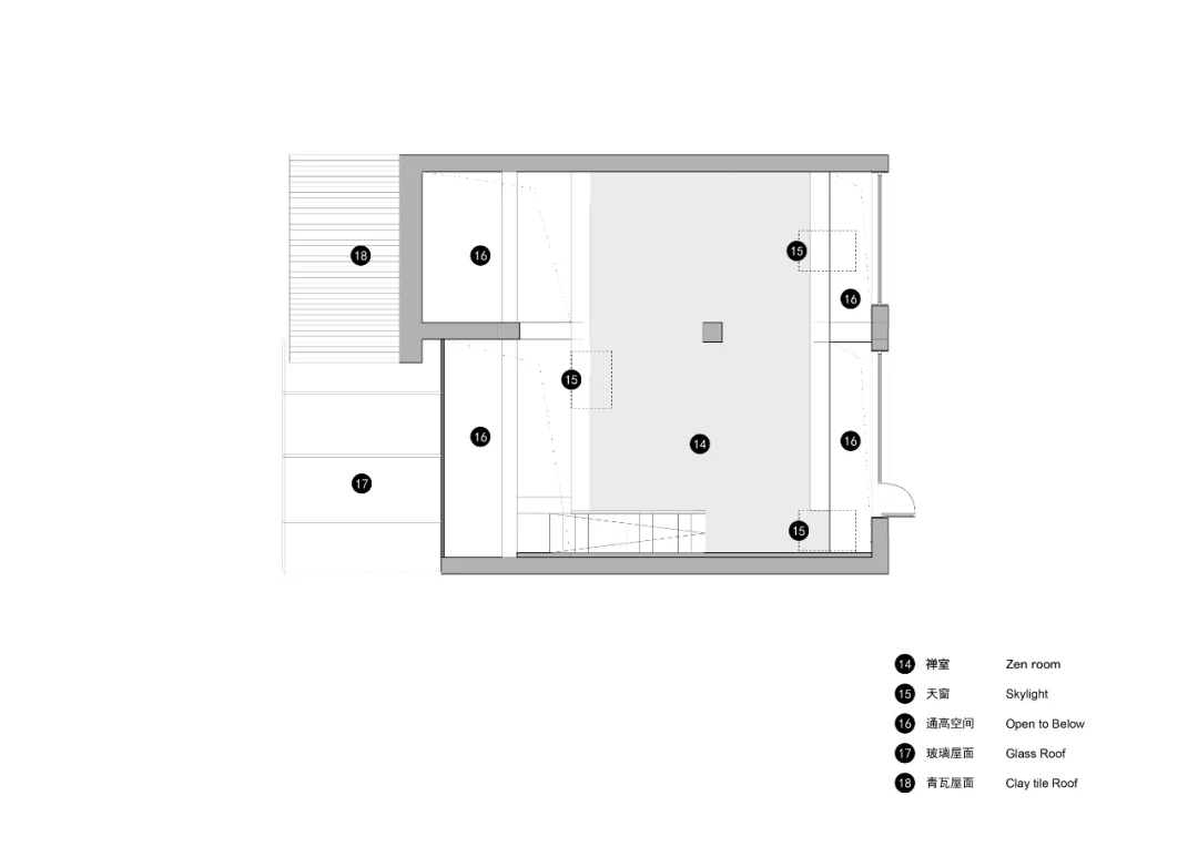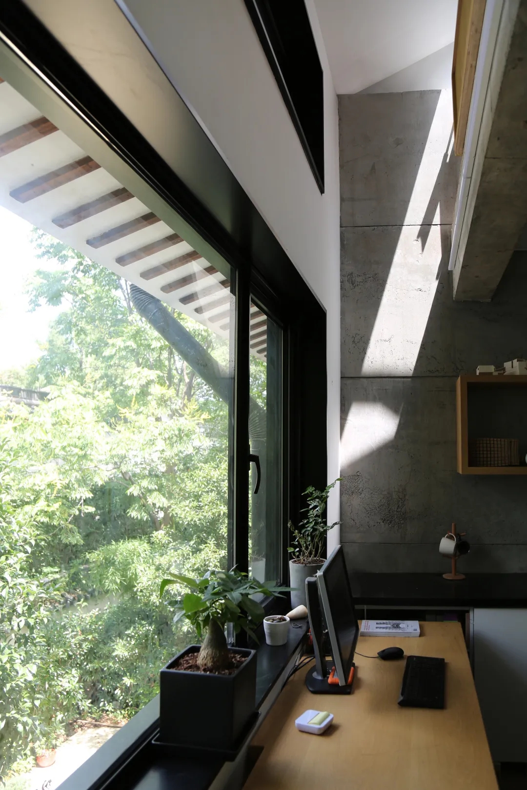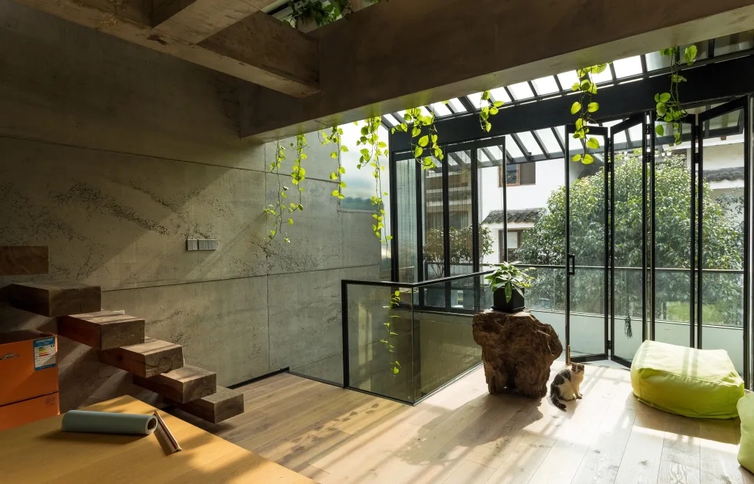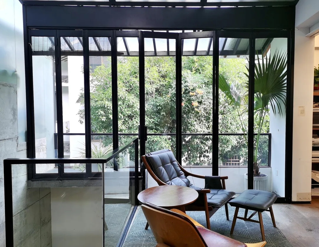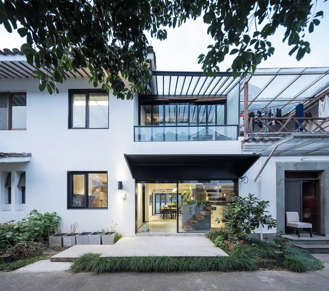 建筑外立面的每一扇窗户都被更换成了更宽更大,采光更好的铝合金定玻和开窗,一层入口整个改为通透的玻璃移门,二层南侧做了玻璃屋面,立面则改为了可以整体拉开的折叠玻璃门。三层在屋顶设置了三个天窗,使得原来消极阴暗的三楼成了明亮舒适的空间。