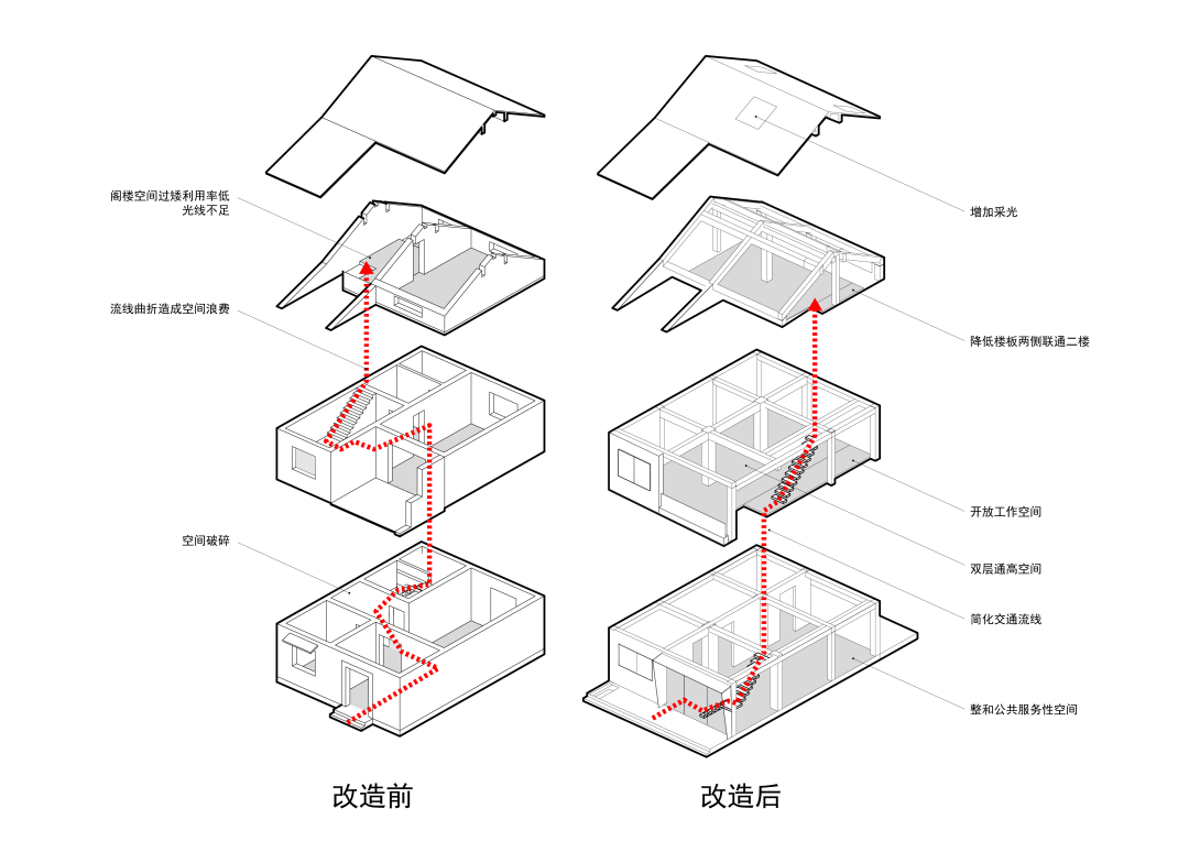 建筑改造之后,空间氛围由原来的昏暗闭塞变成开敞明亮,既营造了高效的工作氛围,又让人感到放松舒适。设计以一种不加任何修饰的方式展开,一切思考和决定,都只是服从功能,结构,空间,光线,让各个建筑元素和谐统一,以最纯粹与优雅的方式呈现其自身的美,这也是我们工作室的工作态度与设计哲学:无为而为,将建筑与空间最本真的状态展现出来,然后让生活将其填满。