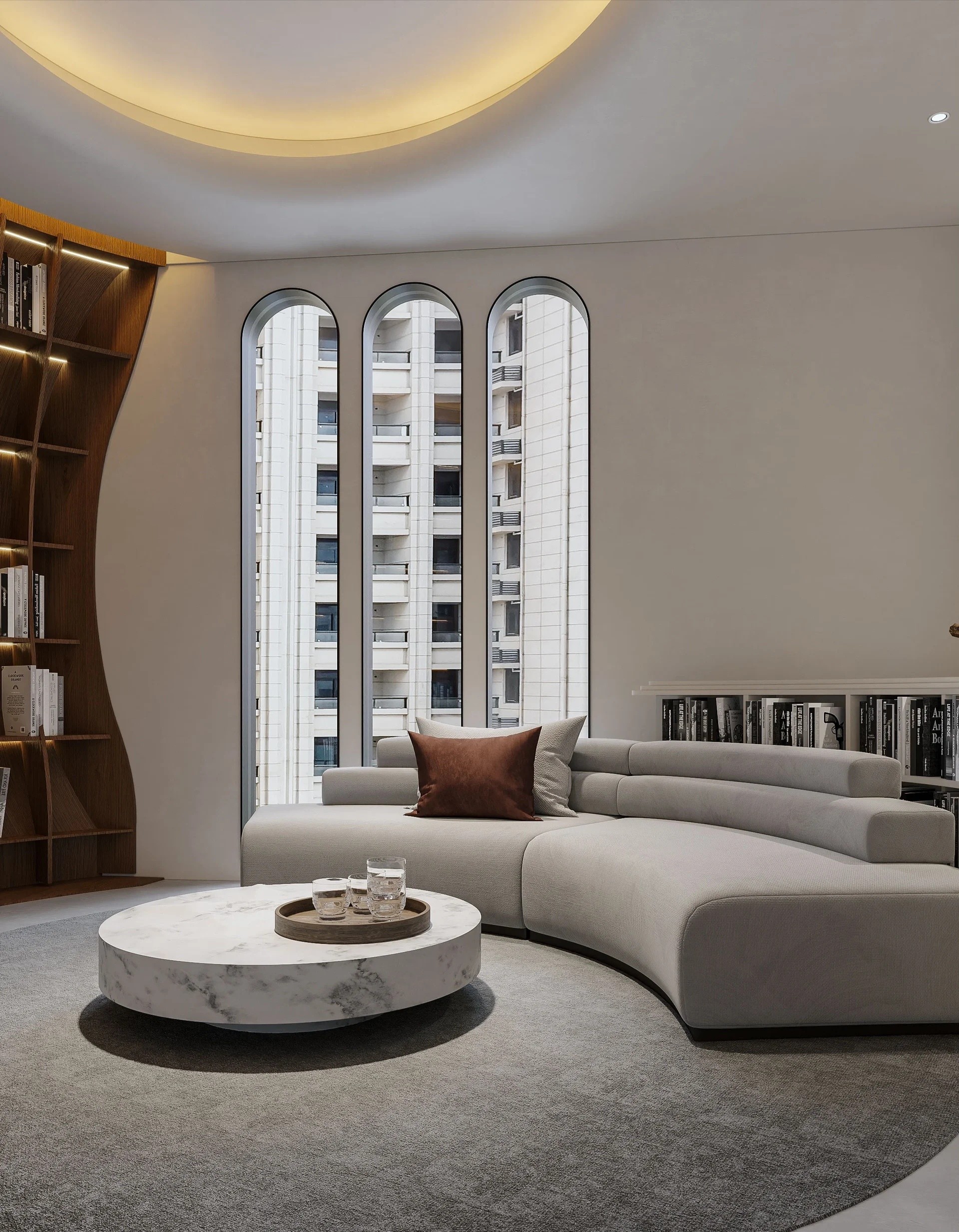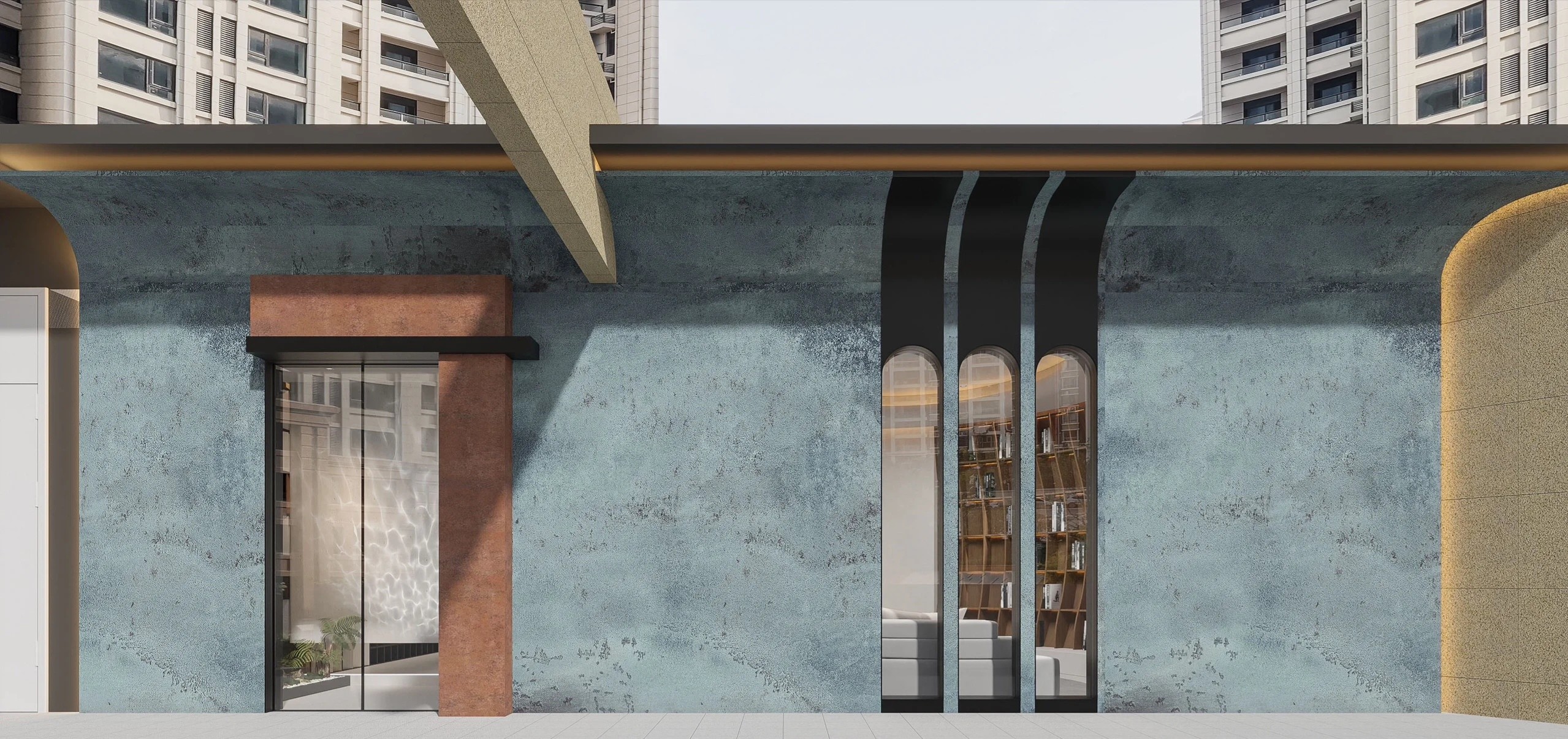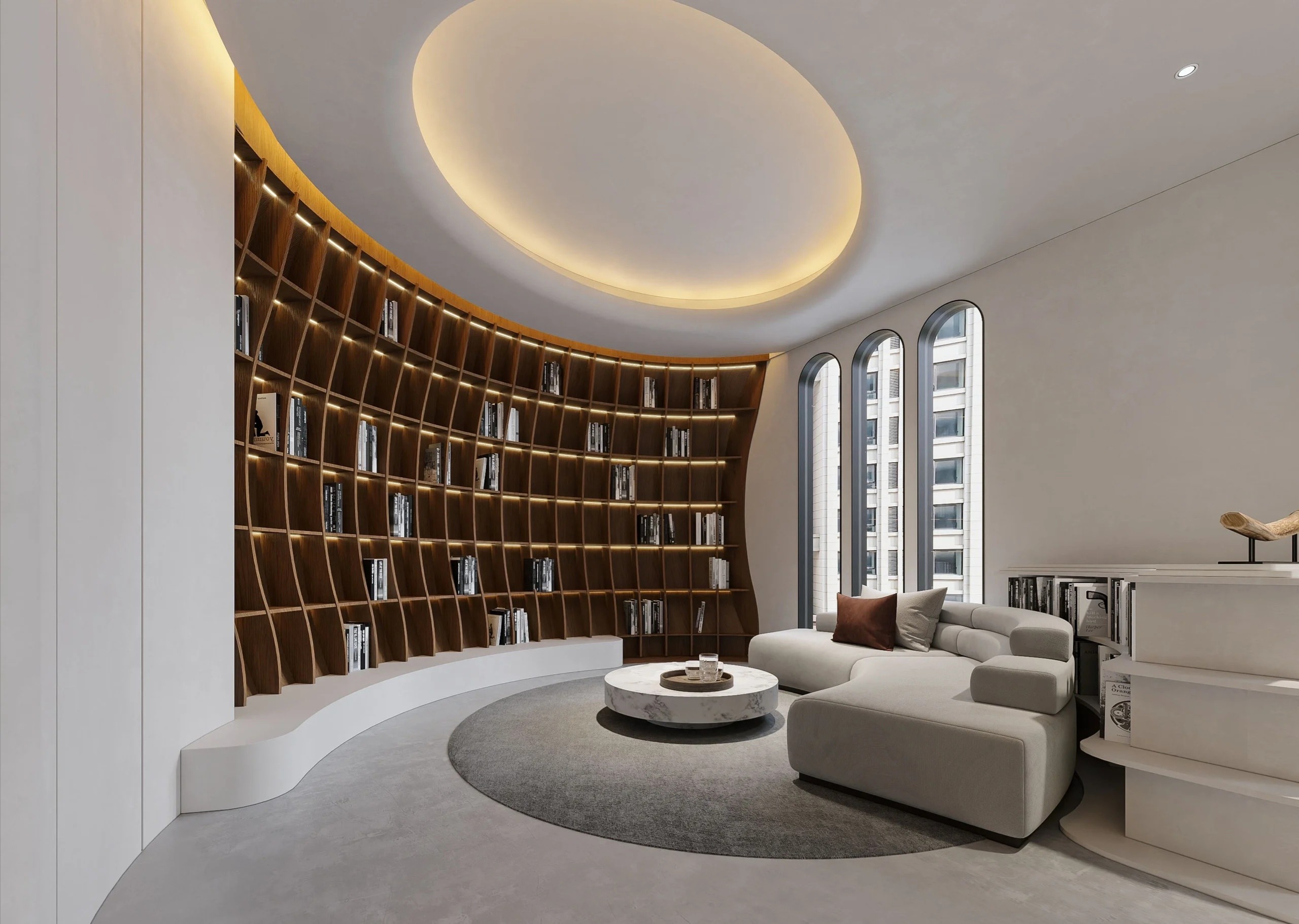 教室内部延续了弧墙的运用,两堵功能墙与天花相连,剖面上形成一个环抱状的围合。教室背面的书柜形式也充分考虑到儿童的尺度,底部的小空间提供给孩子们存放个人物品。