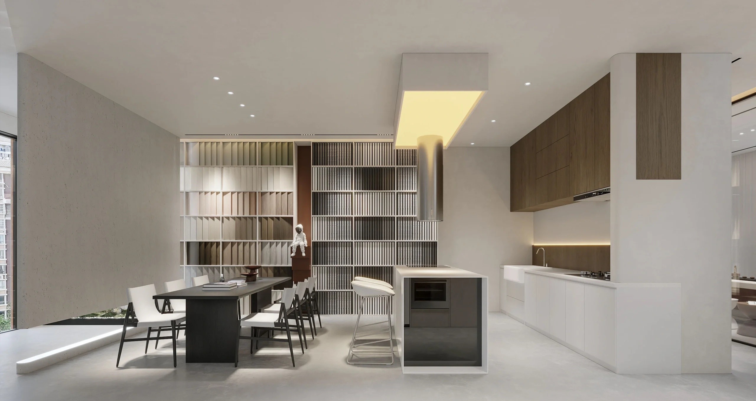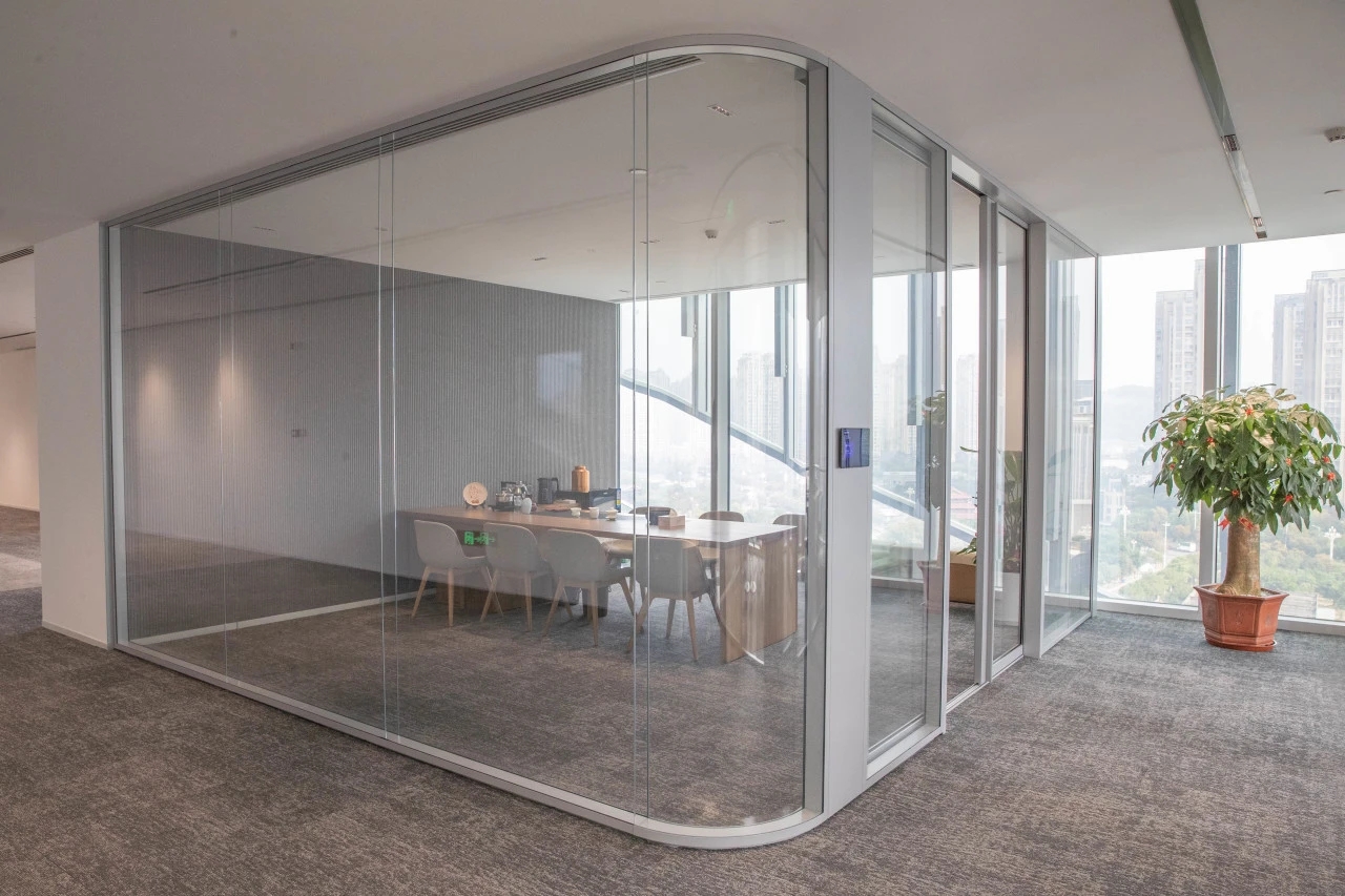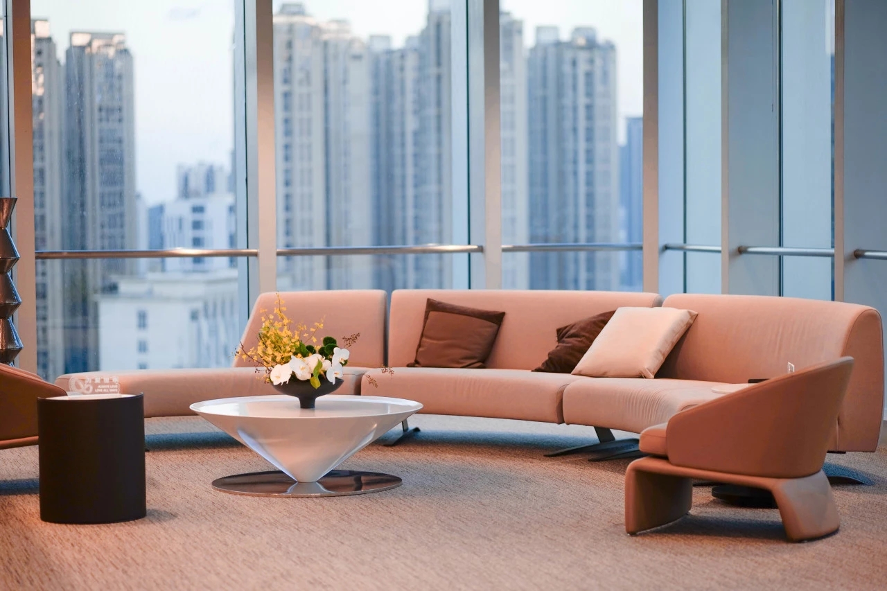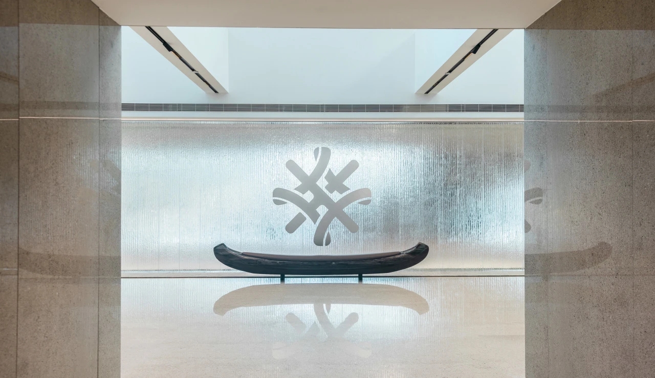 在前厅的改造中,我们与业主一直决定“舒适至上”,很浪费的将前厅扩大,将其改造成一个融合了接待、洽谈、展示、等候的共享空间。前厅是一个森林庇护所,三片模拟树枝形态的圆弧墙体延伸至天花板,原木提供温暖的底色。