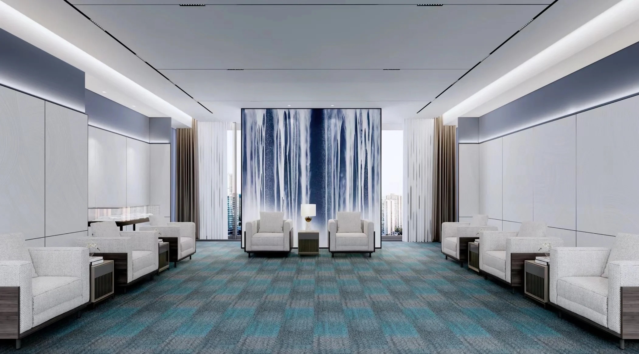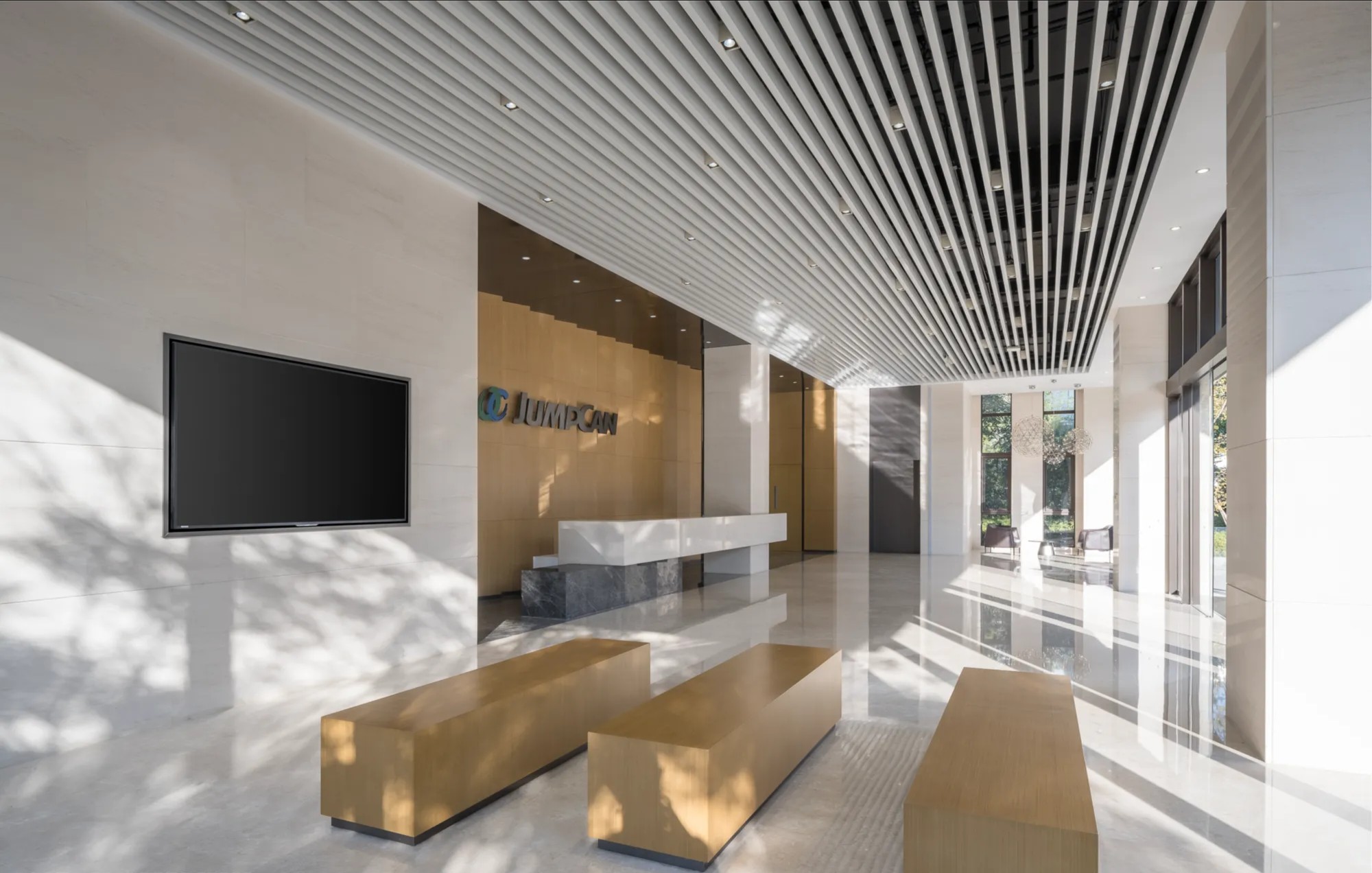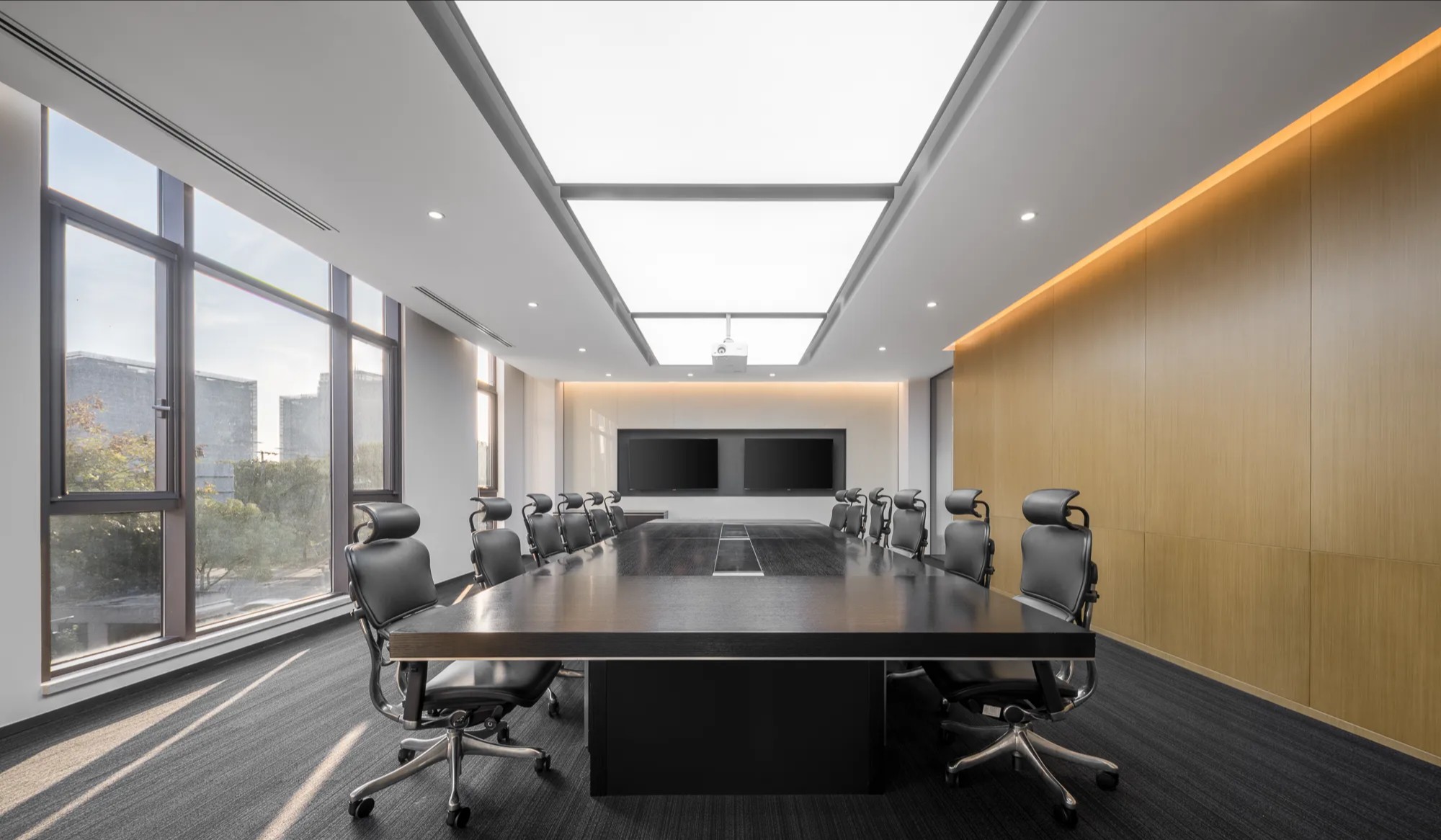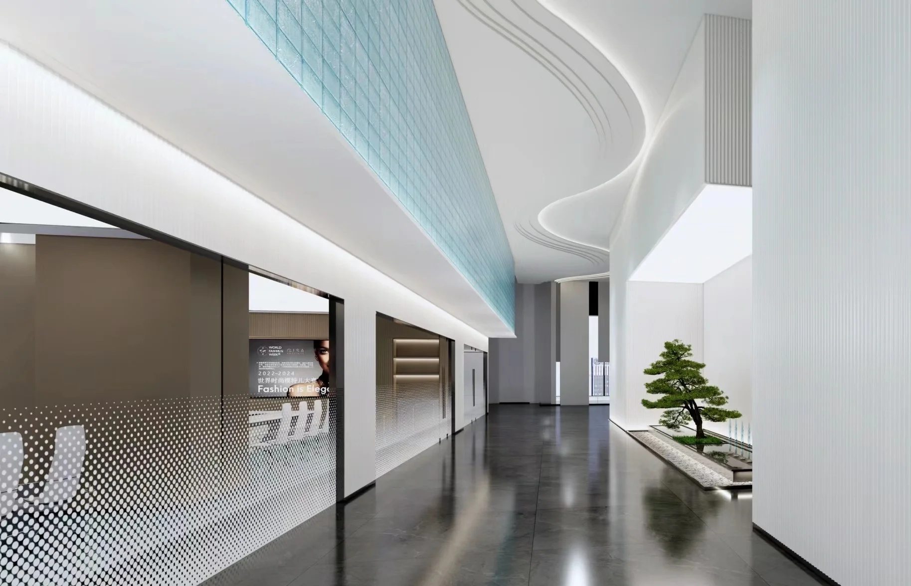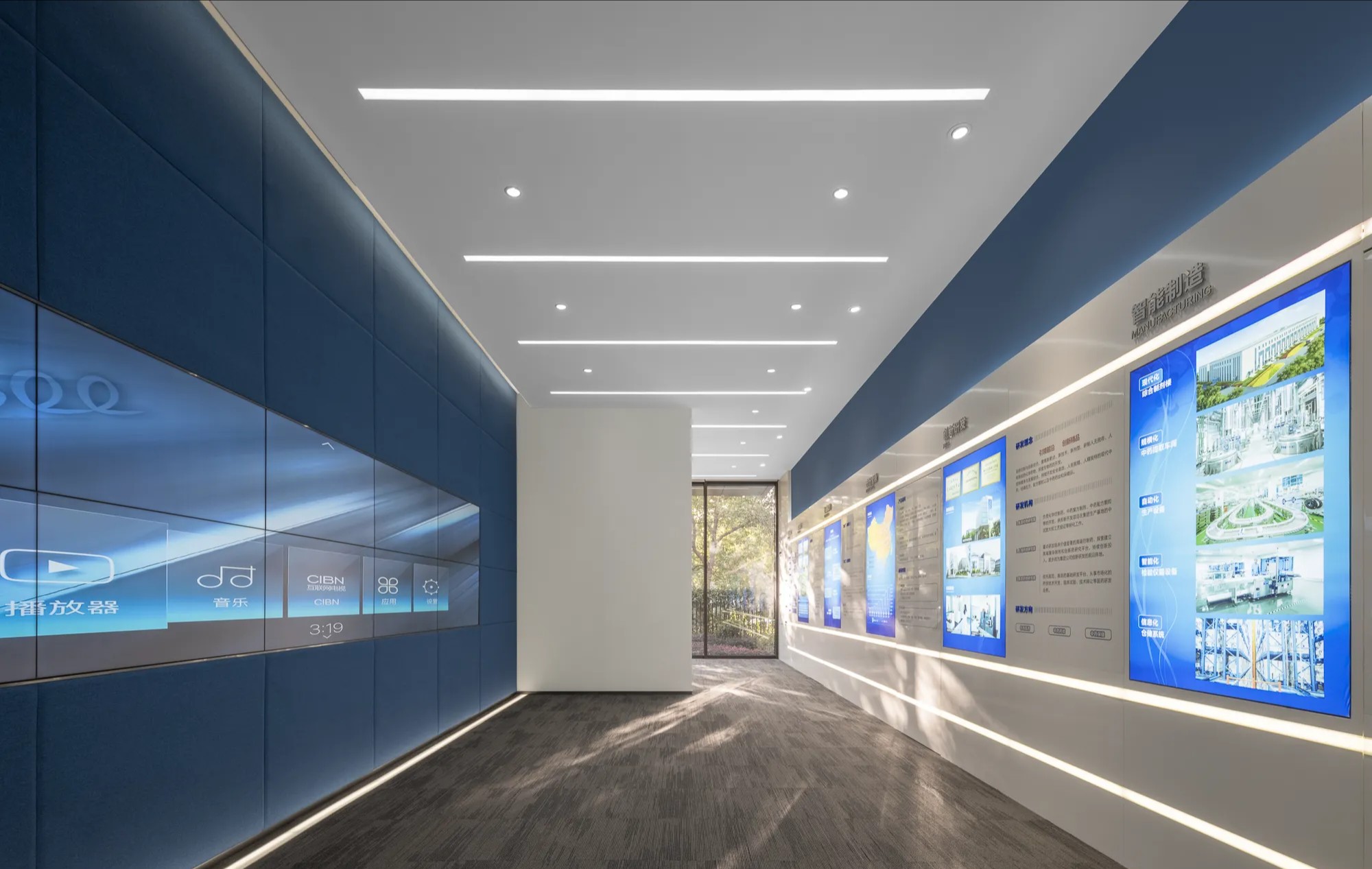 灯带沿着线性观赏路径,带领访客一览企业技术发展与战略规划,深入品牌故事内核。墙面以企业标志色为主,内嵌智慧大屏兼具实用功能与优雅审美,提升此空间的交互性和渗透性。