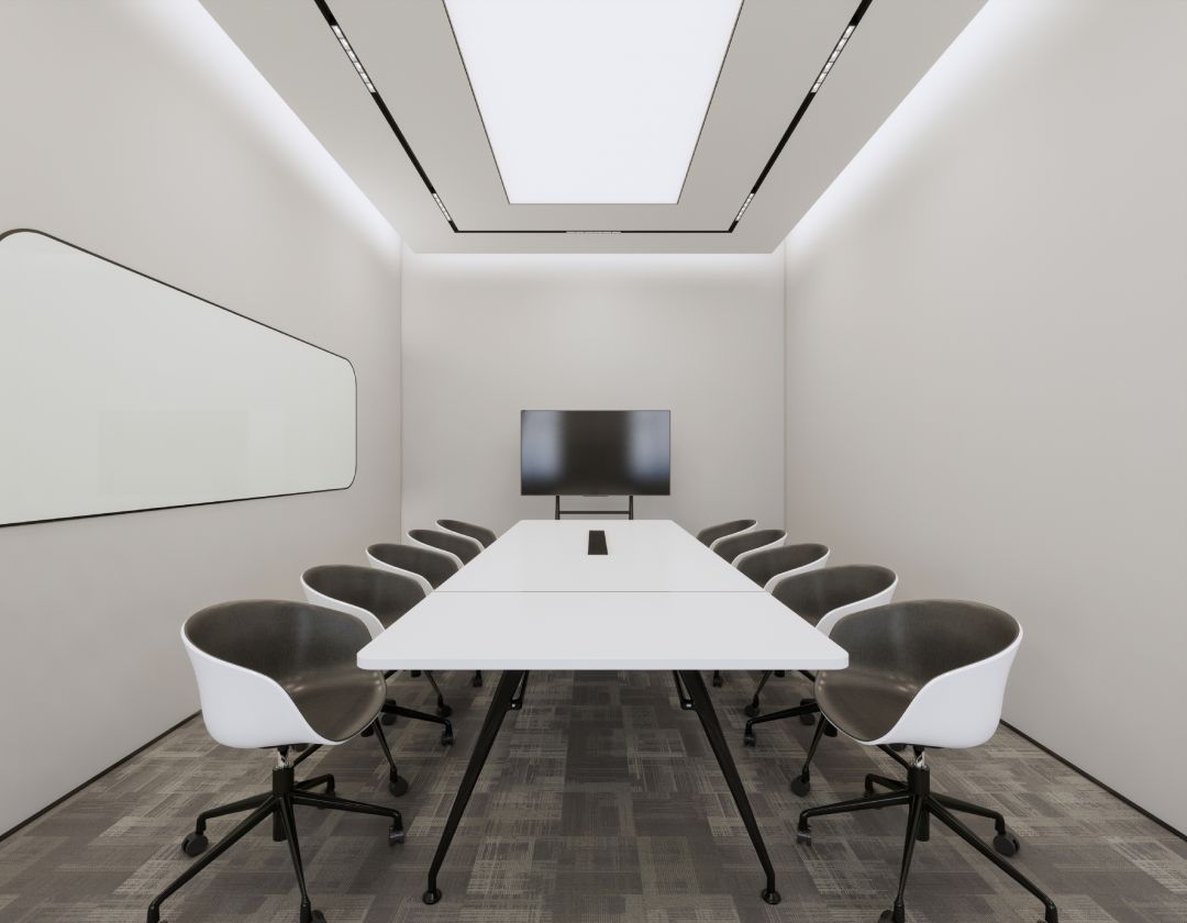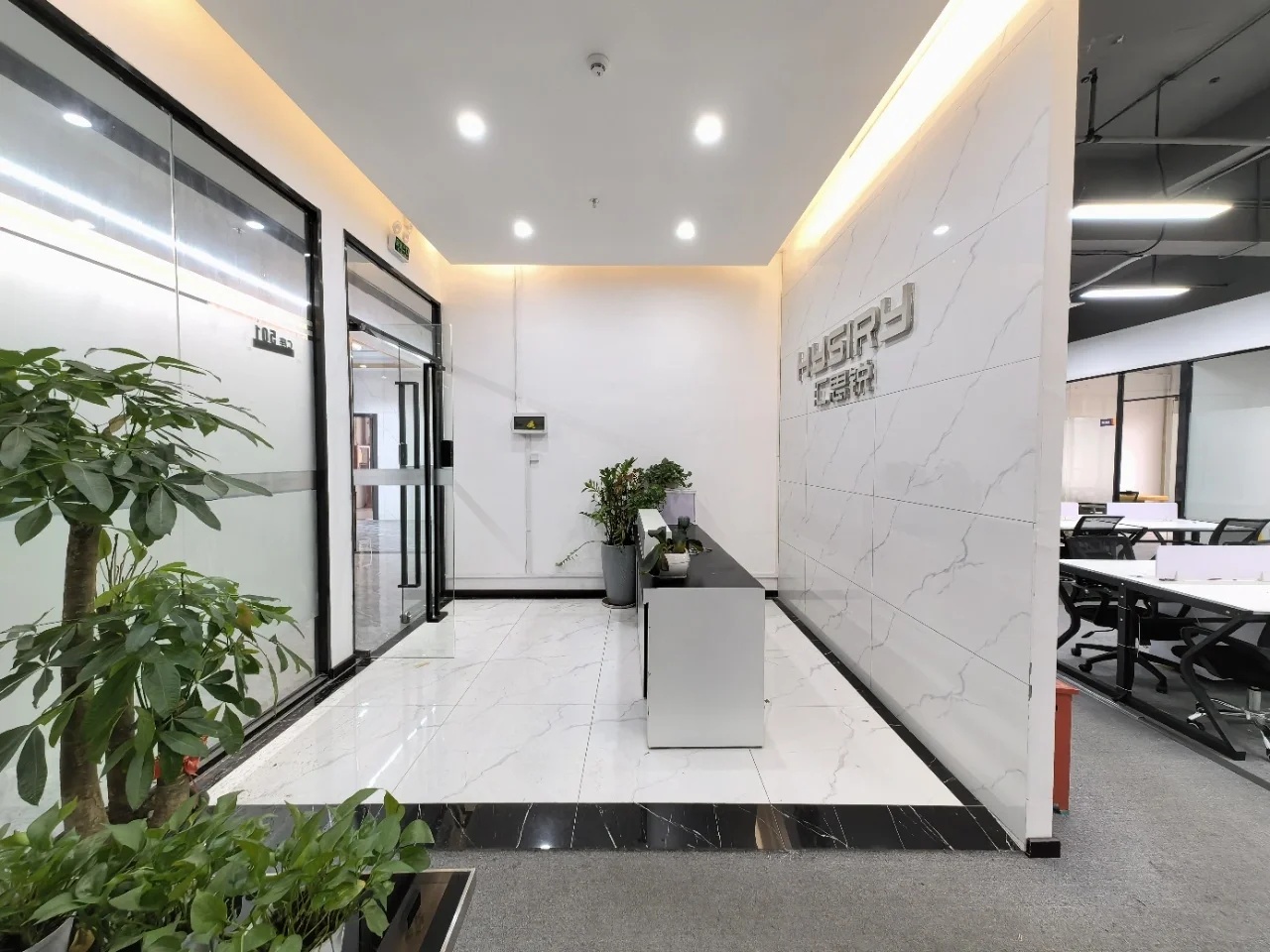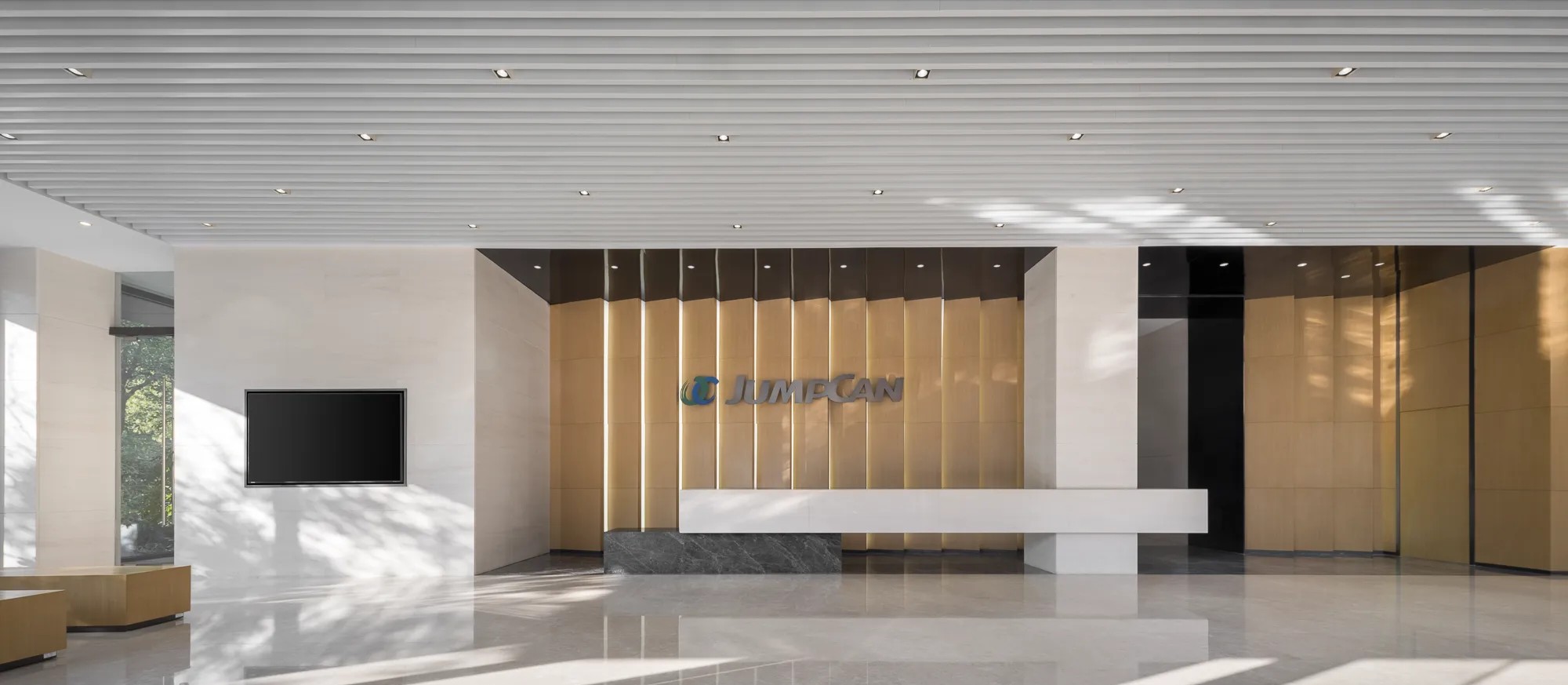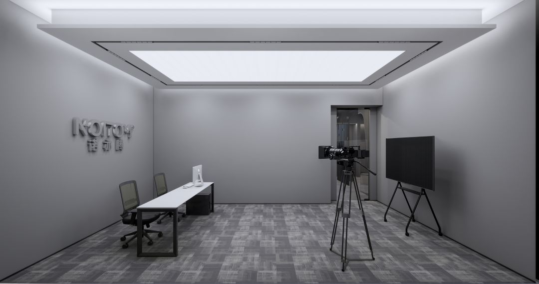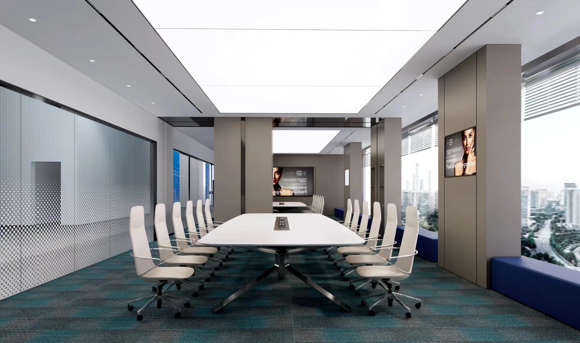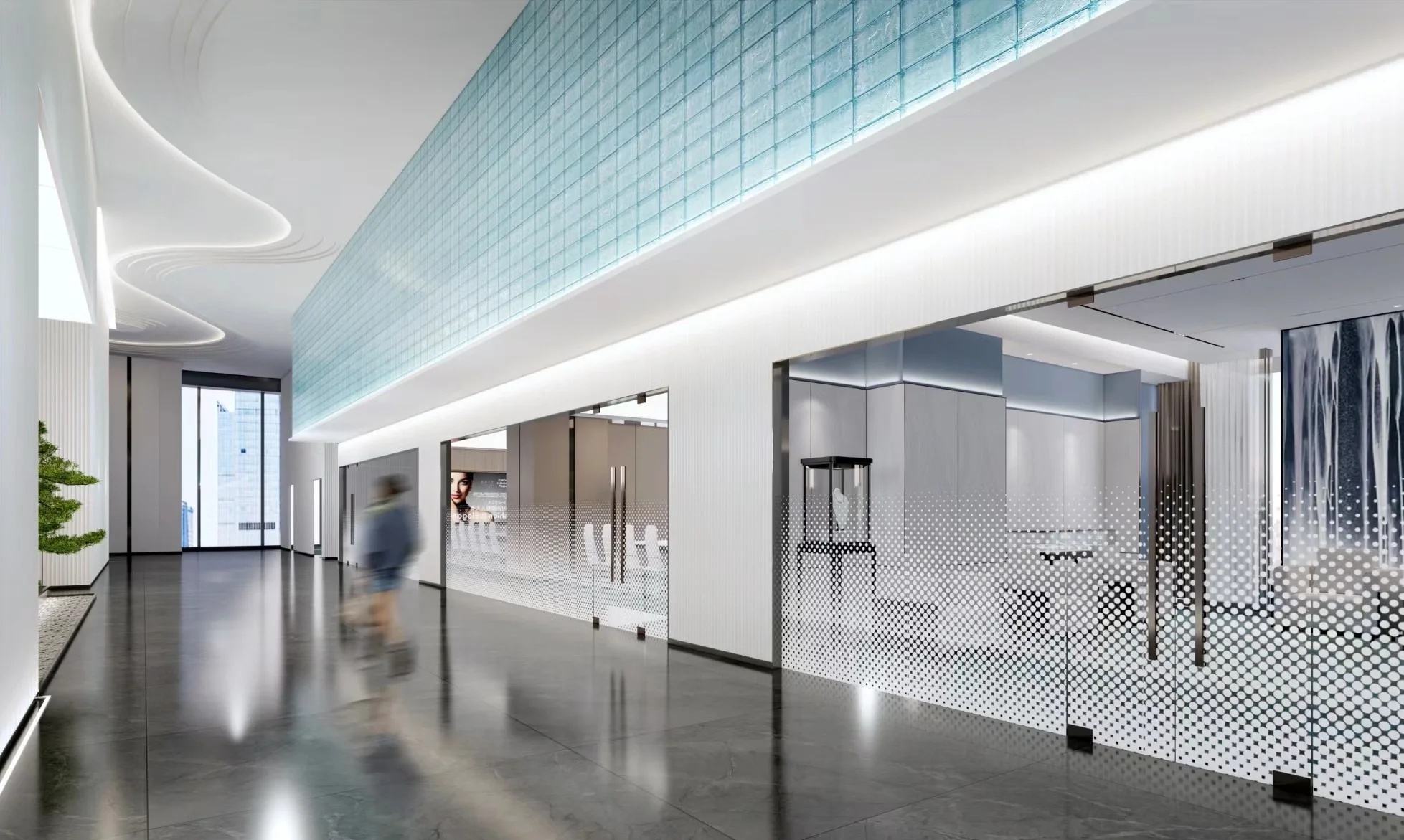 灯带沿着线性观赏路径,带领访客一览企业技术发展与战略规划,深入品牌故事内核。墙面以企业标志色为主,内嵌智慧大屏兼具实用功能与优雅审美,提升此空间的交互性和渗透性。
