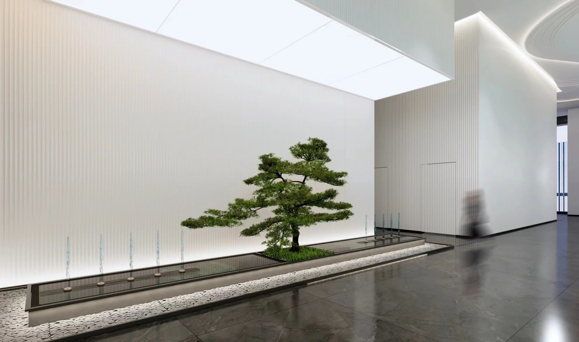 目之所及,墙面木色格栅的设计与地面大理石相互辉映,石材与木质的结合更显雅致。灯带巧嵌格栅中,前台的设计独具匠心,悬空的效果将繁复化为简洁,空间的通透干练得以充分展现。