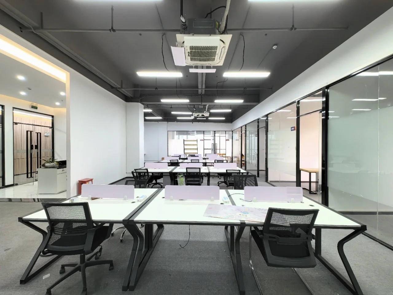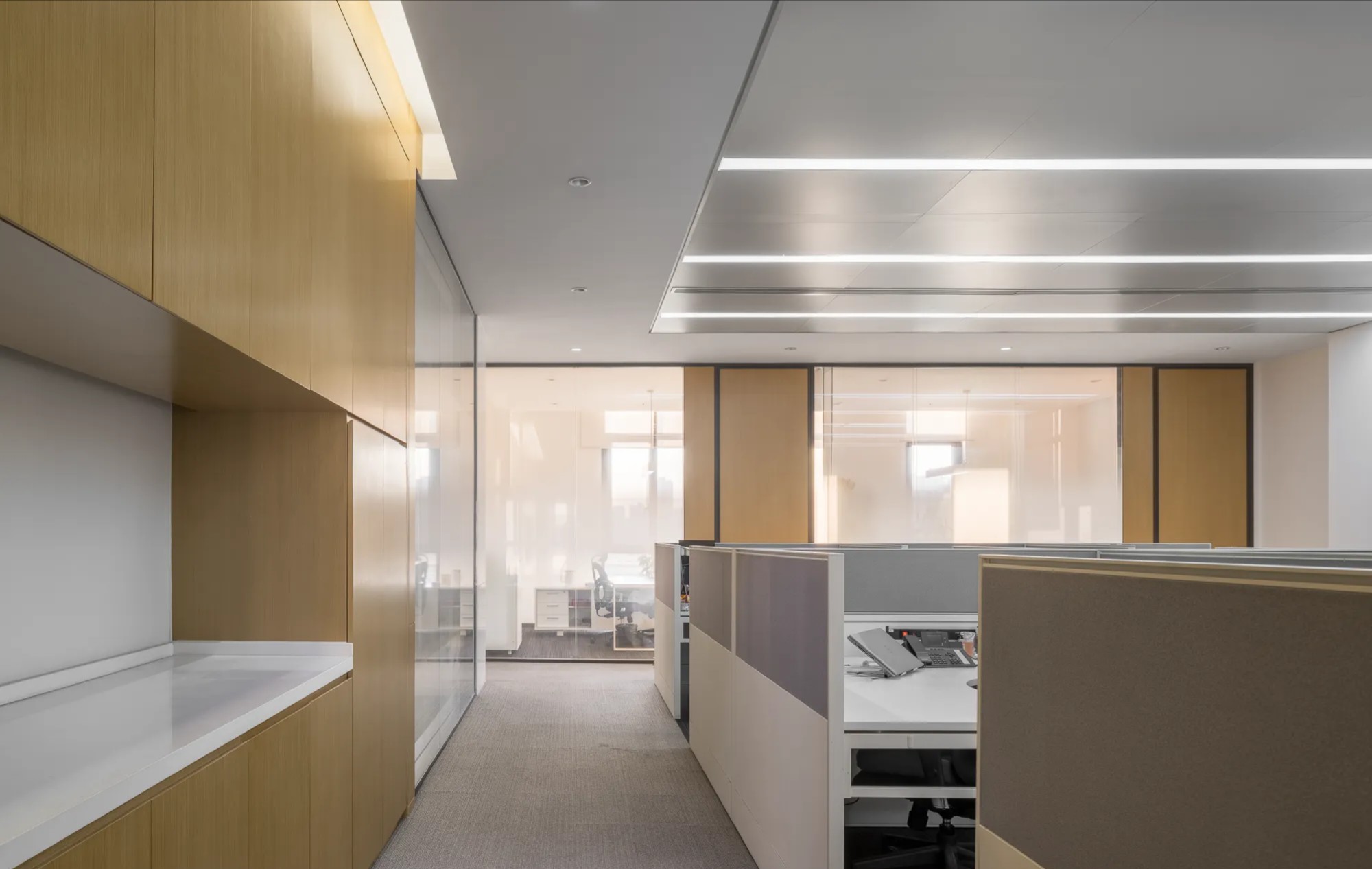 开放办公区以木质饰面为主,展现出规整干练的质感。透明的玻璃隔断延展视野,为员工提供了清晰有序的动线,同时营造出开放明亮的氛围。整体布局简洁精致,为员工创造了舒适高效的工作环境。