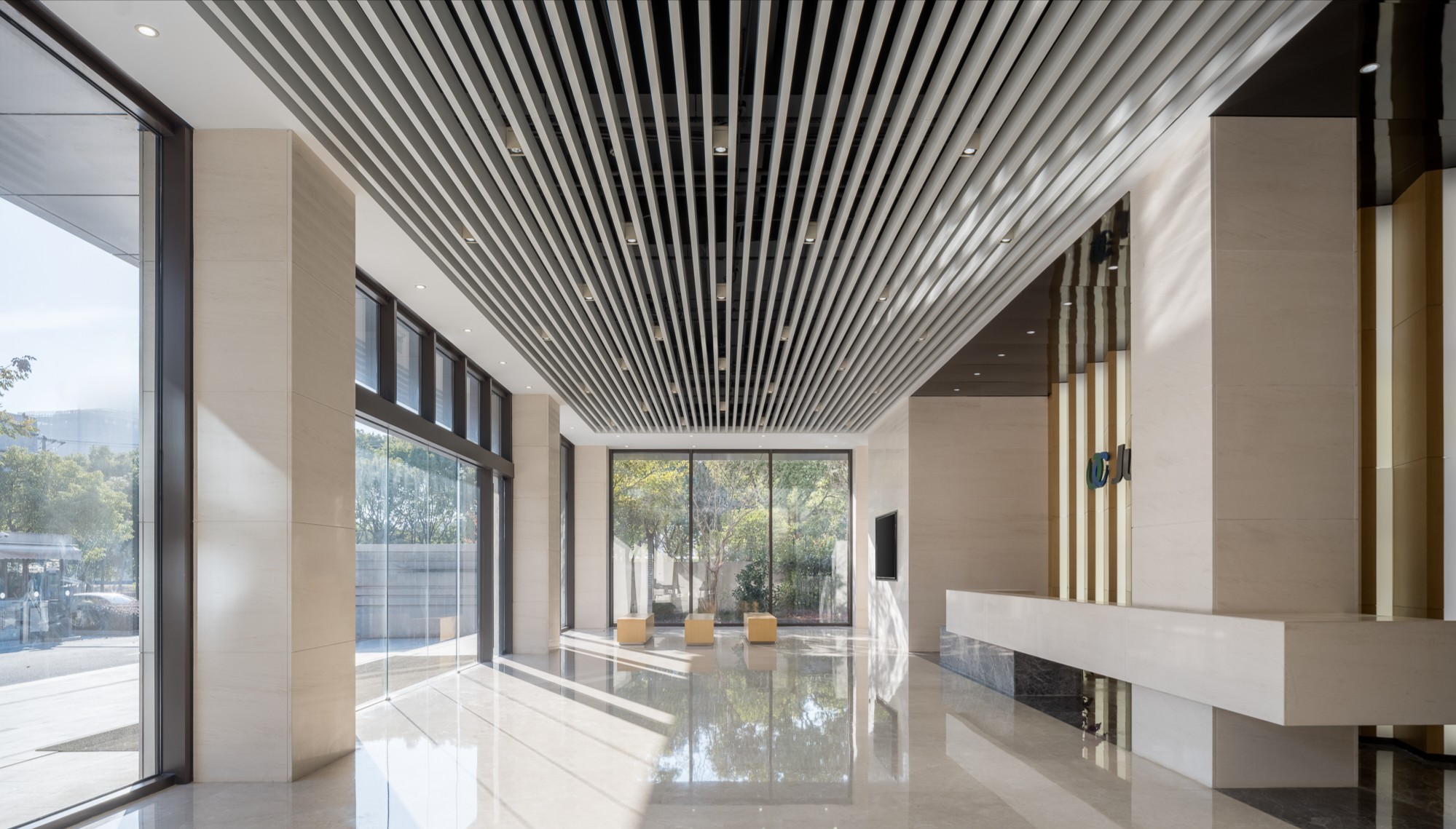 顶面浅色格栅一体铺陈,与立面呼应,通透干练,又具开放性和流动性,探索空间的叠加层次感。
