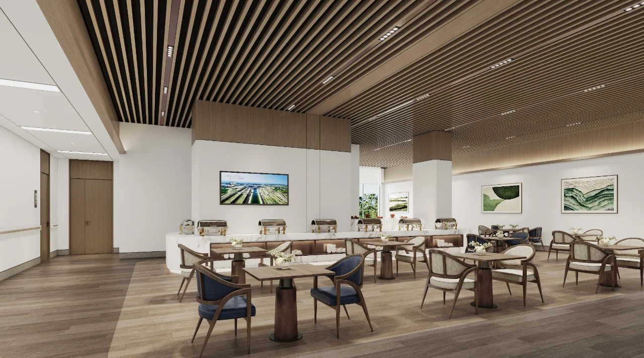 用水波纹不锈钢虚化界面,弱化挑空带来的空旷感,在空间之中搭建空间,形成内空间层次关系。既解决了物理属性,又可以给人带来安全感,同时增加绿植连接空间层次,营造出空间花园的氛围。