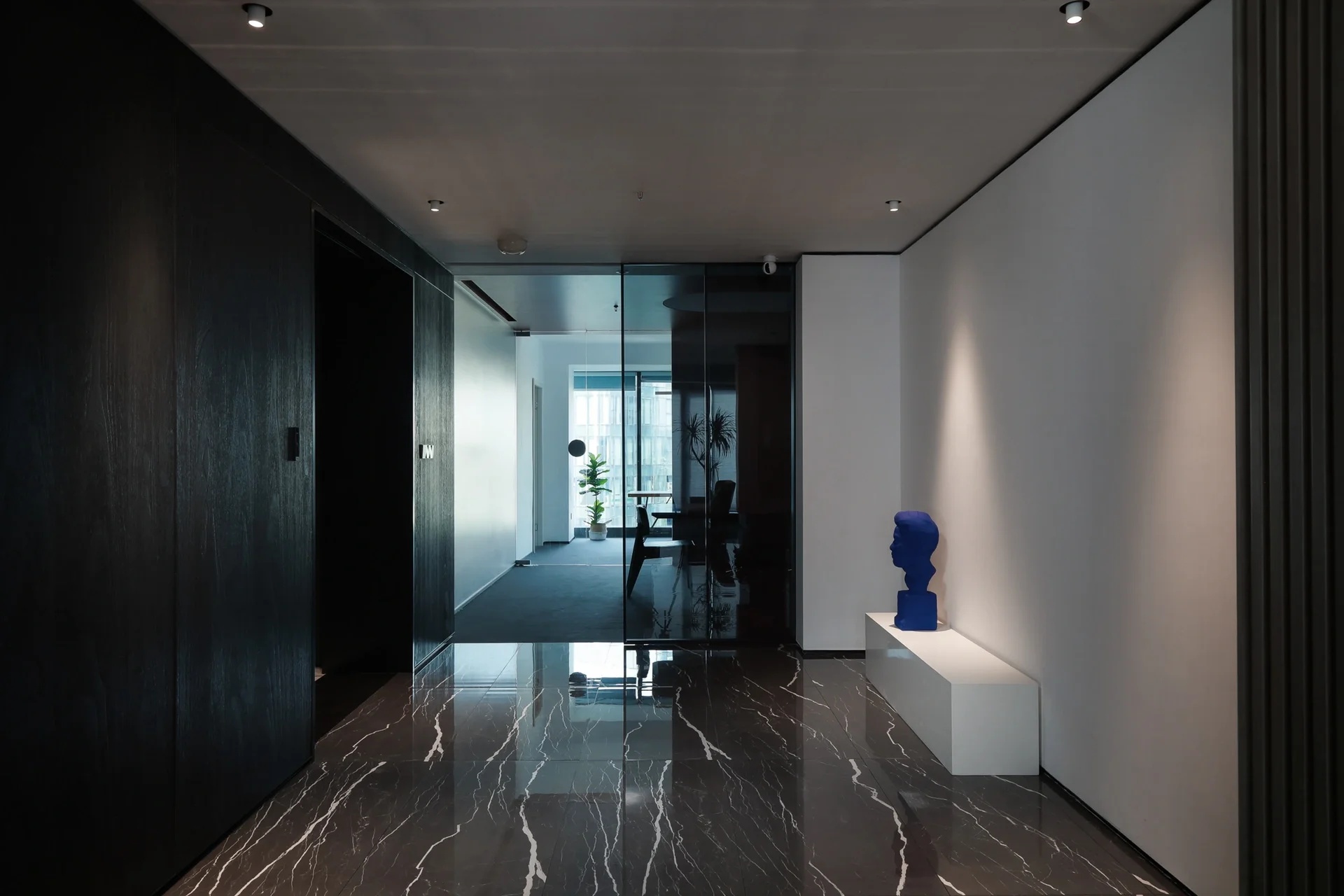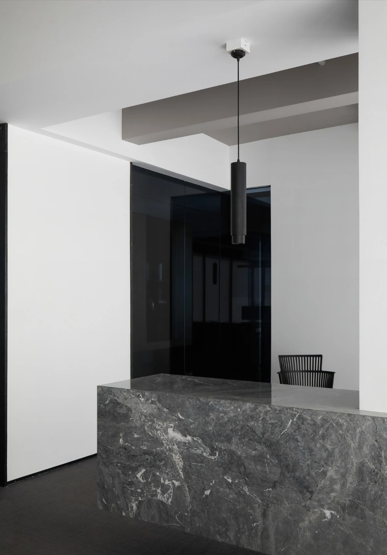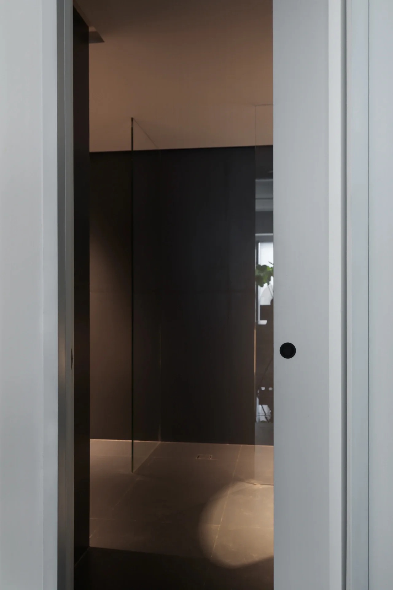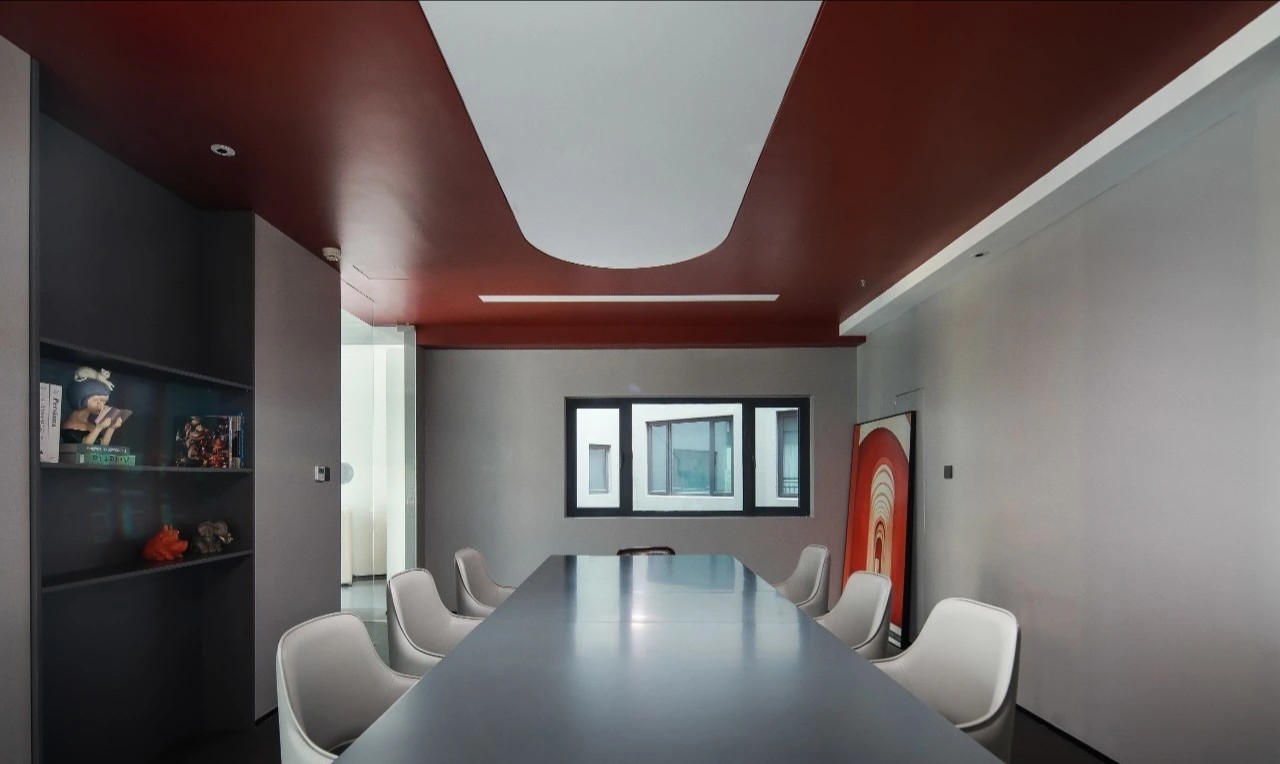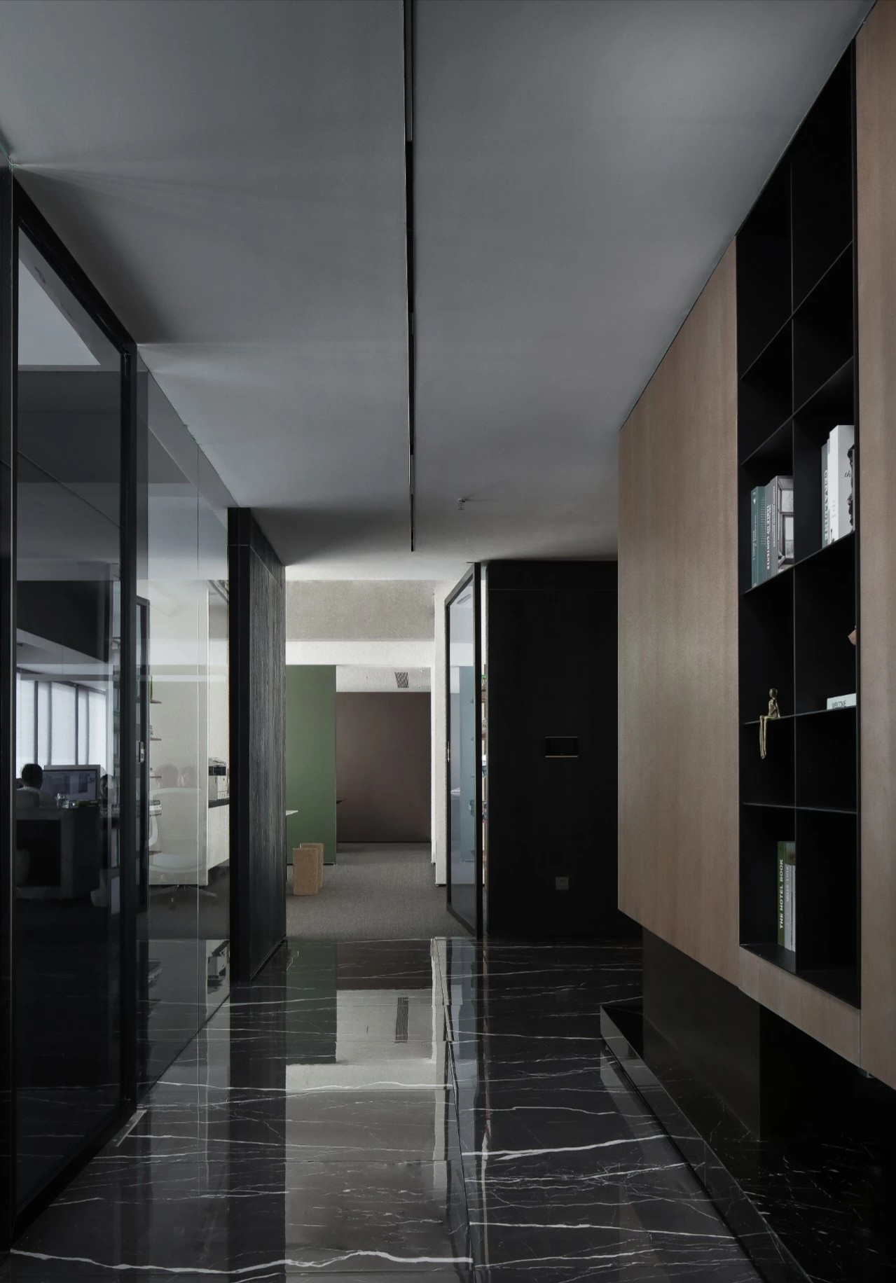 灰玻的中轴门半掩半映之间,饶有趣味,途经过此,灰波纹玻璃“笼中精灵”和会客室的森林感映衬出一幅“山重水复疑无路,柳暗花明又一村”的悠然画卷,尔后步入里间,跟随我们的步伐感受另一番场景。