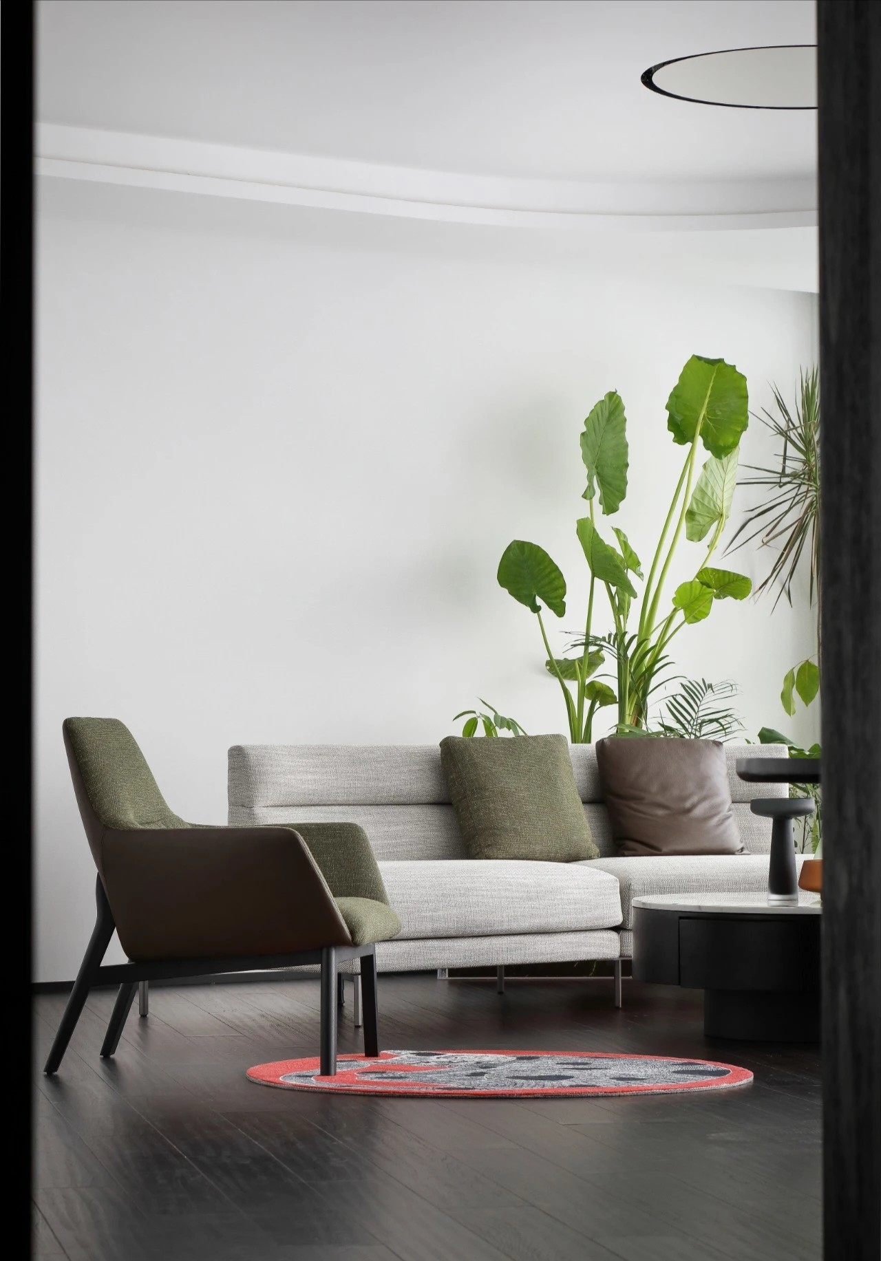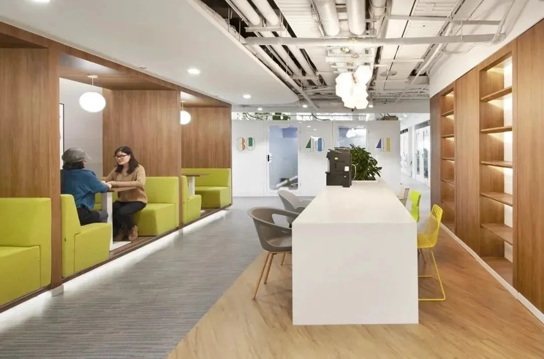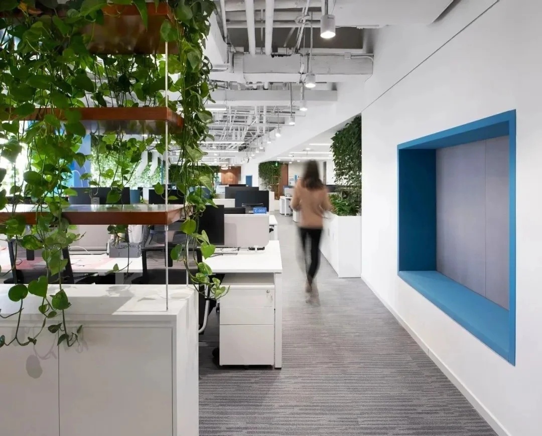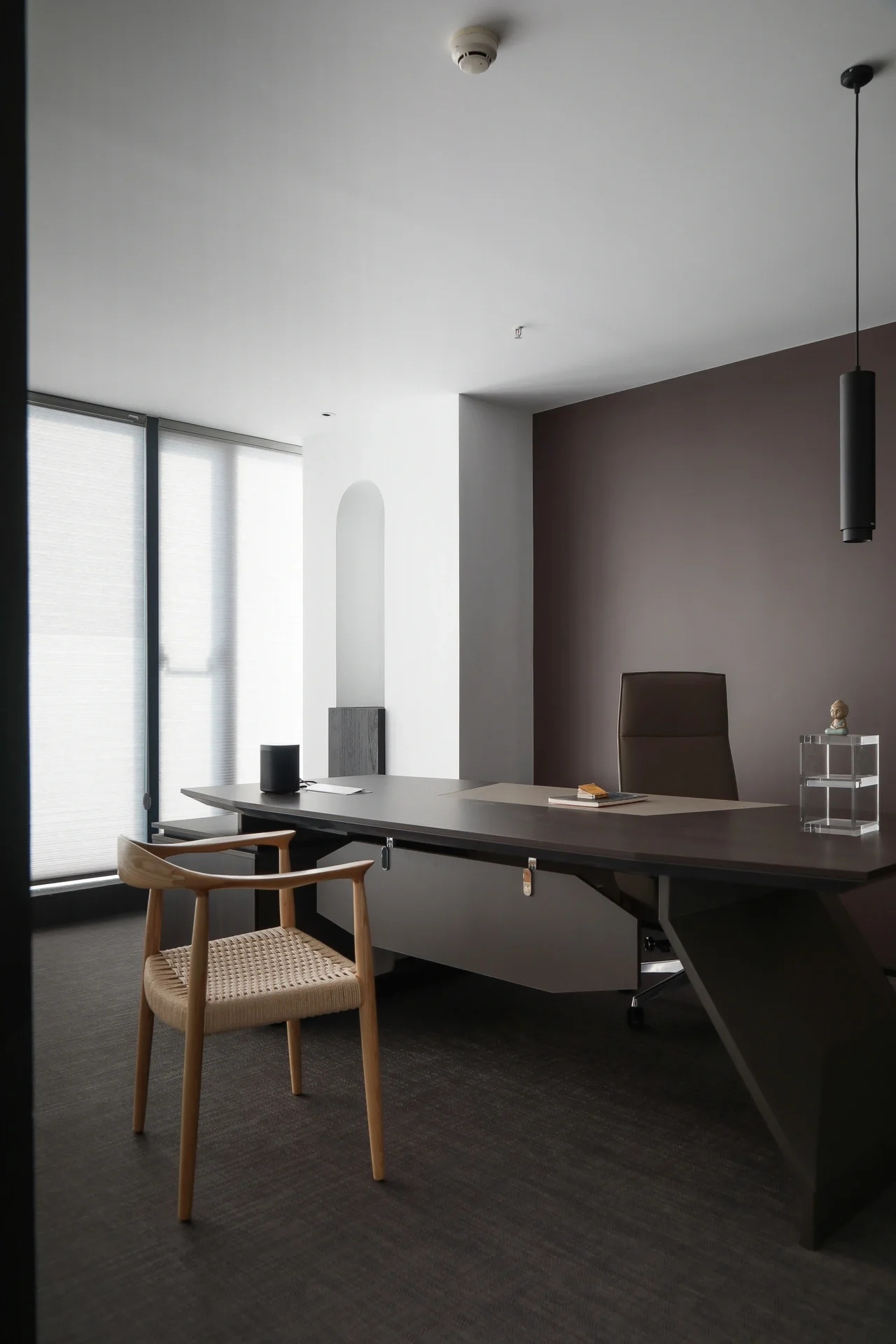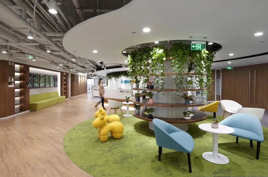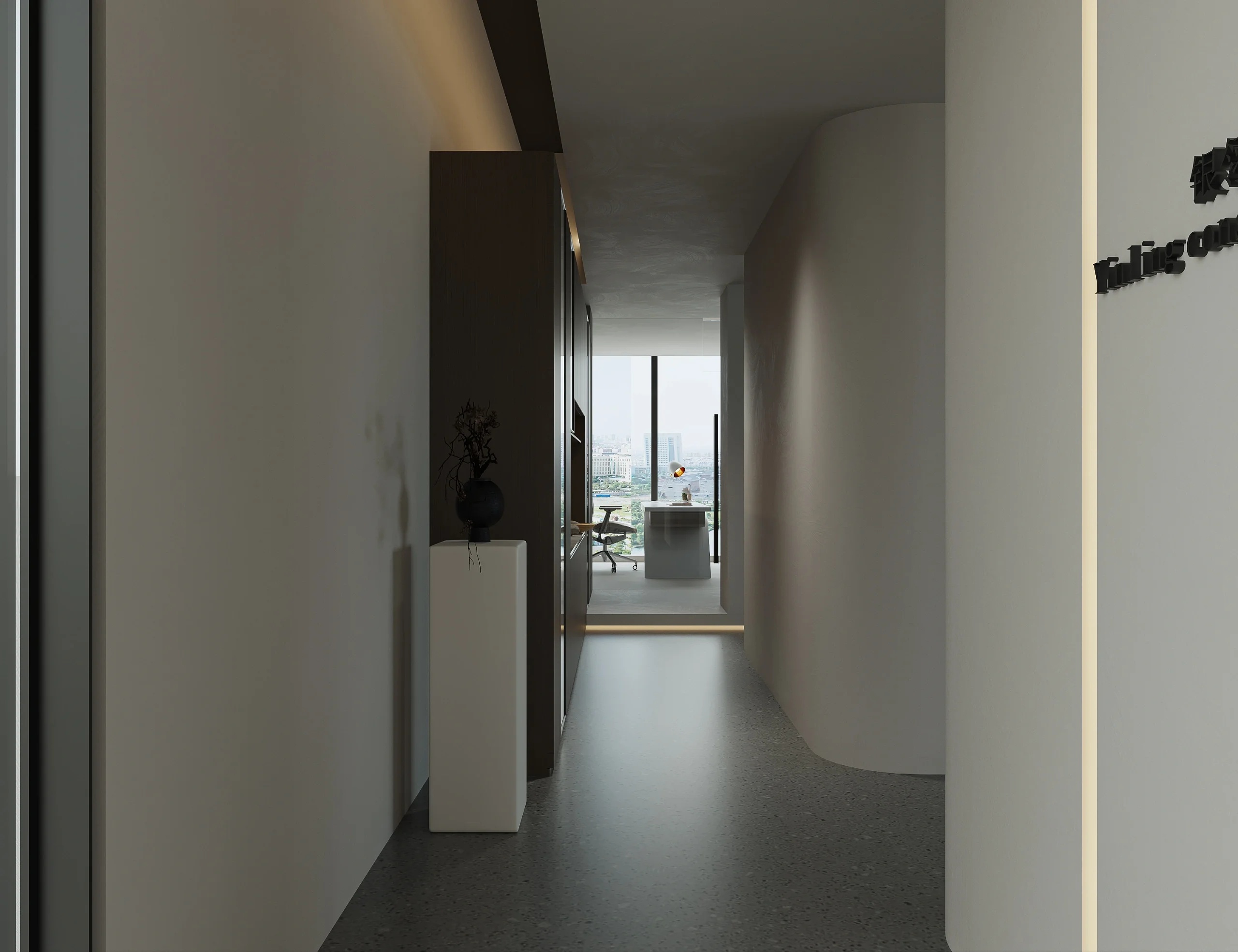 灰玻的中轴门半掩半映之间,饶有趣味,途经过此,灰波纹玻璃“笼中精灵”和会客室的森林感映衬出一幅“山重水复疑无路,柳暗花明又一村”的悠然画卷,尔后步入里间,跟随我们的步伐感受另一番场景。