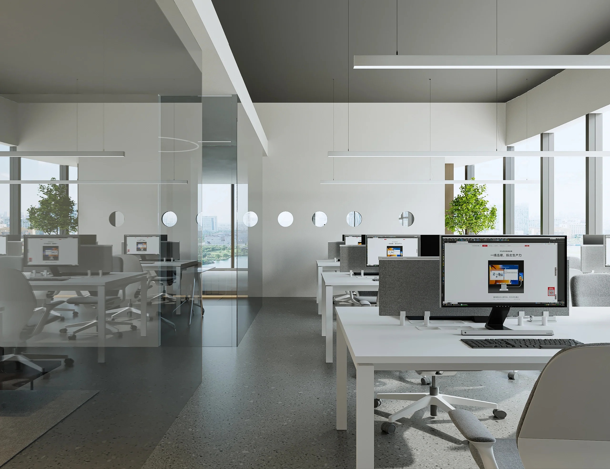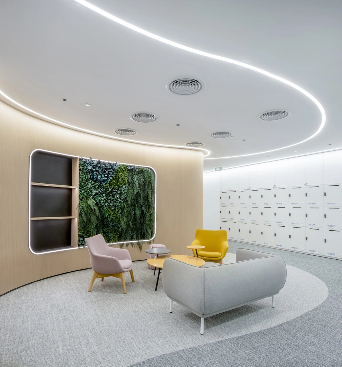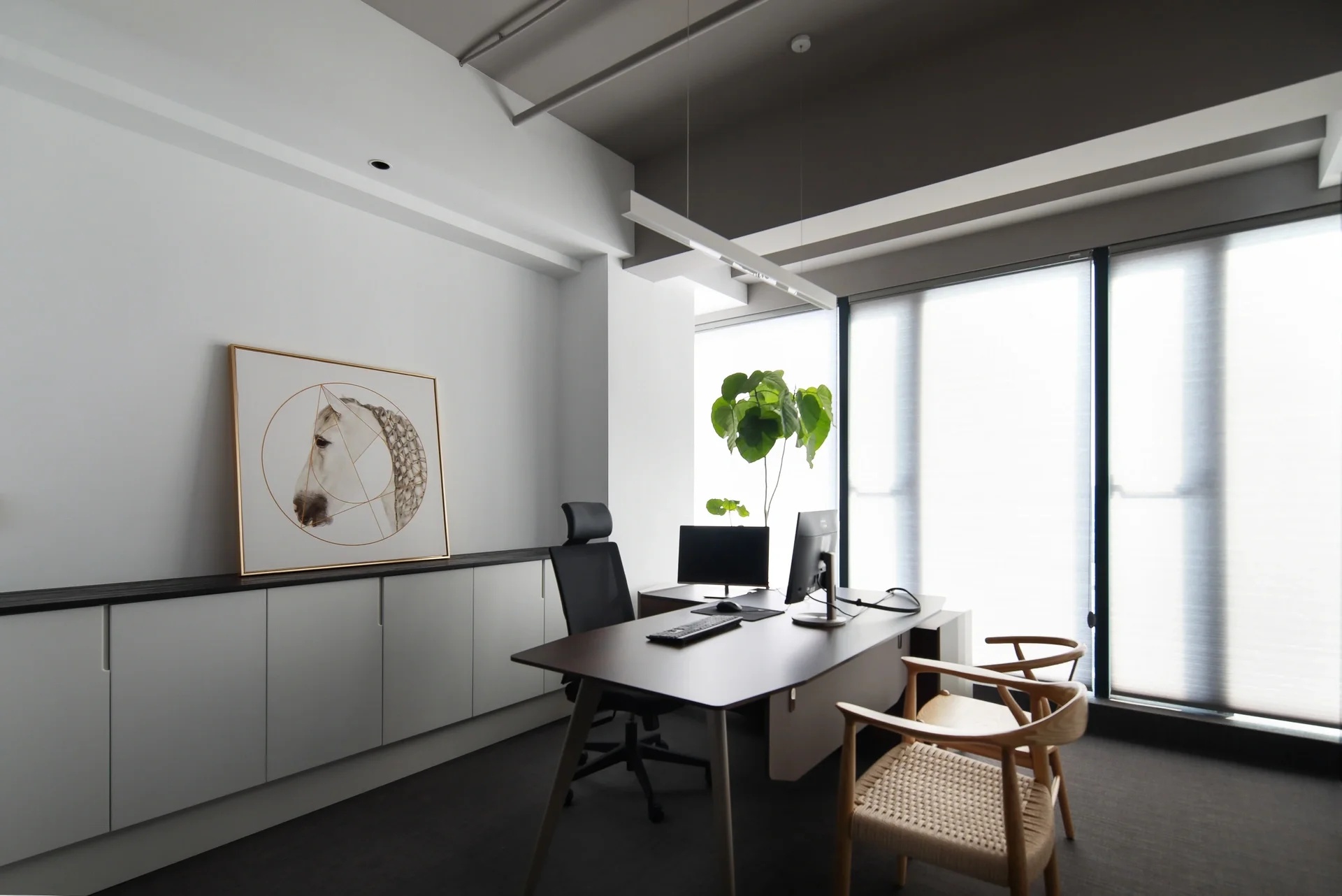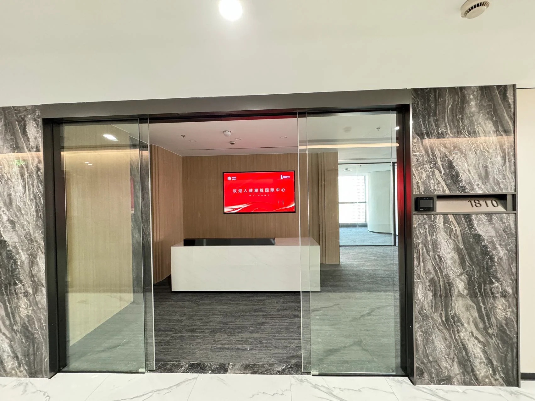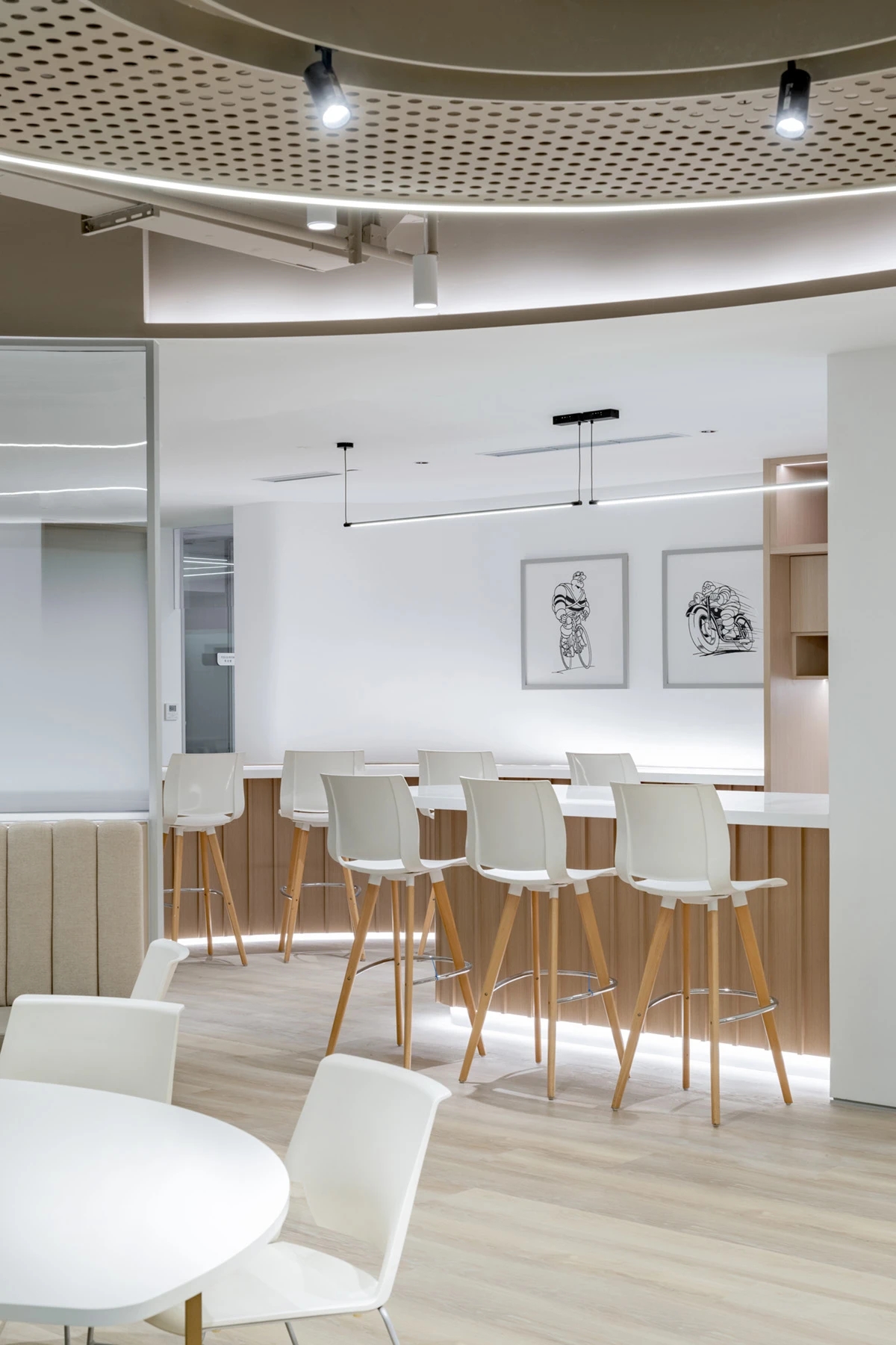 灰玻的中轴门半掩半映之间,饶有趣味,途经过此,灰波纹玻璃“笼中精灵”和会客室的森林感映衬出一幅“山重水复疑无路,柳暗花明又一村”的悠然画卷,尔后步入里间,跟随我们的步伐感受另一番场景。