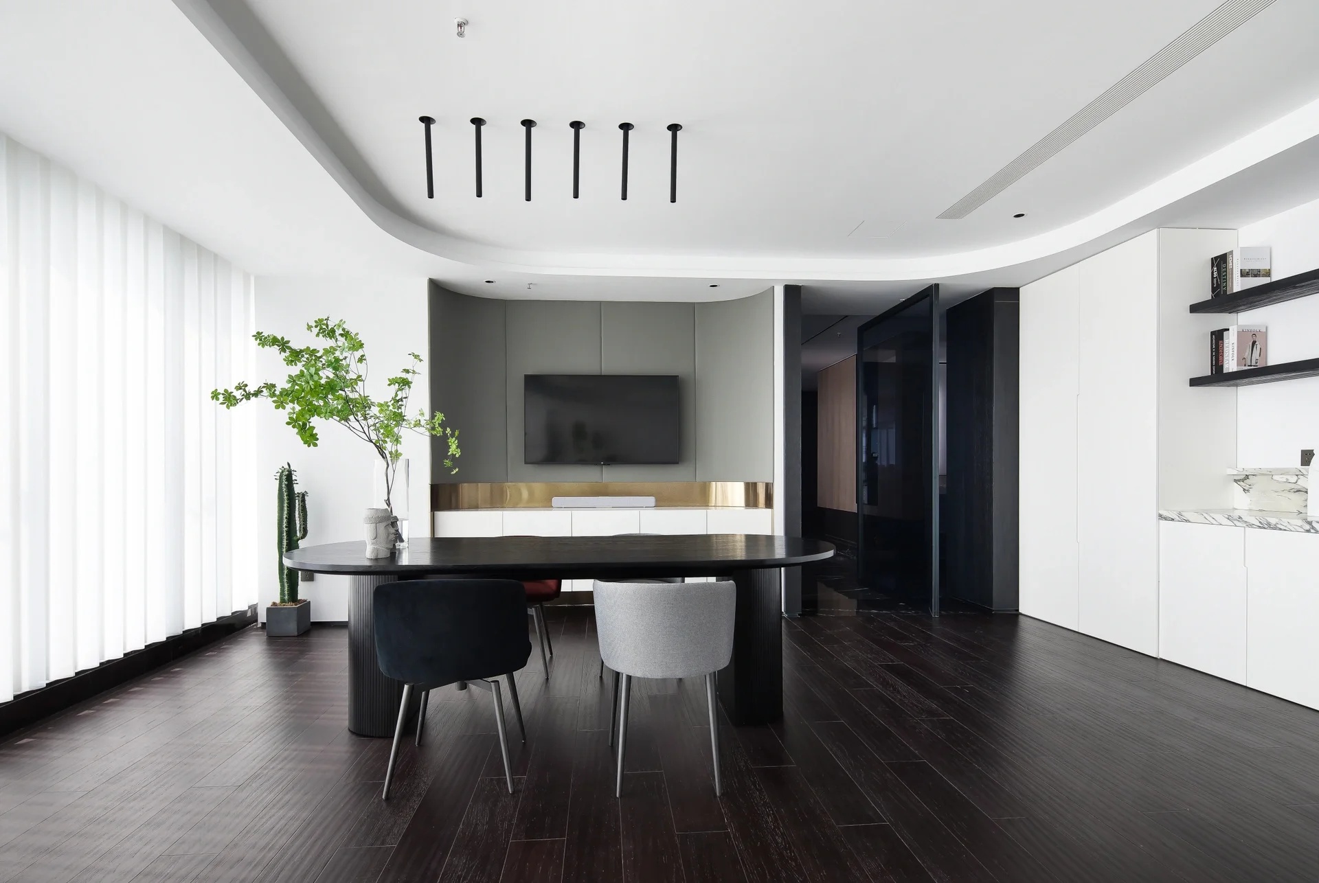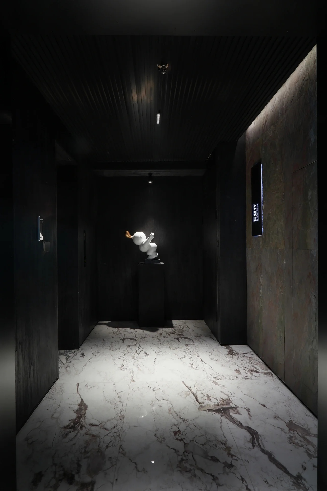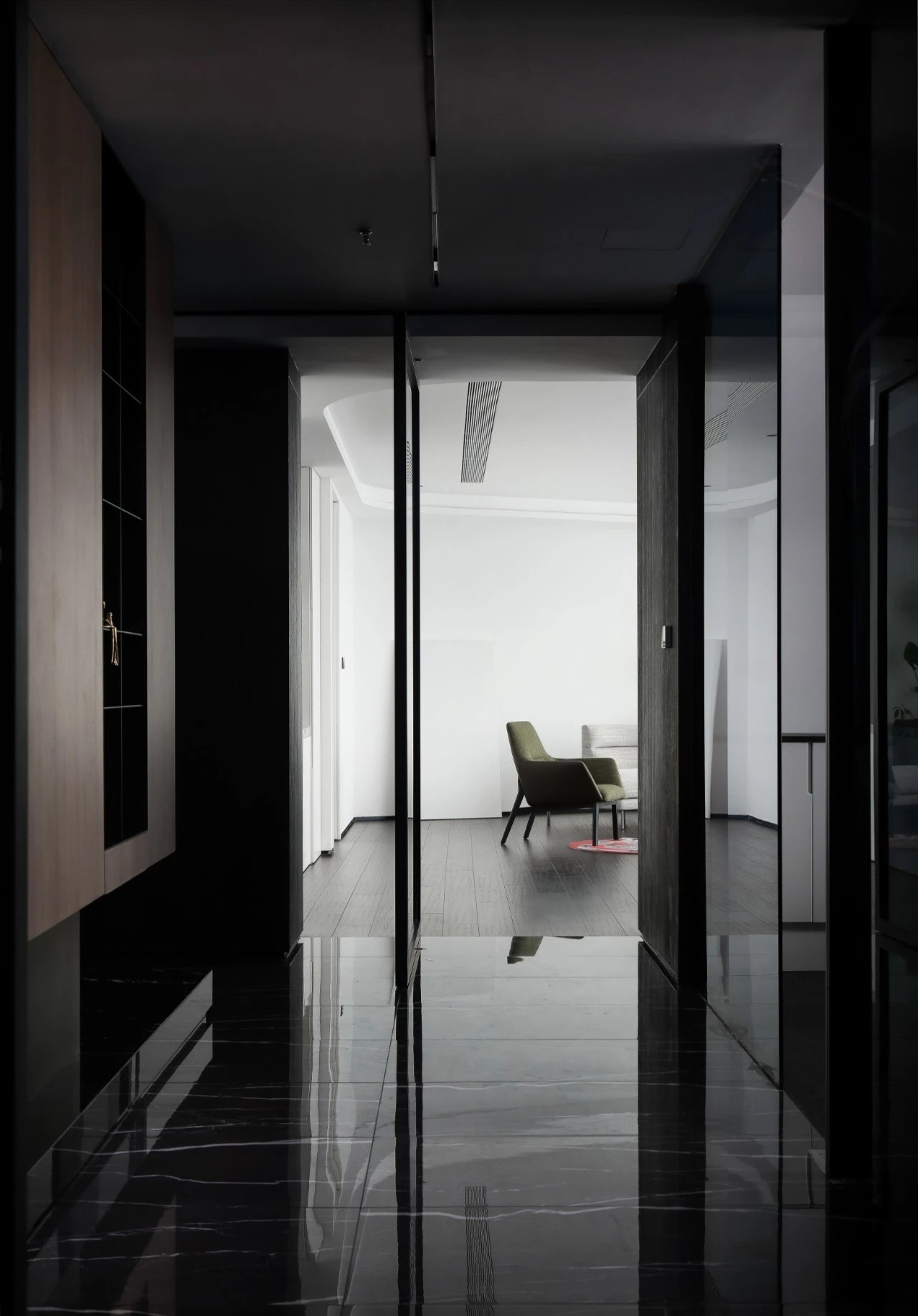 黑白分明的简洁利落,且兼顾品质的艺术性,进口处的前厅空间,奠定了整个设计的基调,精炼的线条将整个聚焦让位于多种空间关系发生的可能,并最大限度上助力于艺术的表现张力。
